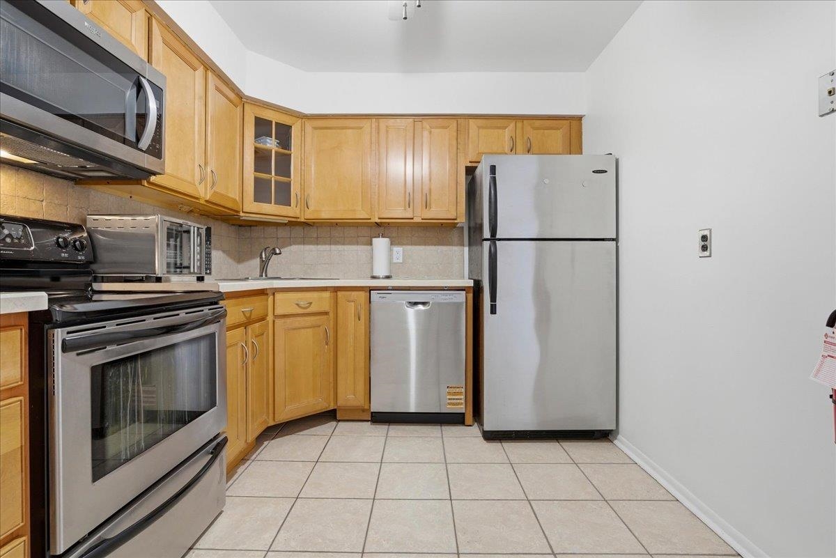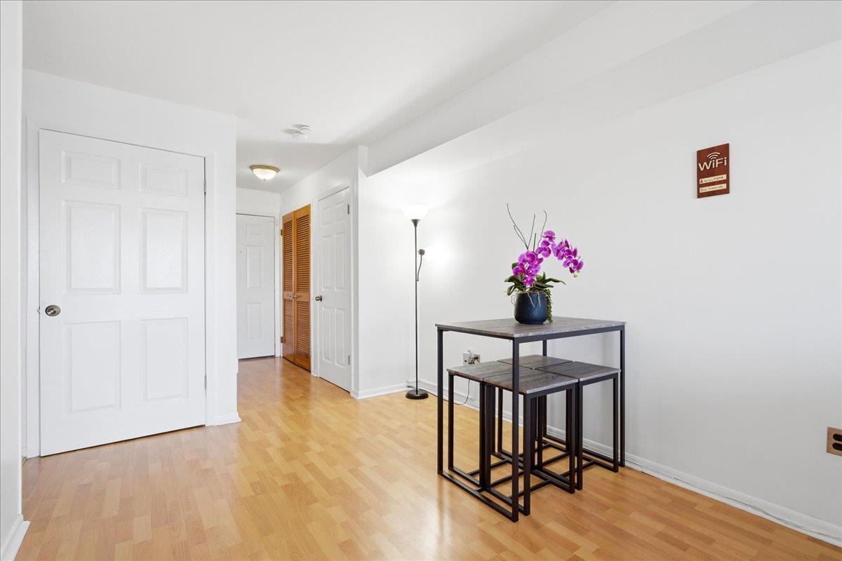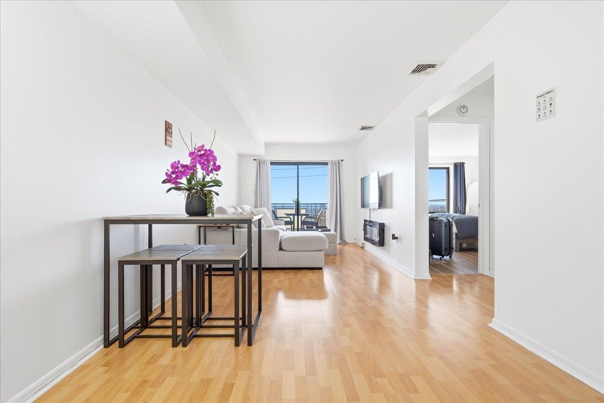 Beautiful, modern 1-bedroom, 1-bathroom condo offering comfort, convenience, and style. This inviting home features a welcoming foyer, a cozy dining area adjacent to a bright living room, and sliding glass doors leading to a private balcony—perfect for relaxing or entertaining. The spacious eat-in kitchen is equipped with warm wood cabinetry and stainless steel appliances. The full bathroom includes a tub and single vanity. Located on the second floor of an elevator building, this unit also offers access to a newly updated common washer and dryer. HOA includes water, sewer, and garage 1 spot parking for added value and ease. Ideally situated for commuters with convenient access to NYC and Jersey City. Don’t miss this opportunity—this one won’t last!