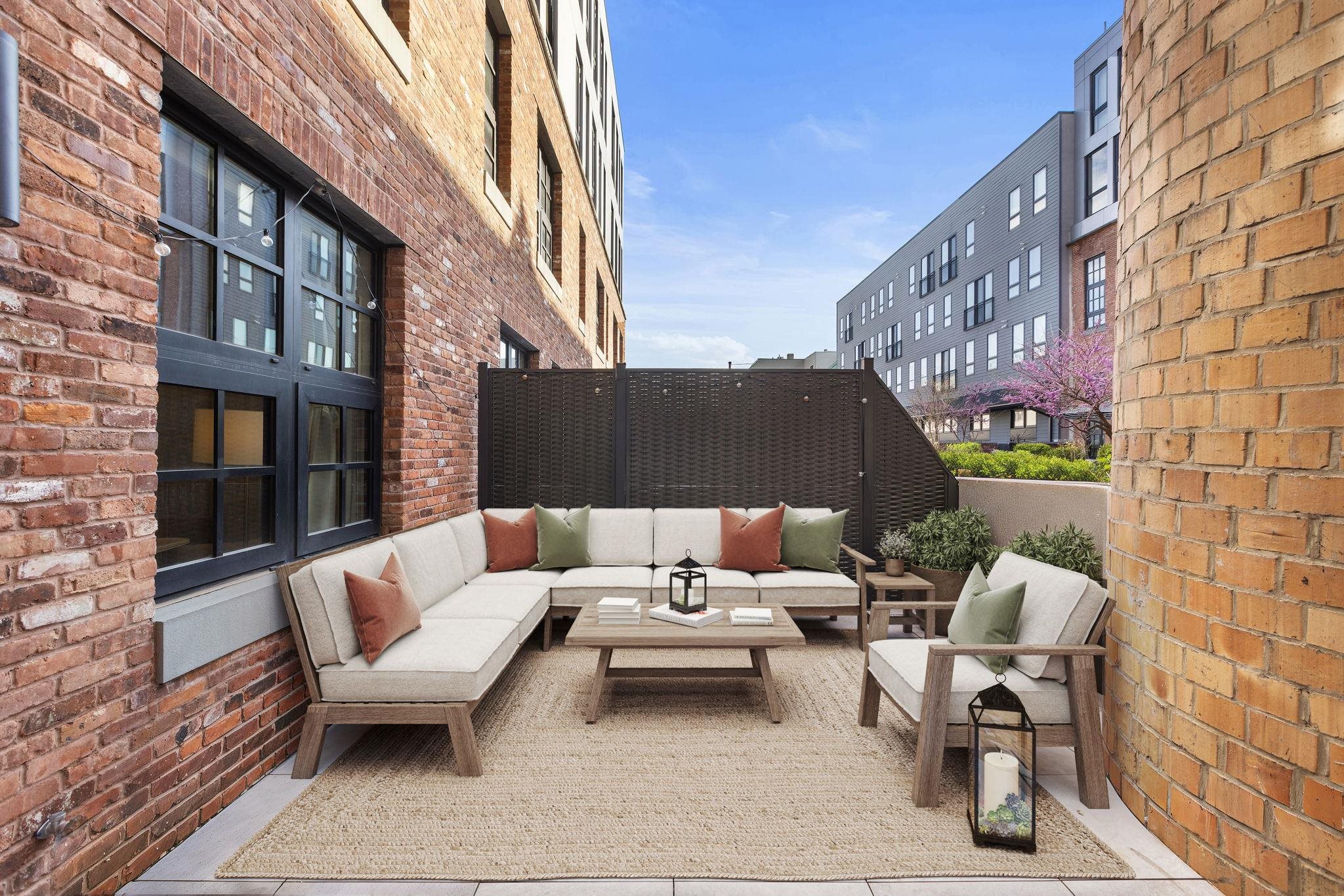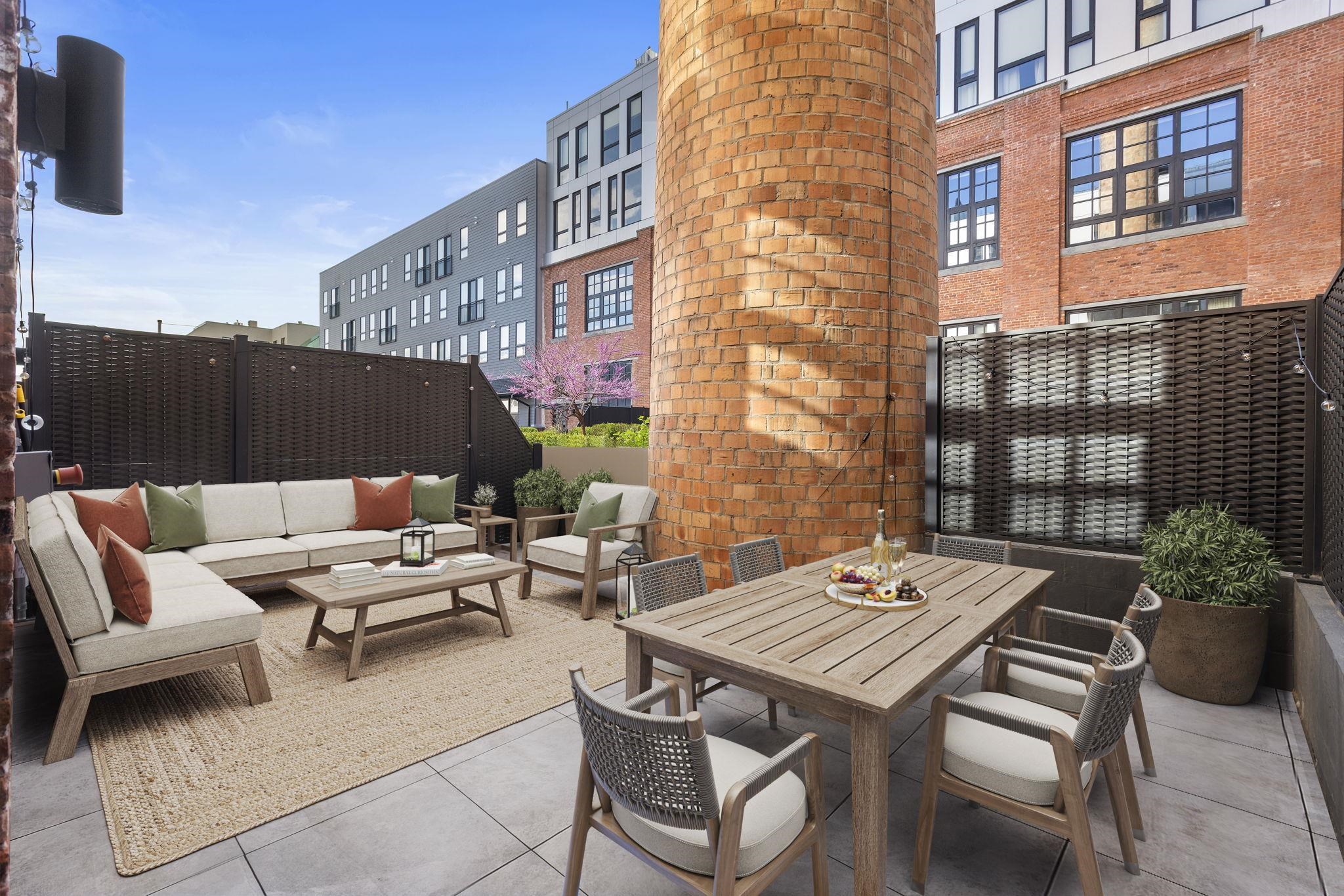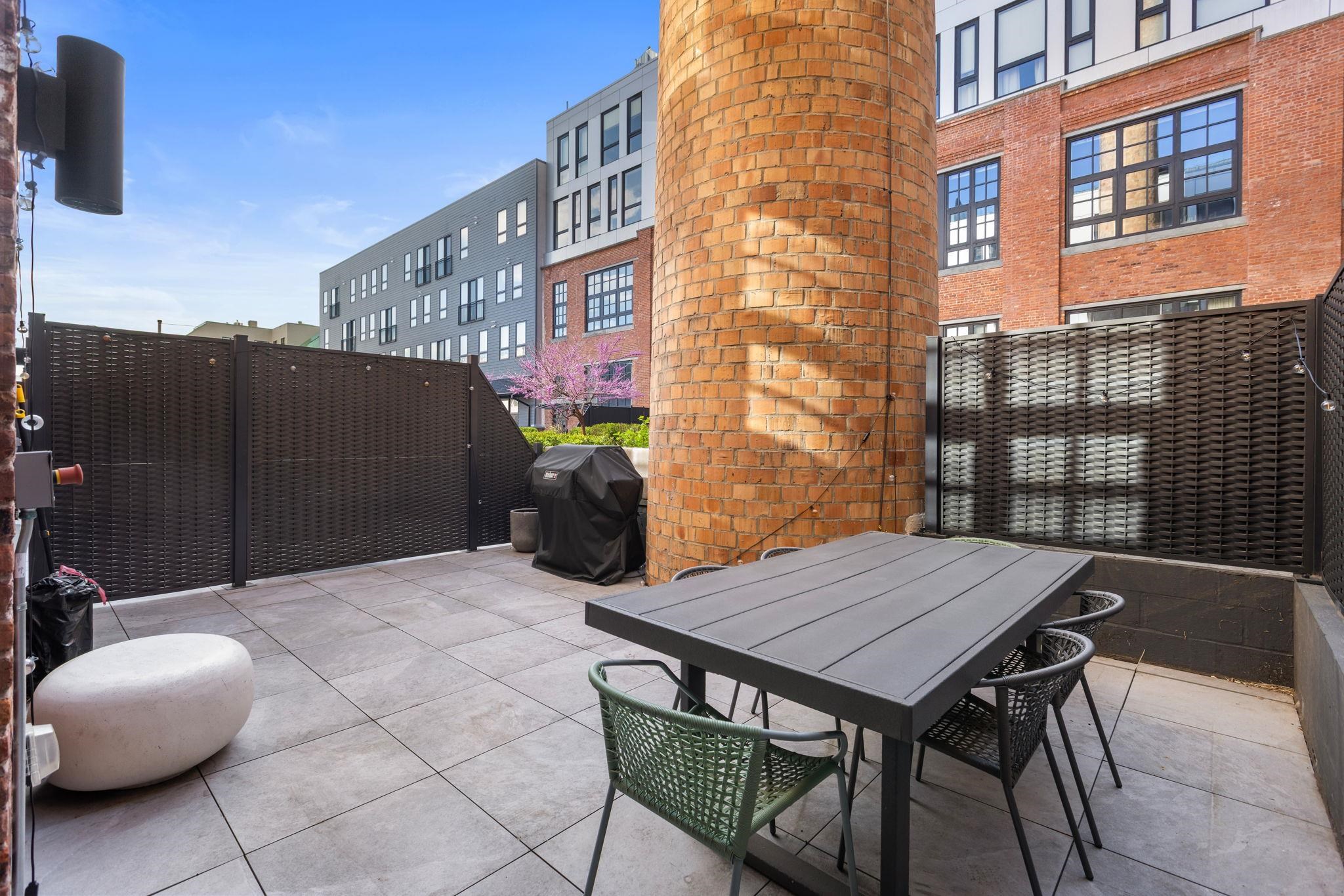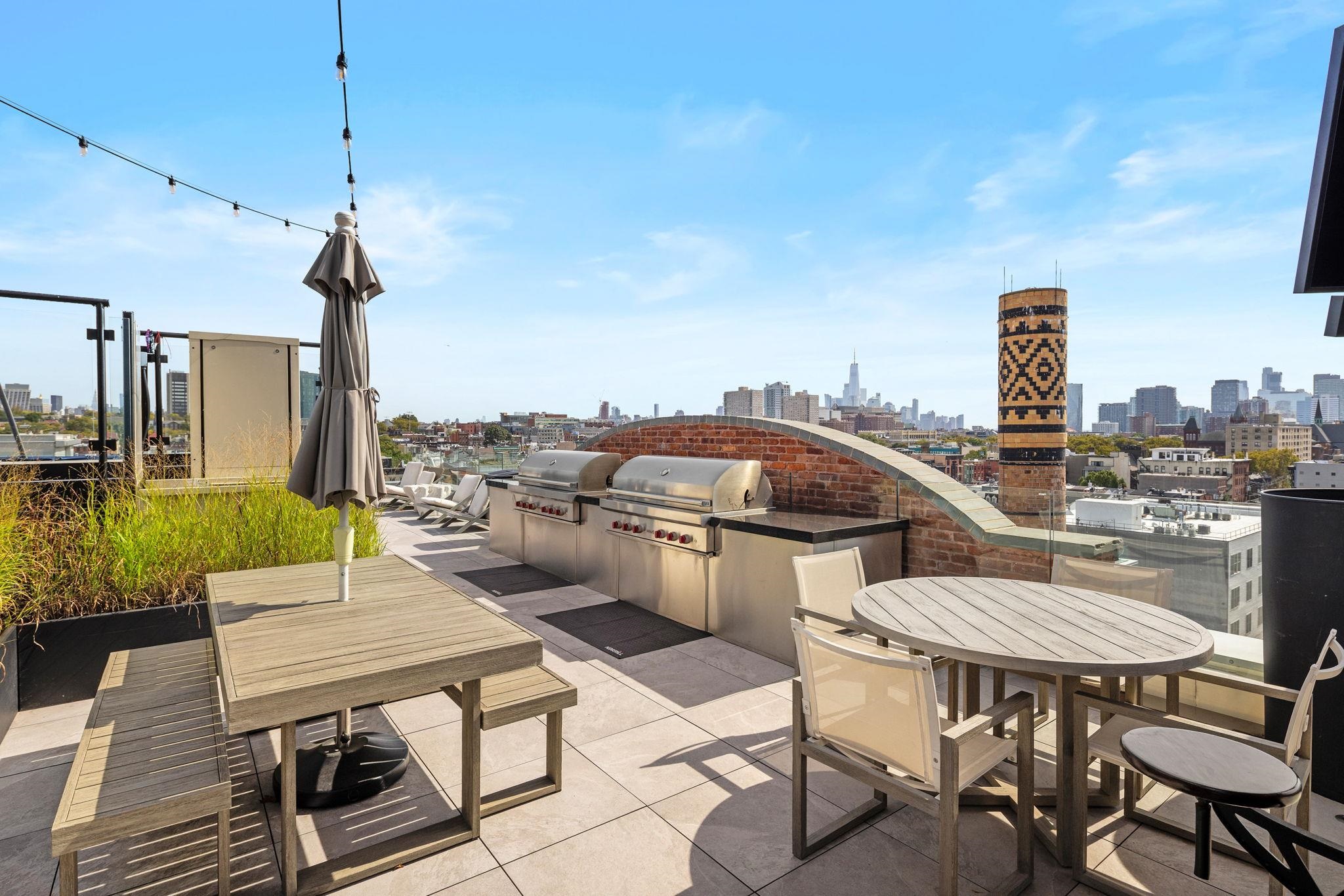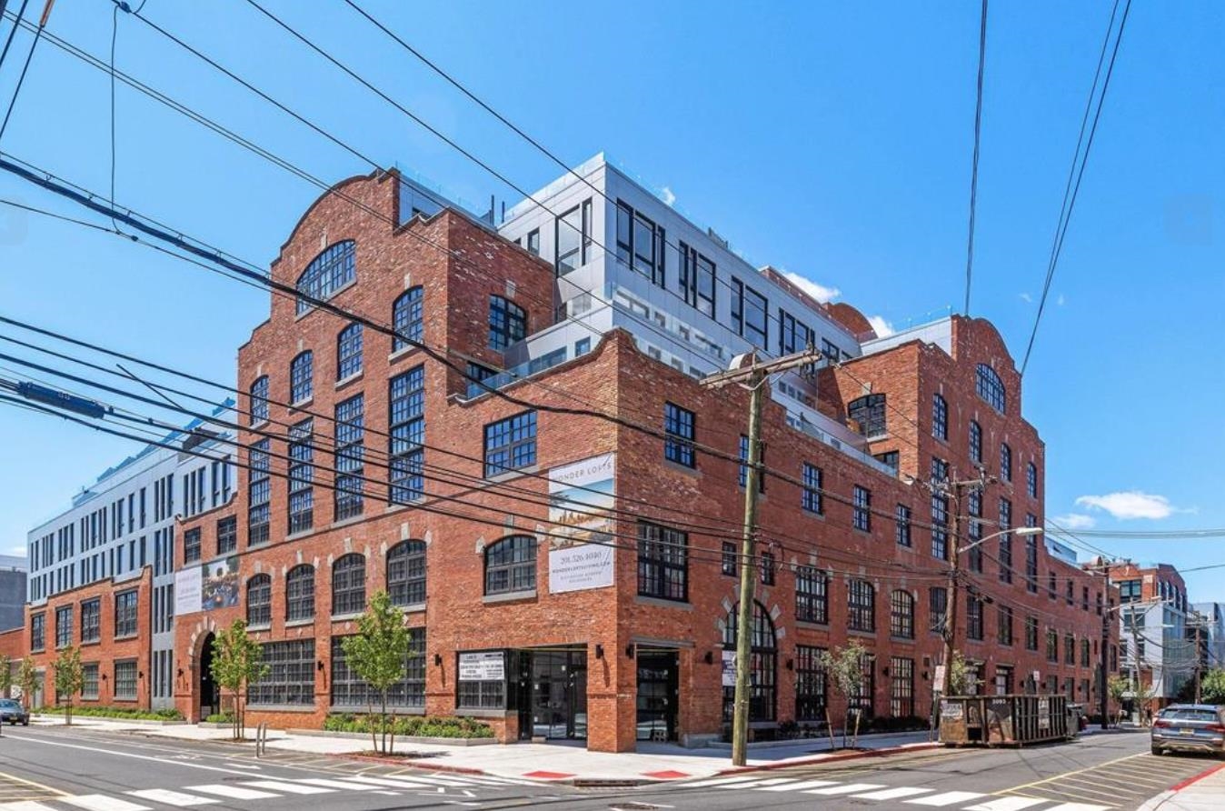 Welcome to 720 Clinton St #205 at Wonder Lofts, a LEED Gold-certified factory conversion set within the historic Wonder Bread factory in Hoboken. This west-facing 2BR/2BA home offers approximately 1,223 sq ft with a well-designed layout and excellent natural light. The open living and dining area features oversized industrial-style windows and wide-plank hardwood flooring. The kitchen is thoughtfully appointed with custom cabinetry, a waterfall-edge quartz island, and a premium appliance package including a gas range and Sub-Zero refrigerator. The living area opens directly to a private terrace, creating a seamless indoor-outdoor flow ideal for everyday use or entertaining. The primary suite includes generous closet space and an en-suite bath. The second bedroom is well-proportioned and versatile. Custom California Closets throughout, along with blackout shades in both bedrooms, add comfort and functionality. A dedicated laundry room with a sink provides additional convenience. One deeded garage parking space is included. Wonder Lofts offers 24/7 concierge service, a rooftop with an infinity pool and NYC skyline views, a fitness center, a resident lounge, a children's playroom, movie theater, yoga studio, a pet spa and more. Conveniently located near shops, parks, and restaurants, with NJ Transit bus service to Port Authority just steps from the building, along with access to the Light Rail, PATH, and Ferry.