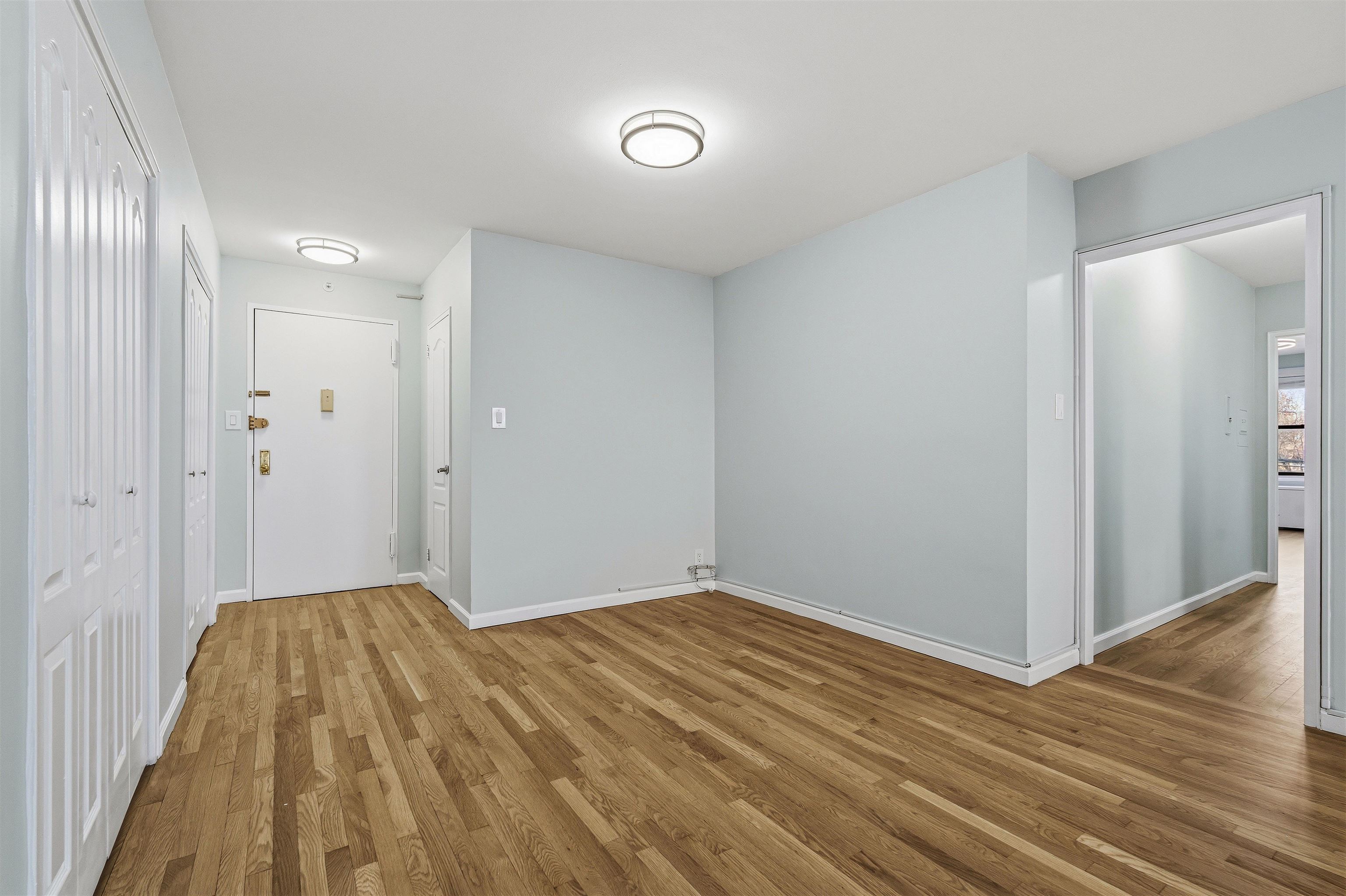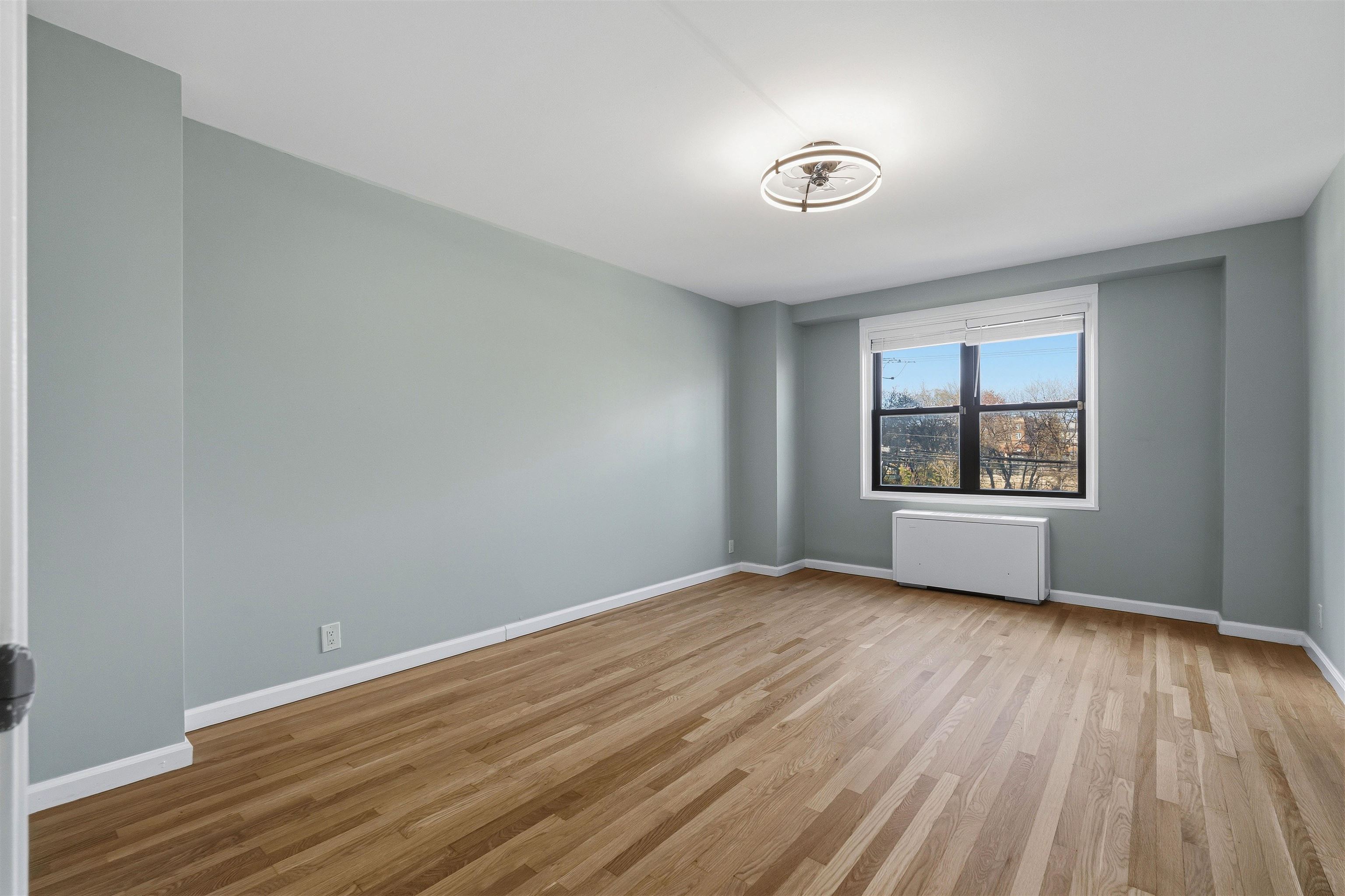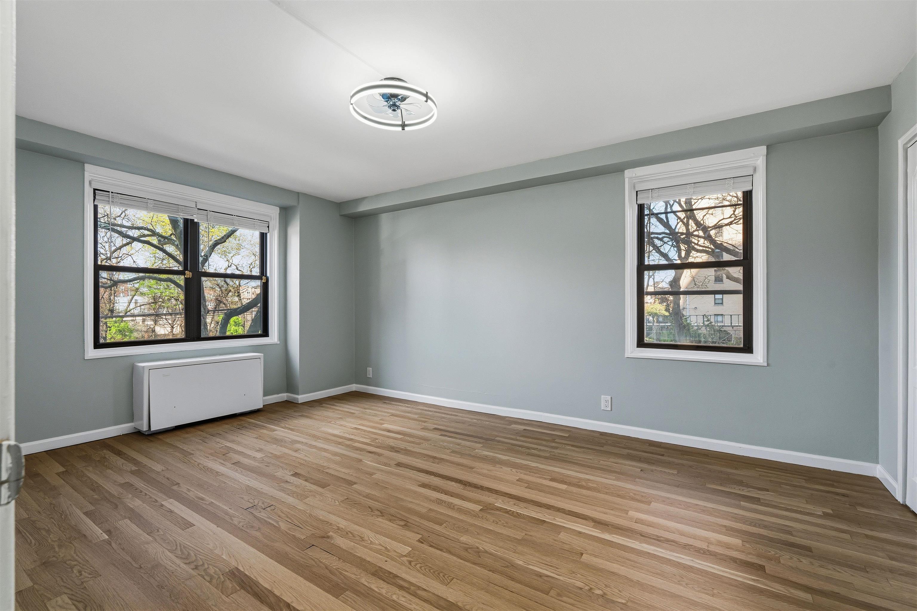 This spacious 2-bedroom corner condo offers the perfect blend of style, convenience, and value just four blocks from the Journal Square PATH, providing seamless access to NYC. Flooded with natural light, this oversized residence has been thoughtfully updated with a brand new kitchen featuring all new appliances, newly renovated bathrooms, fresh neutral paint, refinished original hardwood floors in a light modern tone, new light fixtures throughout, ceiling fans in both bedrooms, and new drawstring blinds in every room. Located in a full-service elevator building, residents enjoy an array of amenities including a 24-hour concierge, swimming pool, fitness center, playground, meditation garden, on-site laundry, and available parking, while the monthly HOA conveniently covers heat, hot water, cooking gas, and central A/C. Whether you're a commuter, first-time buyer, or looking to upsize within the community, this home presents an exceptional opportunity to own in one of Journal Square’s most vibrant and accessible neighborhoods.