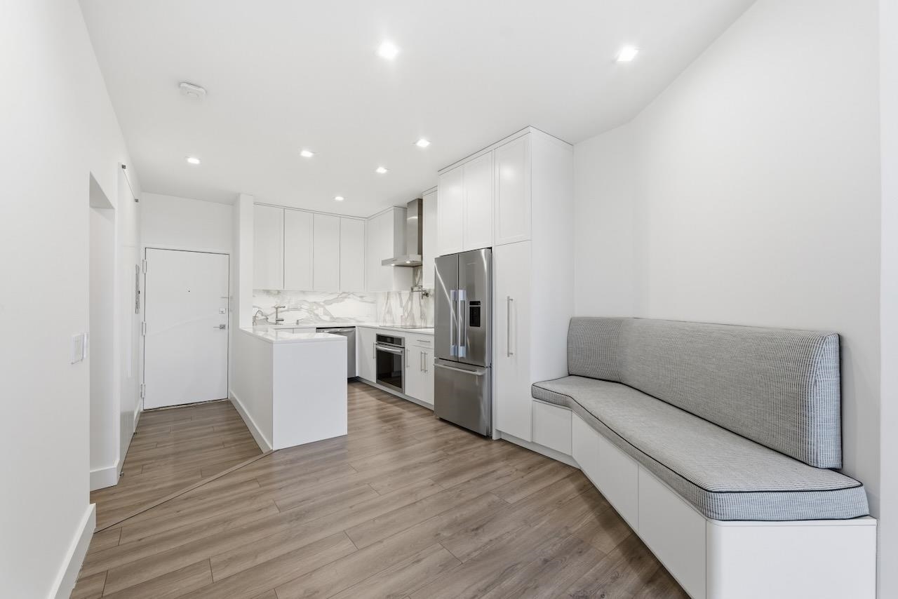Welcome to this meticulously renovated two-bedroom home in the heart of Journal Square. Thoughtfully designed with modern comforts, in an elevator building with off-street parking and a private balcony. The open-concept living space is framed by nearly 9-foot ceilings and abundant natural light. The chef’s kitchen is both striking and highly functional, featuring nano-glass countertops, a porcelain slab backsplash, custom cabinetry designed for maximum storage and usability, and a full suite of premium appliances including an induction cooktop, Electrolux oven, vented range hood, and drawer microwave. A built-in dining banquette with hidden storage adds style and practicality, while instant hot water at the sink elevates everyday convenience. The spa-like bathroom is wrapped in floor-to-ceiling marble tile, complete with dual shower heads and a heated towel rack. Both bedrooms are generously sized, with the primary capable of fitting a king sized bed plus two night stands. Both feature the same floor-to-ceiling closets that you’ll find in the entrance area and the second bedroom has the added bonus of a private balcony. Remote-controlled roller shades, Lutron dimmer switches, and integrated Verizon Fios internet bring effortless modern living to every room. With new systems throughout, enhanced soundproofing, and close proximity to the Journal Square PATH, this home offers a rare blend of luxury, efficiency, and commuter convenience.