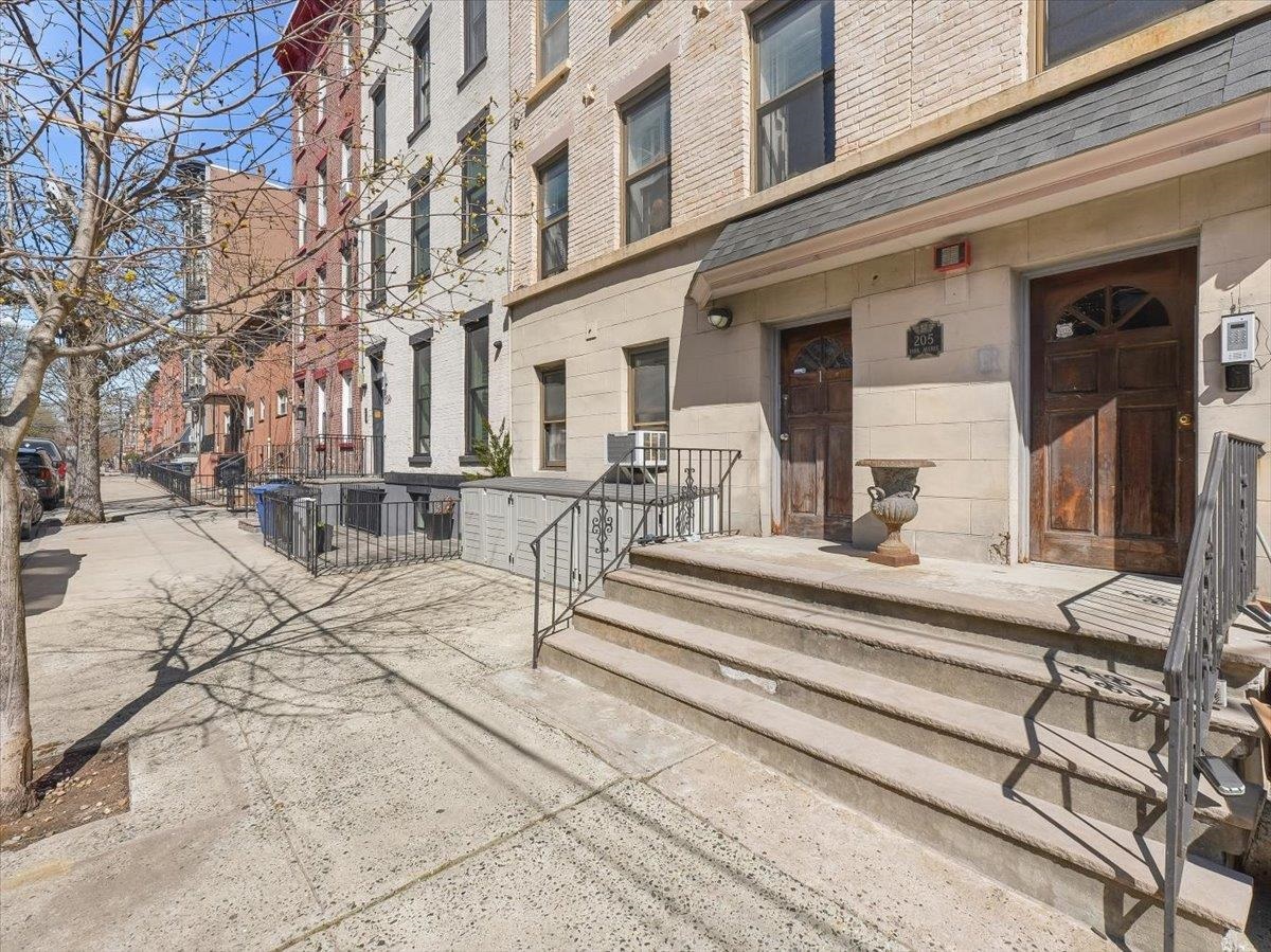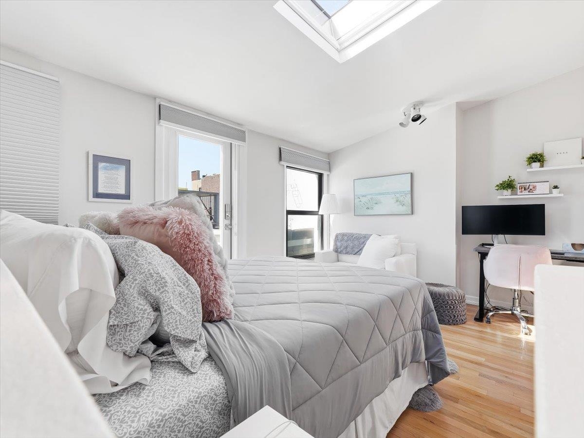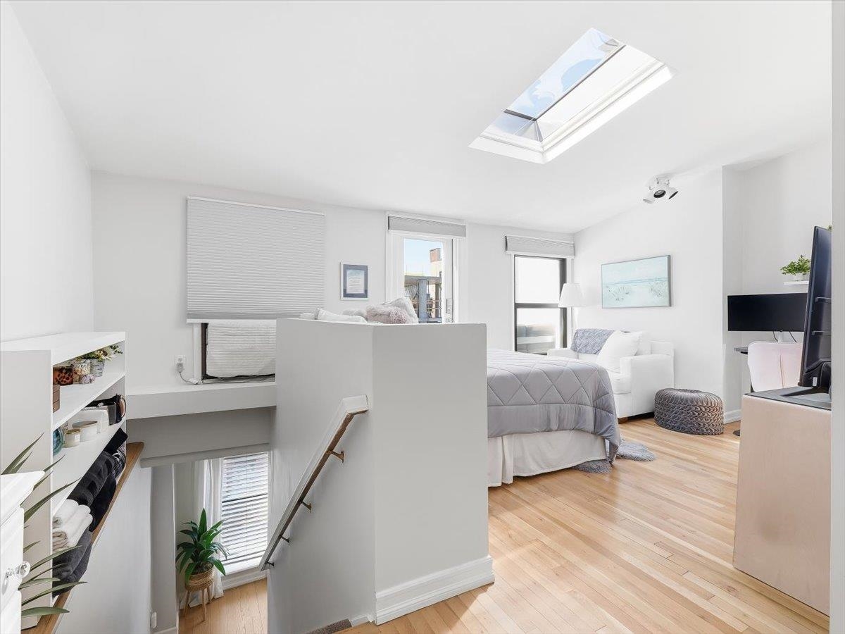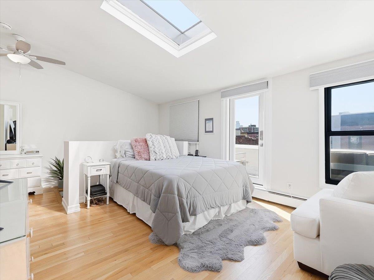 Experience the best of downtown Hoboken living in this spacious and sun-filled 1-bedroom, 1.5-bath duplex condo on desirable Park Avenue, complete with your own private roof deck. Thoughtfully designed across two levels, the layout offers a perfect balance of openness and privacy. The main floor features a generous living area centered around a charming wood-burning fireplace, complemented by newly refinished hardwood floors that bring warmth and character to the space. The kitchen blends modern updates with timeless style, showcasing crisp white cabinetry, stainless steel appliances, granite countertops, white subway tile, and distinctive slate flooring that echoes the home’s classic aesthetic. A convenient half bath and under-stair storage complete this level. Upstairs, an open staircase leads to a bright and airy lofted bedroom suite, enhanced by a new skylight and direct access to your private terrace—ideal for relaxing or entertaining. The full bathroom has been recently renovated with tasteful, modern finishes. Additional features include new in-unit laundry, ample storage, updated A/C units, ceiling fans, and overhead lighting. Recent exterior building improvements, including a new roof and siding, add further value and peace of mind. Enjoy seamless indoor-outdoor living year-round—soak up the sunshine on your terrace or unwind by the fire during cooler months. Ideally located just moments from Hoboken’s lively dining scene, boutique shopping, and scenic waterfront, this home offers an exceptional blend of comfort, style, and convenience.