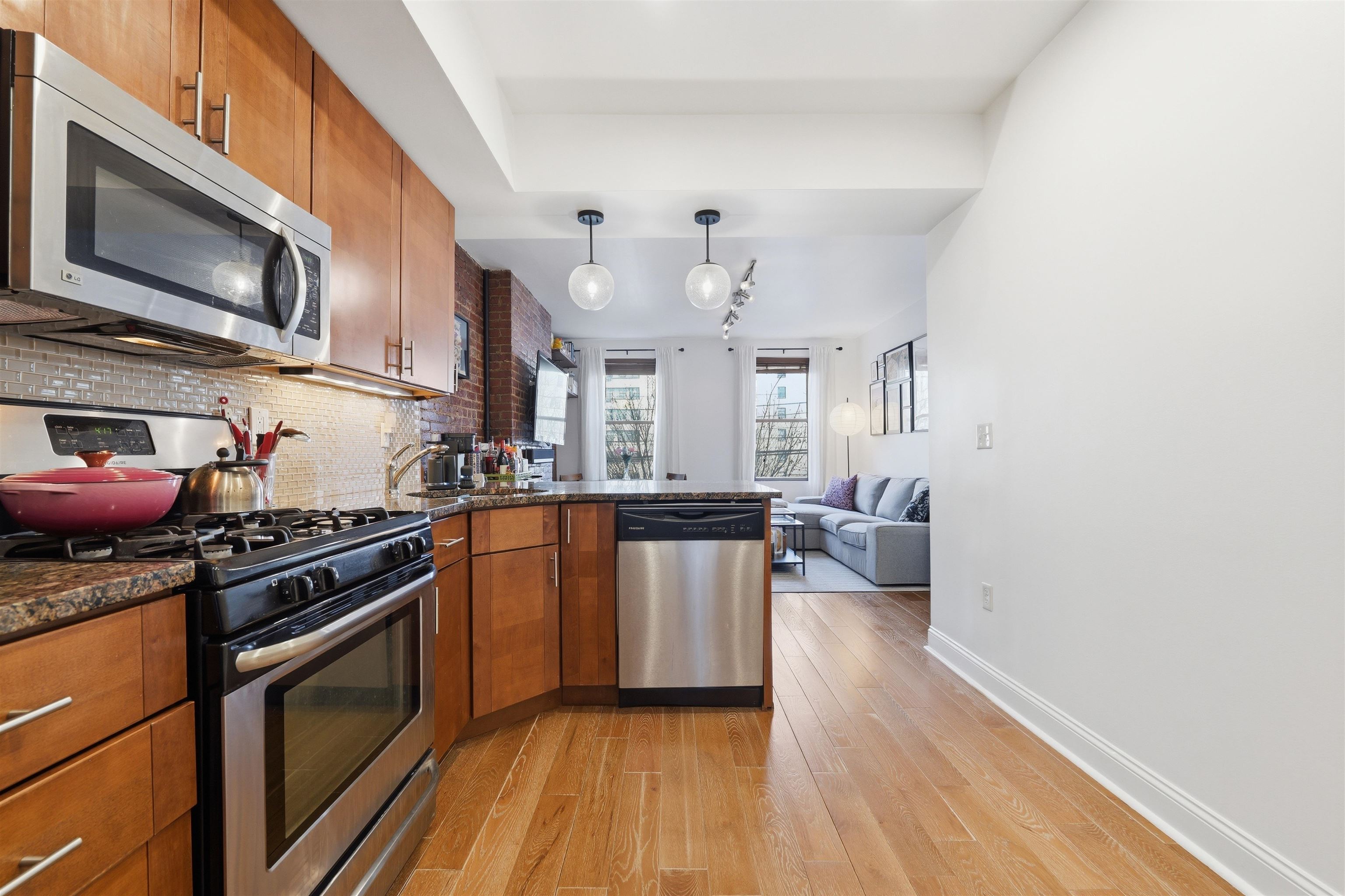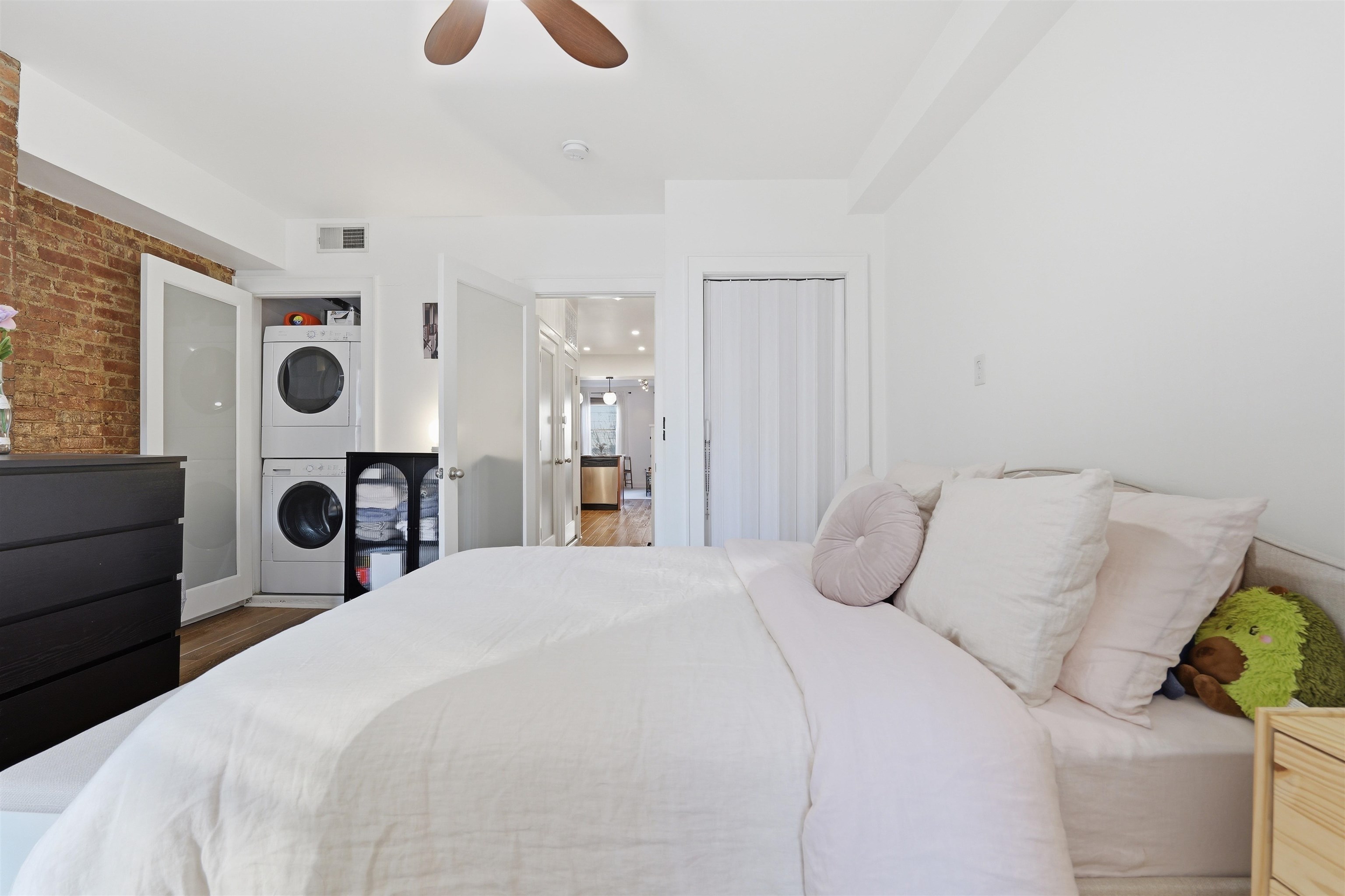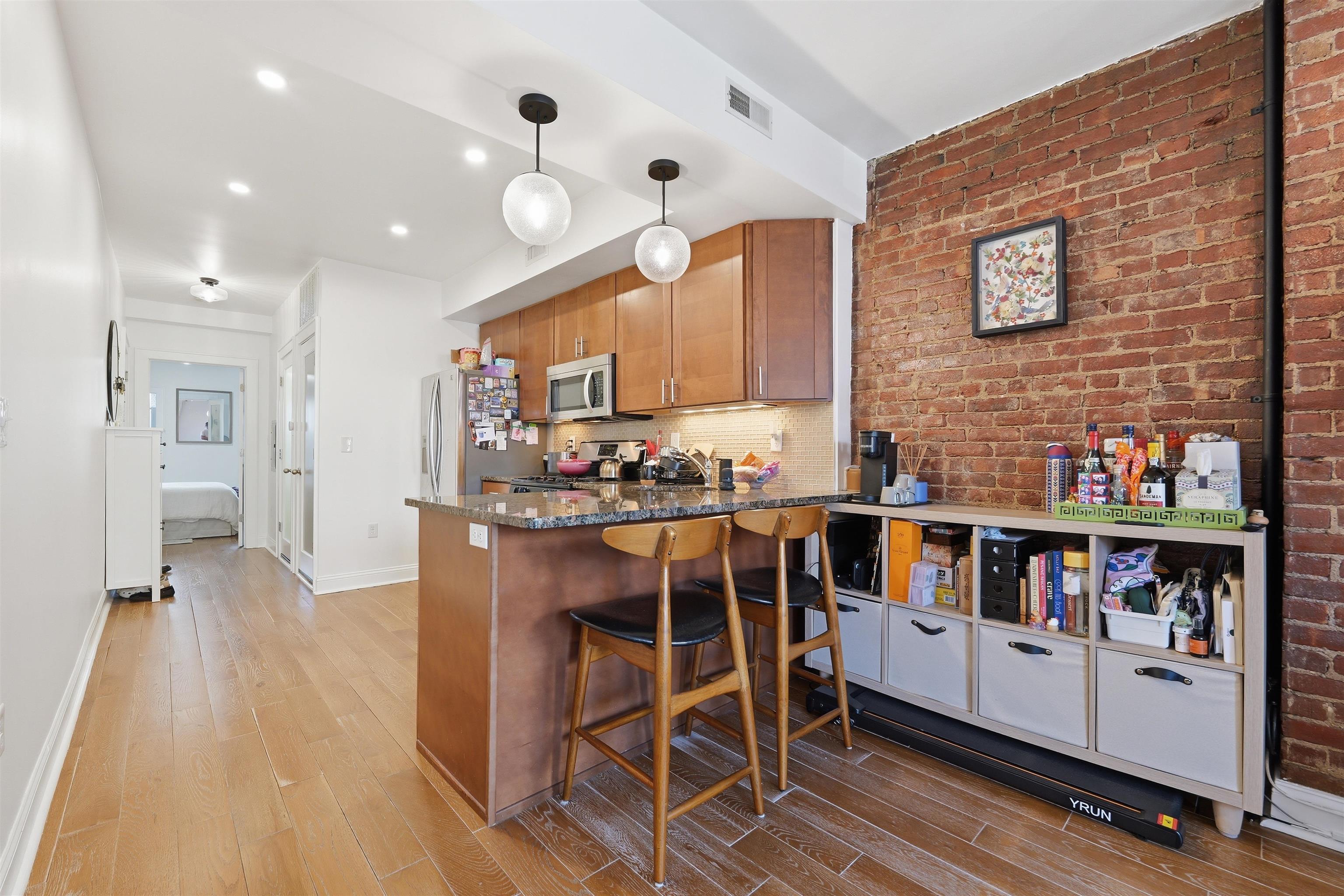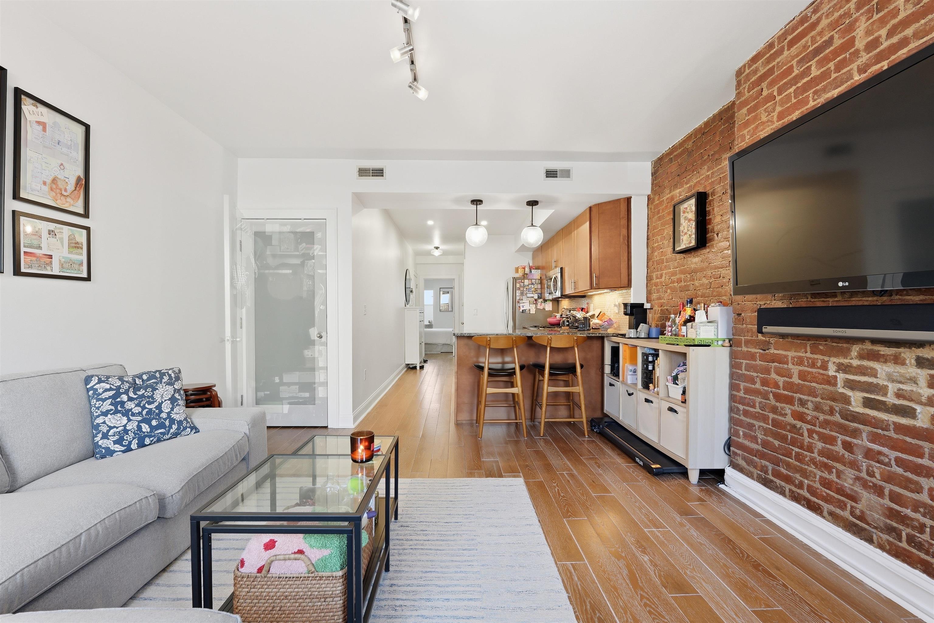 Beautifully appointed and spacious 1-bedroom, 1.5-bath residence ideally situated on the second floor with an easy one-flight walk-up in the heart of Hoboken. Blending classic charm with modern upgrades, this thoughtfully refreshed home features exposed brick, rich hardwood floors throughout, and a seamless open-concept layout enhanced by integrated Sonos sound in both the living area and bathrooms. The well-designed kitchen flows effortlessly into the living and dining space, complete with stainless steel appliances, granite countertops, and ample cabinetry, making it ideal for both everyday living and entertaining. The expansive bedroom is filled with natural light and offers two generous closets along with a private en-suite bath, while an additional powder room provides added convenience for guests. Additional highlights include central HVAC for year-round comfort, a full-size in-unit washer and dryer, and an exceptionally large private storage unit within the building. Perfectly positioned just moments from NJ Transit, ACME, and Hoboken’s vibrant dining and shopping scene, this home offers both comfort and convenience, with a municipal parking lot located directly across the street for added ease.