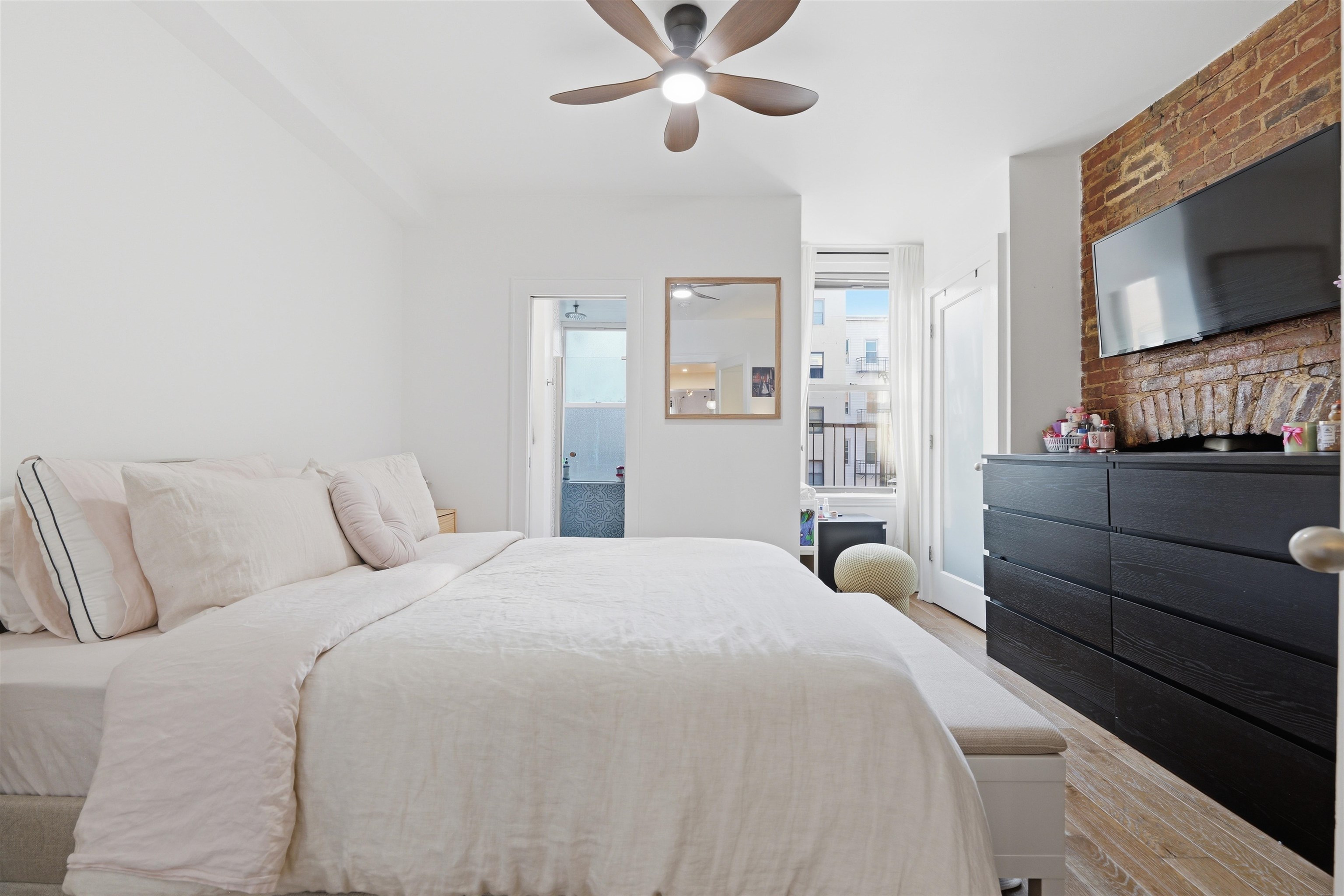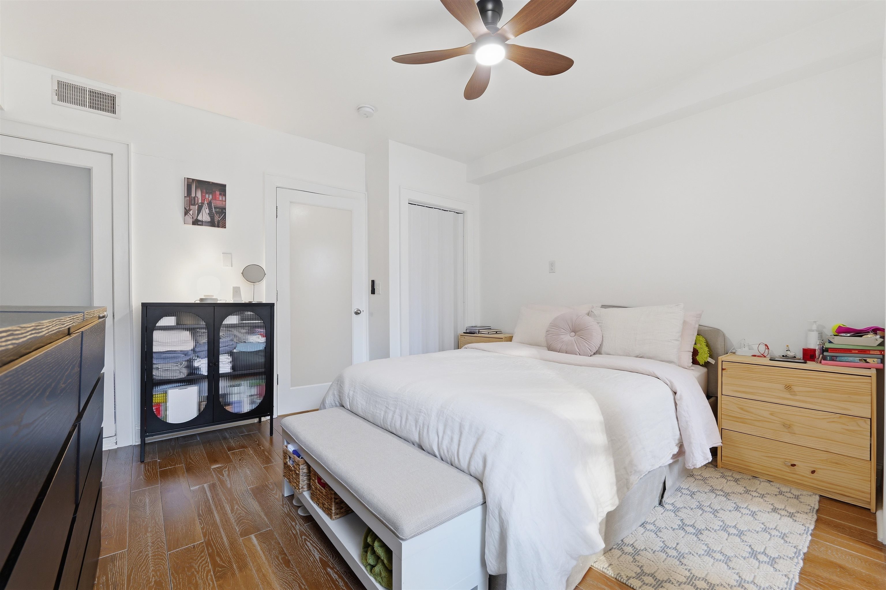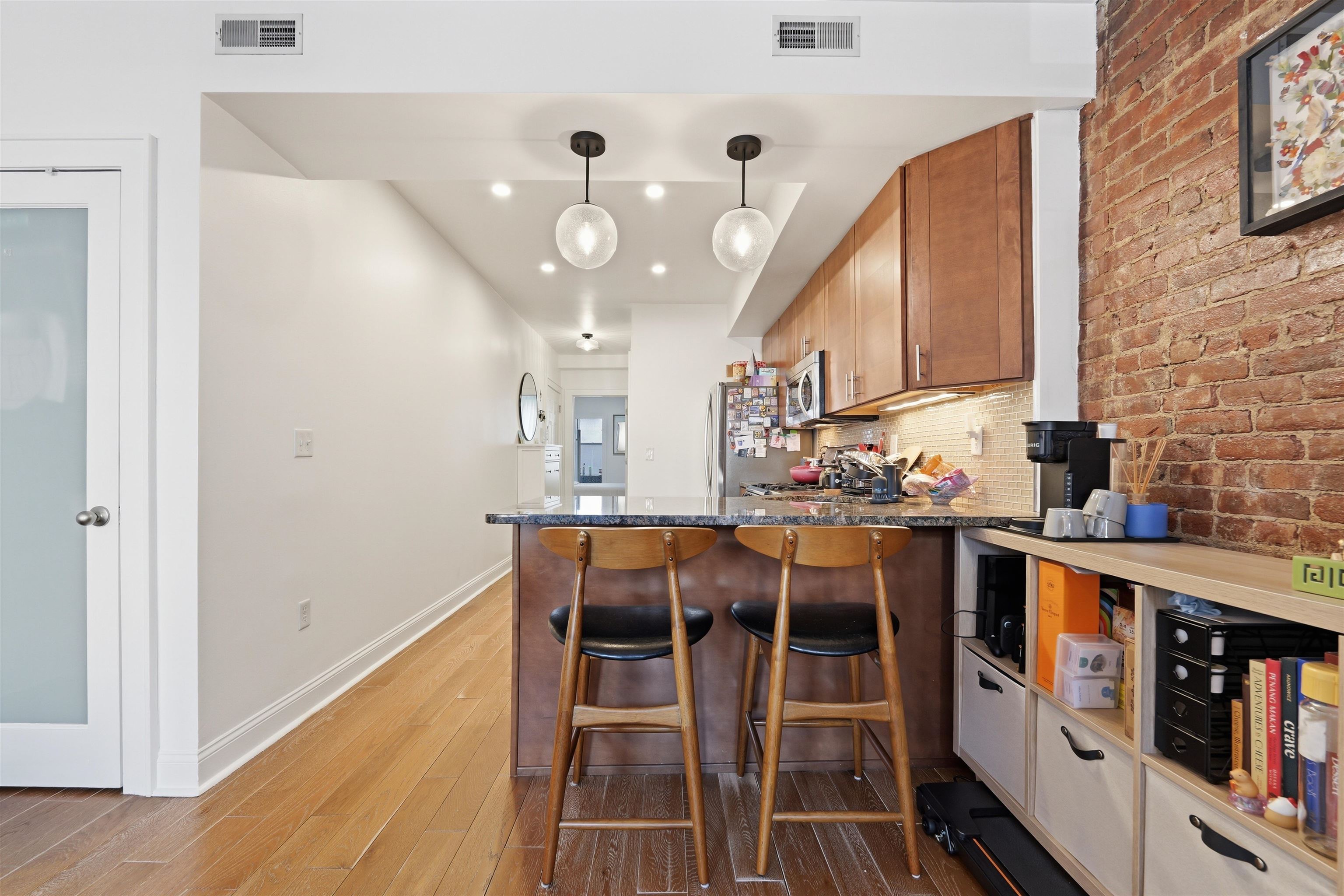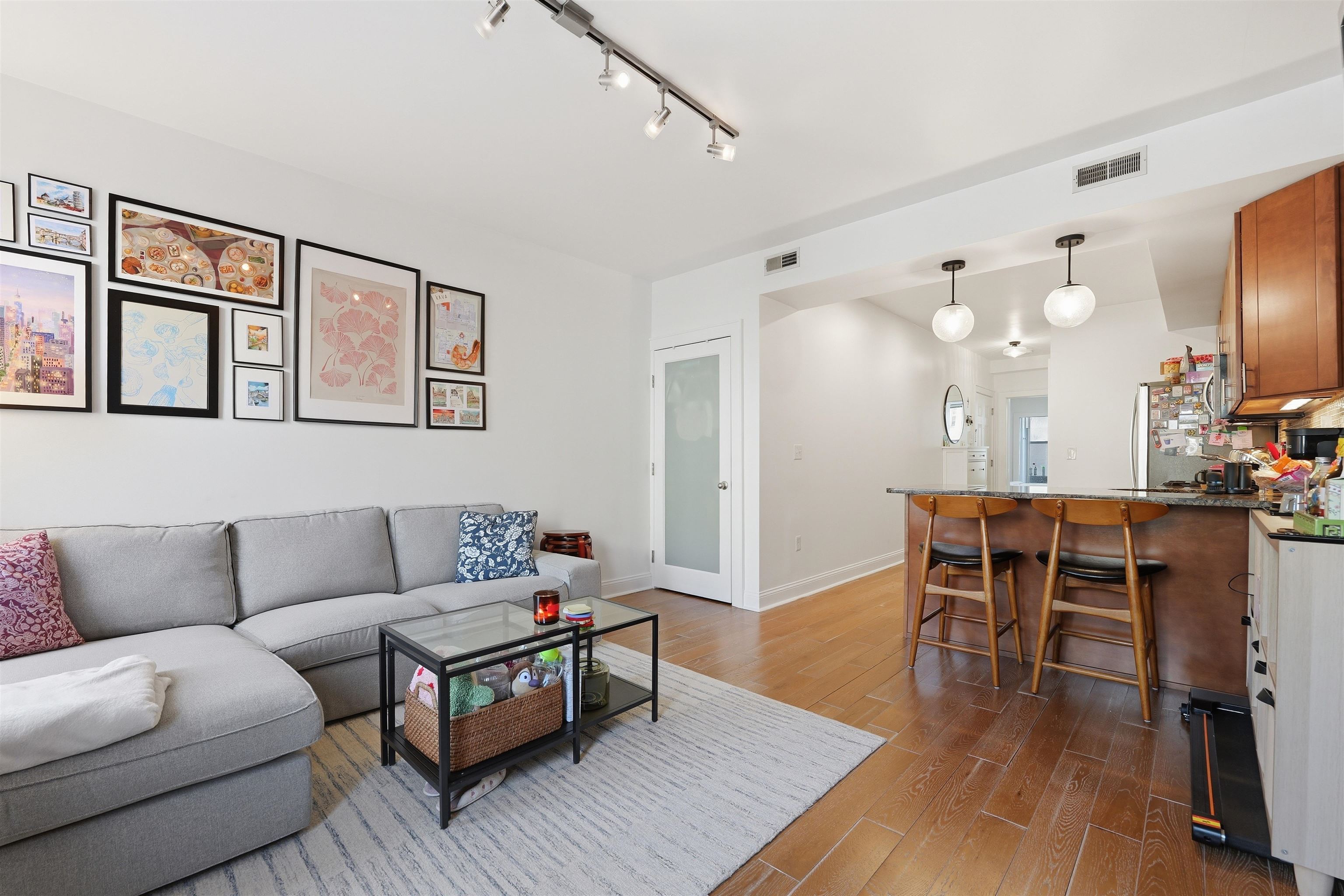 Beautifully appointed and spacious 1-bedroom, 1.5-bath residence ideally situated on the second floor with an easy one-flight walk-up in the heart of Hoboken. Blending classic charm with modern upgrades, this thoughtfully refreshed home features exposed brick, rich hardwood floors throughout, and a seamless open-concept layout enhanced by integrated Sonos sound in both the living area and bathrooms. The well-designed kitchen flows effortlessly into the living and dining space, complete with stainless steel appliances, granite countertops, and ample cabinetry, making it ideal for both everyday living and entertaining. The expansive bedroom is filled with natural light and offers two generous closets along with a private en-suite bath, while an additional powder room provides added convenience for guests. Additional highlights include central HVAC for year-round comfort, a full-size in-unit washer and dryer, and an exceptionally large private storage unit within the building. Perfectly positioned just moments from NJ Transit, ACME, and Hoboken’s vibrant dining and shopping scene, this home offers both comfort and convenience, with a municipal parking lot located directly across the street for added ease.