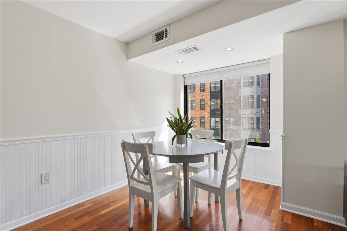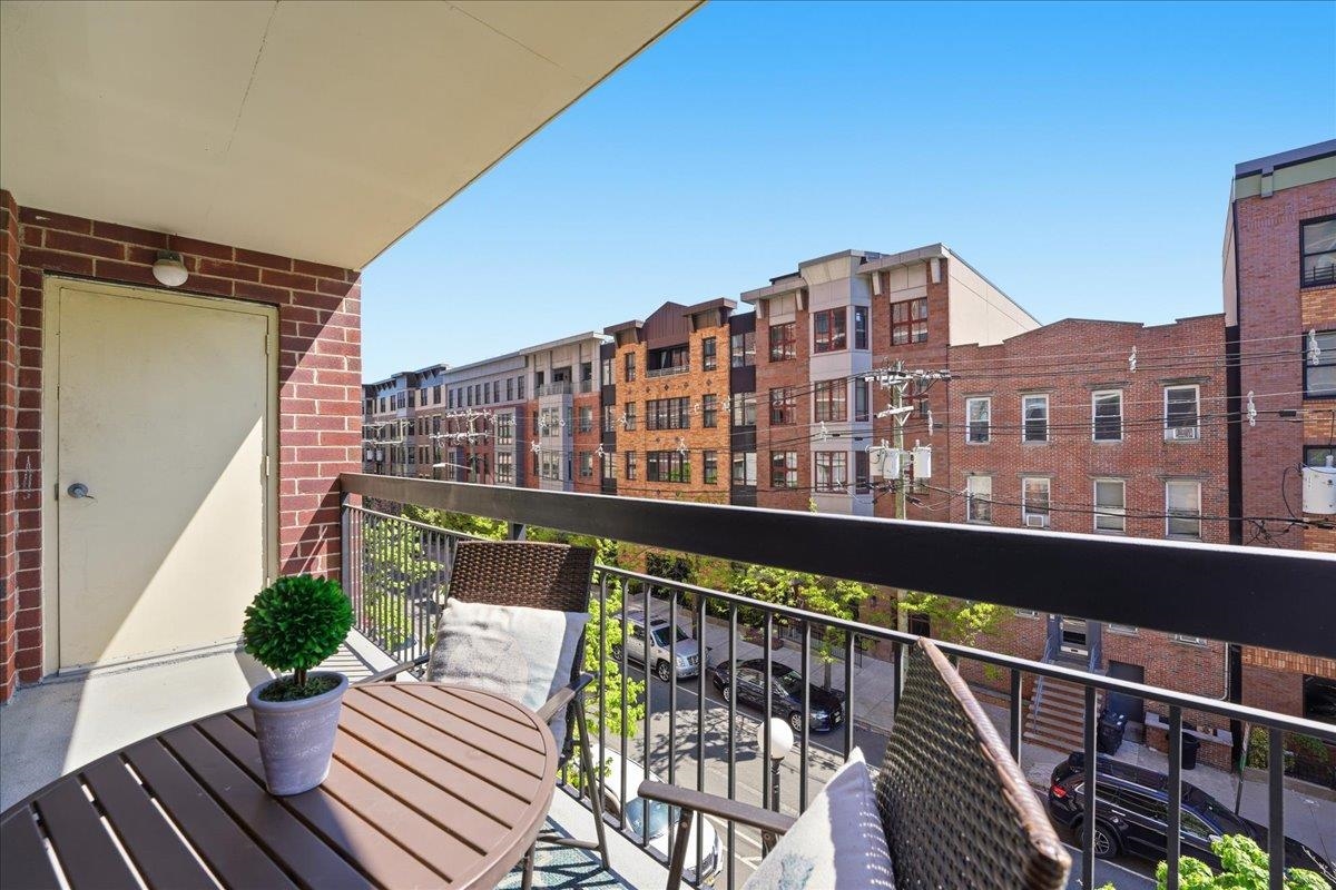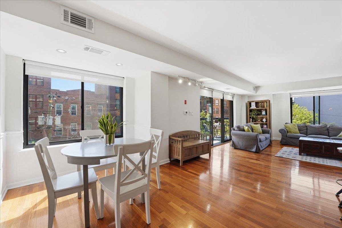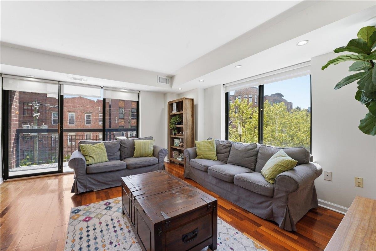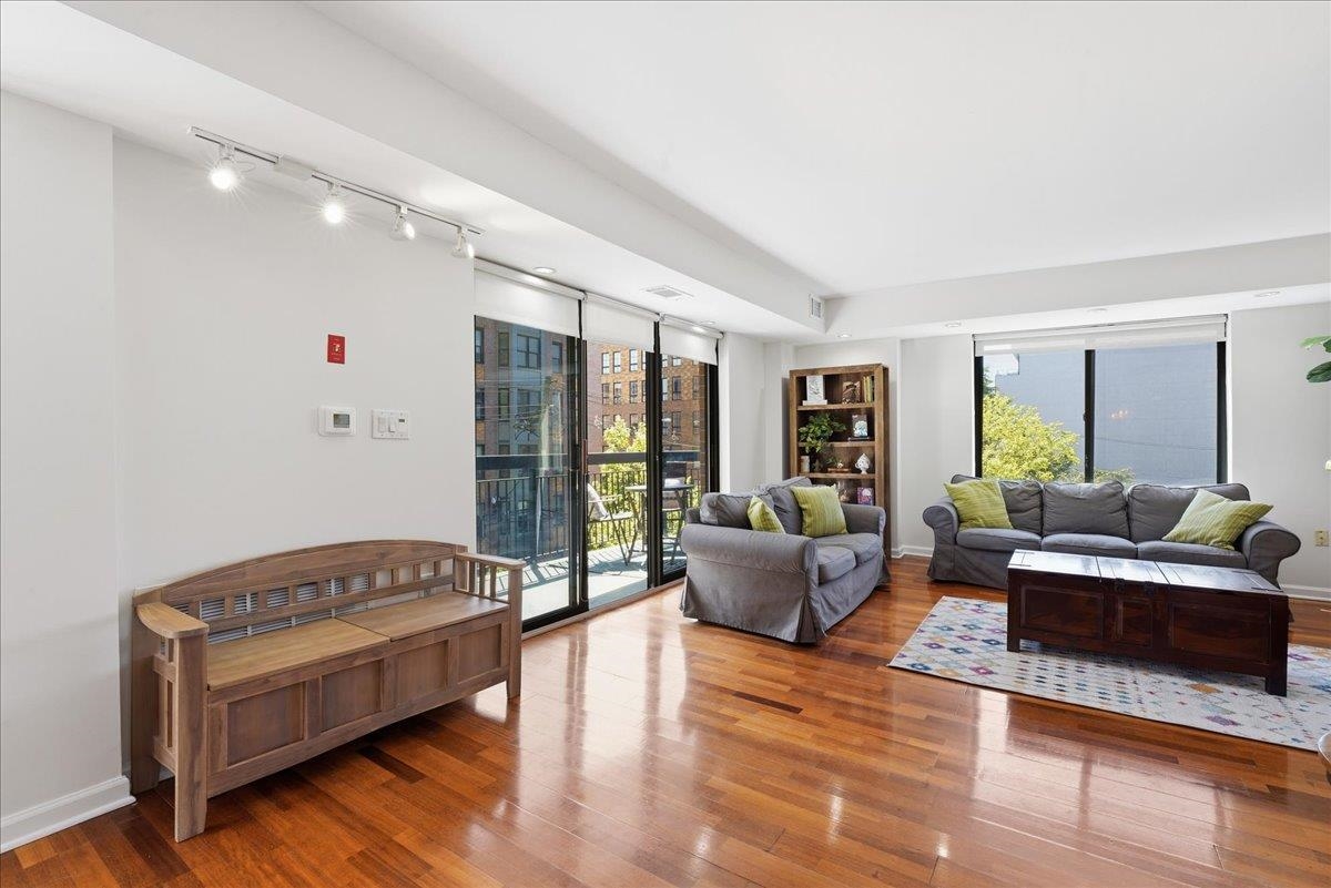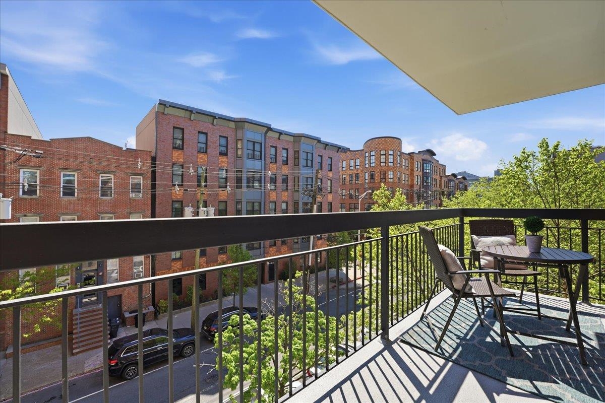 This 2 bedroom, 2 bathroom corner home offers approximately 1,268 square feet of well-designed living space, making it one of the largest two bedroom layouts in the building. With south-facing exposures and windows throughout, the home is filled with natural light from morning through the day. The open living and dining area creates a natural flow, offering a layout that feels expansive while still giving you the opportunity to make it your own. A private balcony with beautiful morning sun extends the living space. Hardwood floors run throughout, and the home is complete with an in-unit washer and dryer for everyday convenience. A full service building with a concierge, resident lounge, package room, courtyard, and bike storage. On-site parking is available for an additional monthly fee. Located near the PATH, bus, and light rail, with a dedicated shuttle service exclusive to the building. Shops, dining, and a brand new restaurant right downstairs for true Hoboken living.
