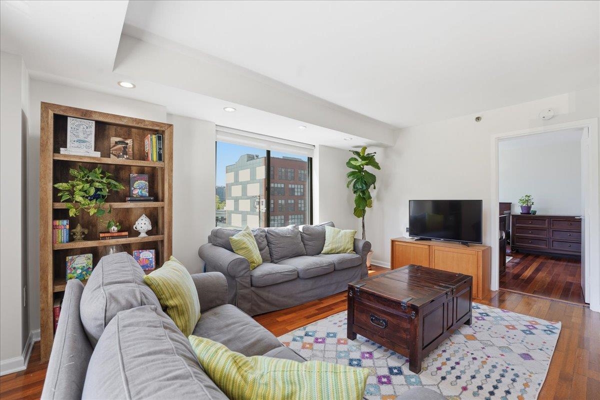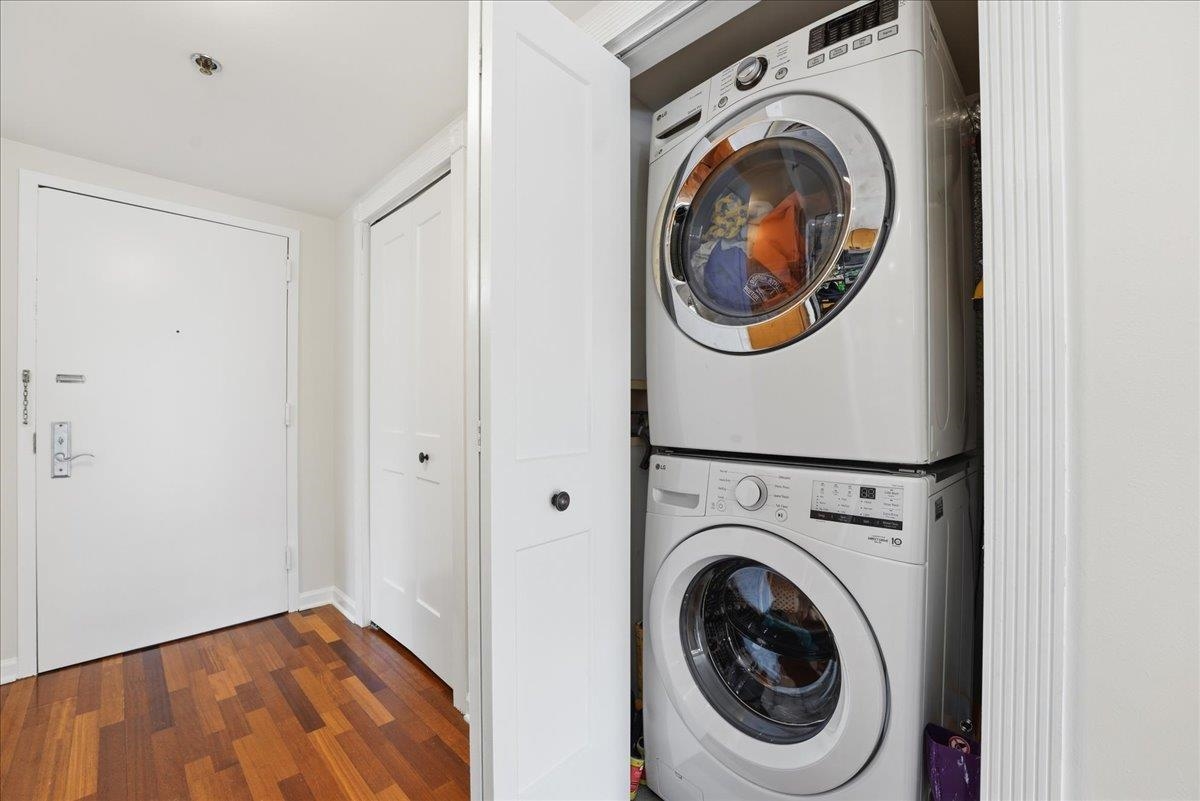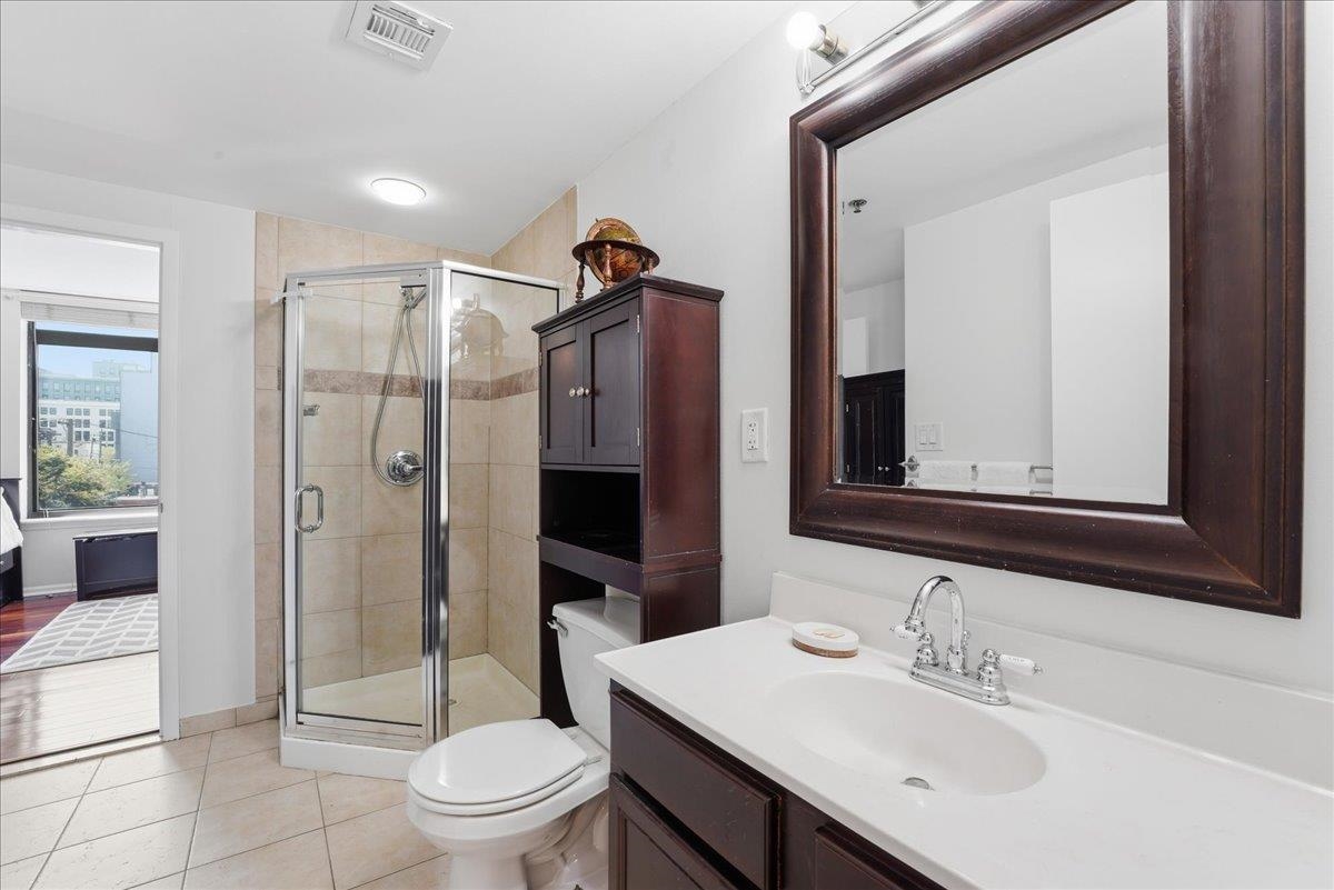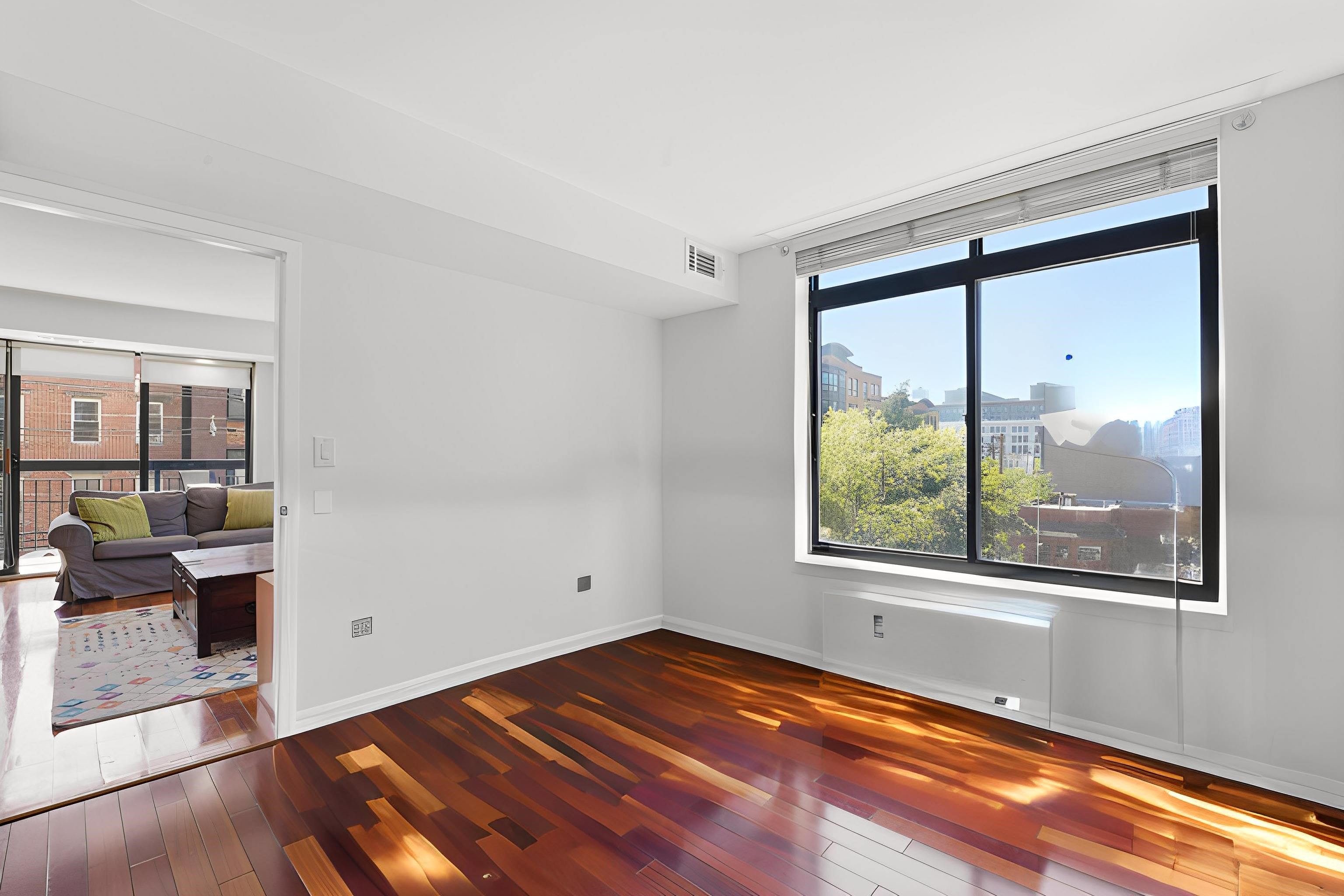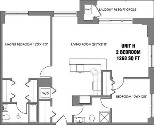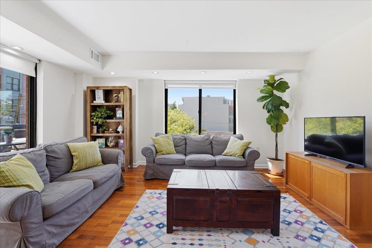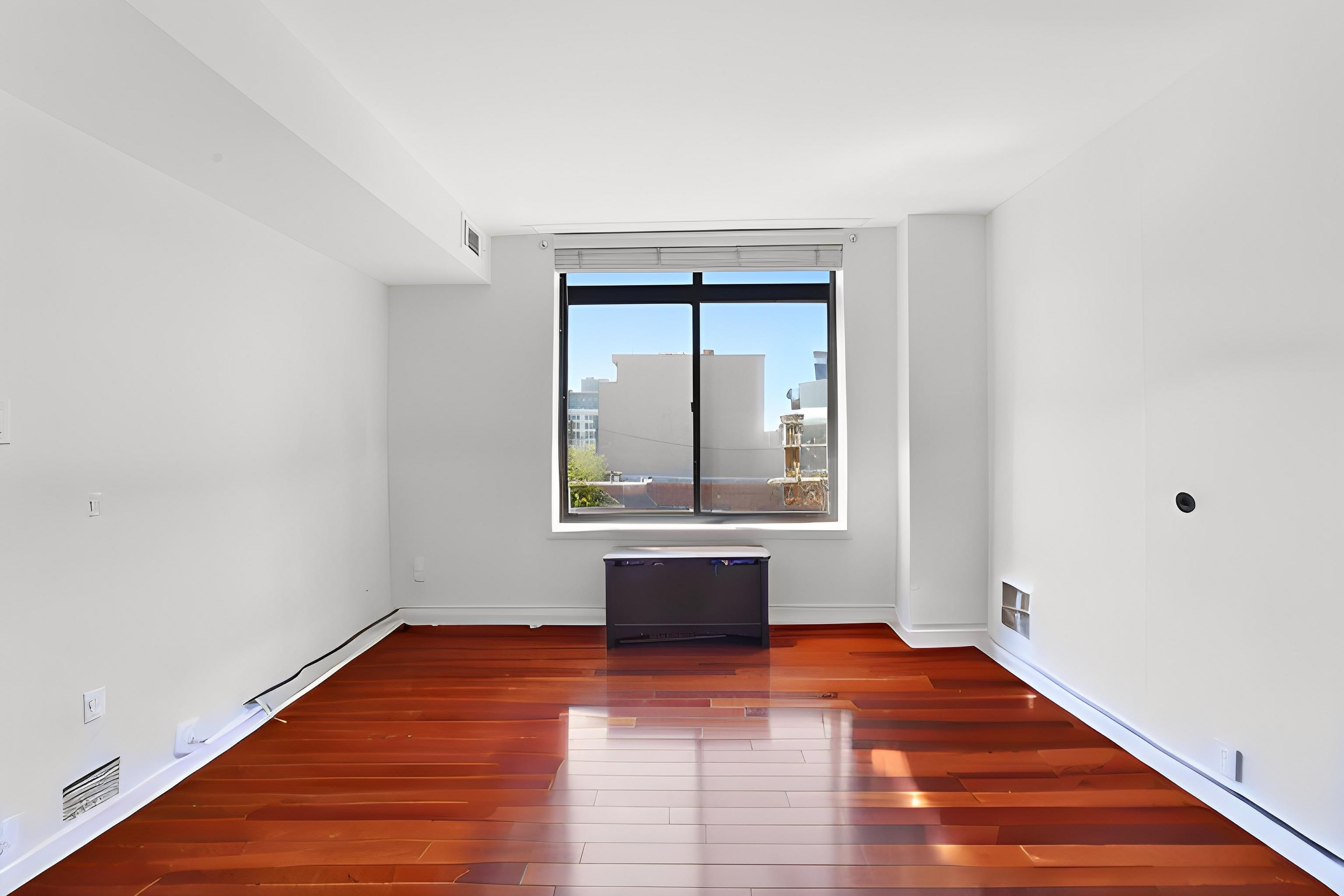 This 2 bedroom, 2 bathroom corner home offers approximately 1,268 square feet of well-designed living space, making it one of the largest two bedroom layouts in the building. With south-facing exposures and windows throughout, the home is filled with natural light from morning through the day. The open living and dining area creates a natural flow, offering a layout that feels expansive while still giving you the opportunity to make it your own. A private balcony with beautiful morning sun extends the living space. Hardwood floors run throughout, and the home is complete with an in-unit washer and dryer for everyday convenience. A full service building with a concierge, resident lounge, package room, courtyard, and bike storage. On-site parking is available for an additional monthly fee. Located near the PATH, bus, and light rail, with a dedicated shuttle service exclusive to the building. Shops, dining, and a brand new restaurant right downstairs for true Hoboken living.