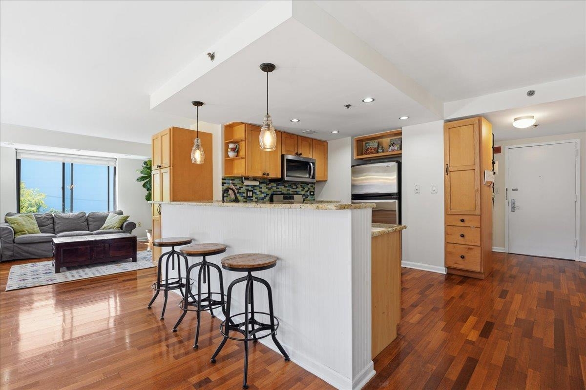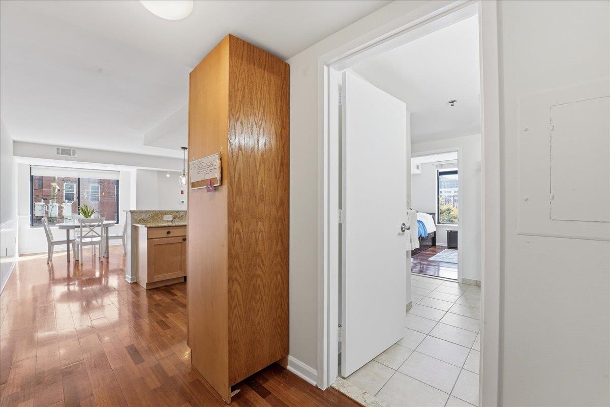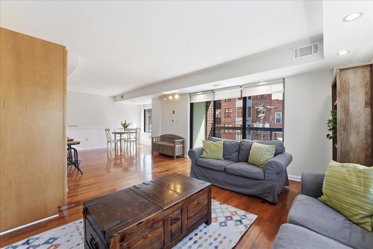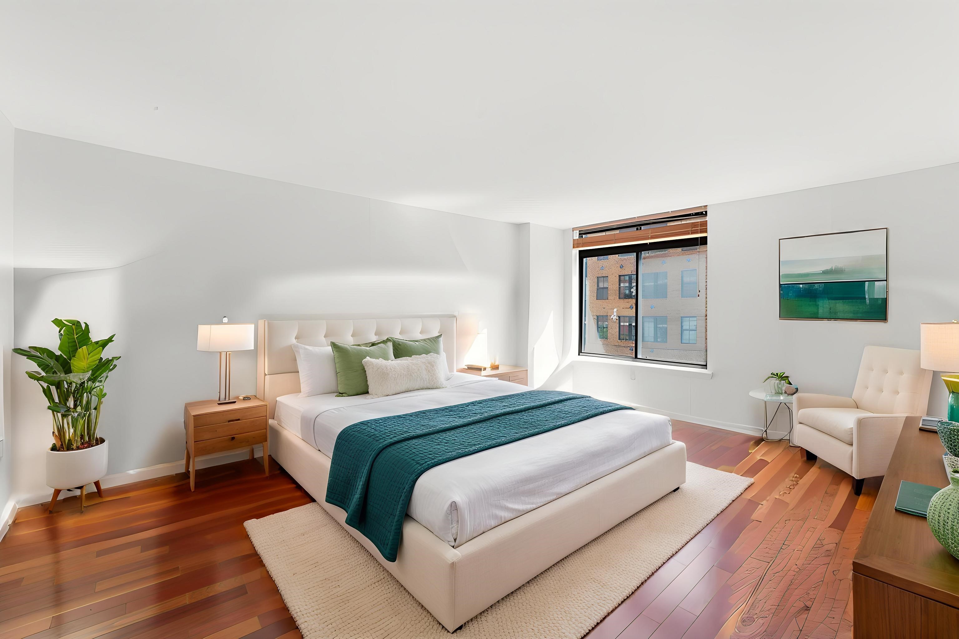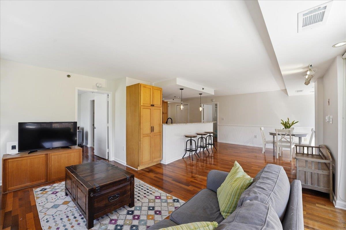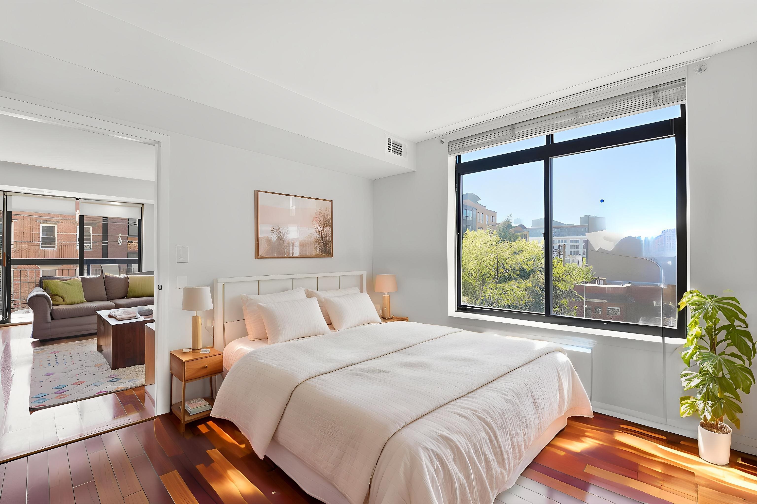 This 2 bedroom, 2 bathroom corner home offers approximately 1,268 square feet of well-designed living space, making it one of the largest two bedroom layouts in the building. With south-facing exposures and windows throughout, the home is filled with natural light from morning through the day. The open living and dining area creates a natural flow, offering a layout that feels expansive while still giving you the opportunity to make it your own. A private balcony with beautiful morning sun extends the living space. Hardwood floors run throughout, and the home is complete with an in-unit washer and dryer for everyday convenience. A full service building with a concierge, resident lounge, package room, courtyard, and bike storage. On-site parking is available for an additional monthly fee. Located near the PATH, bus, and light rail, with a dedicated shuttle service exclusive to the building. Shops, dining, and a brand new restaurant right downstairs for true Hoboken living.