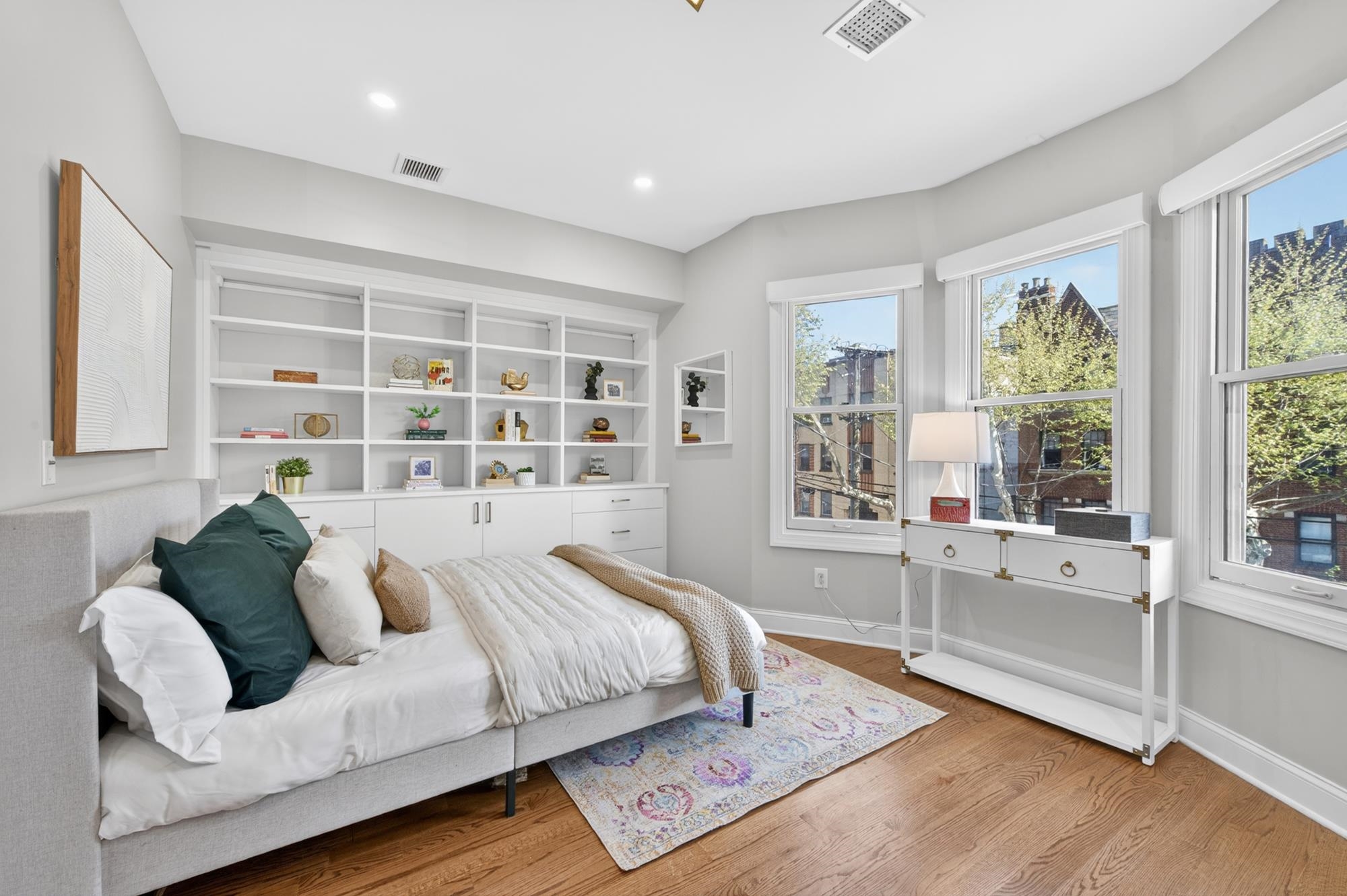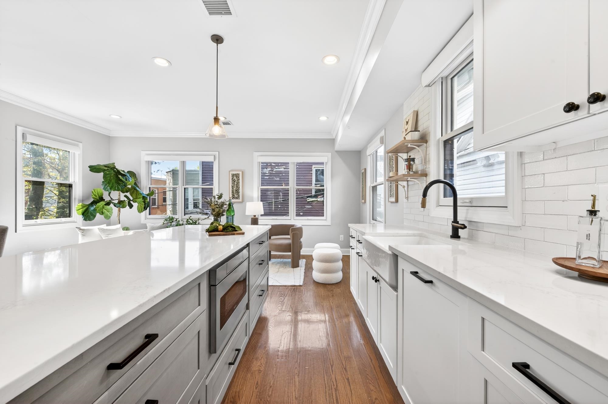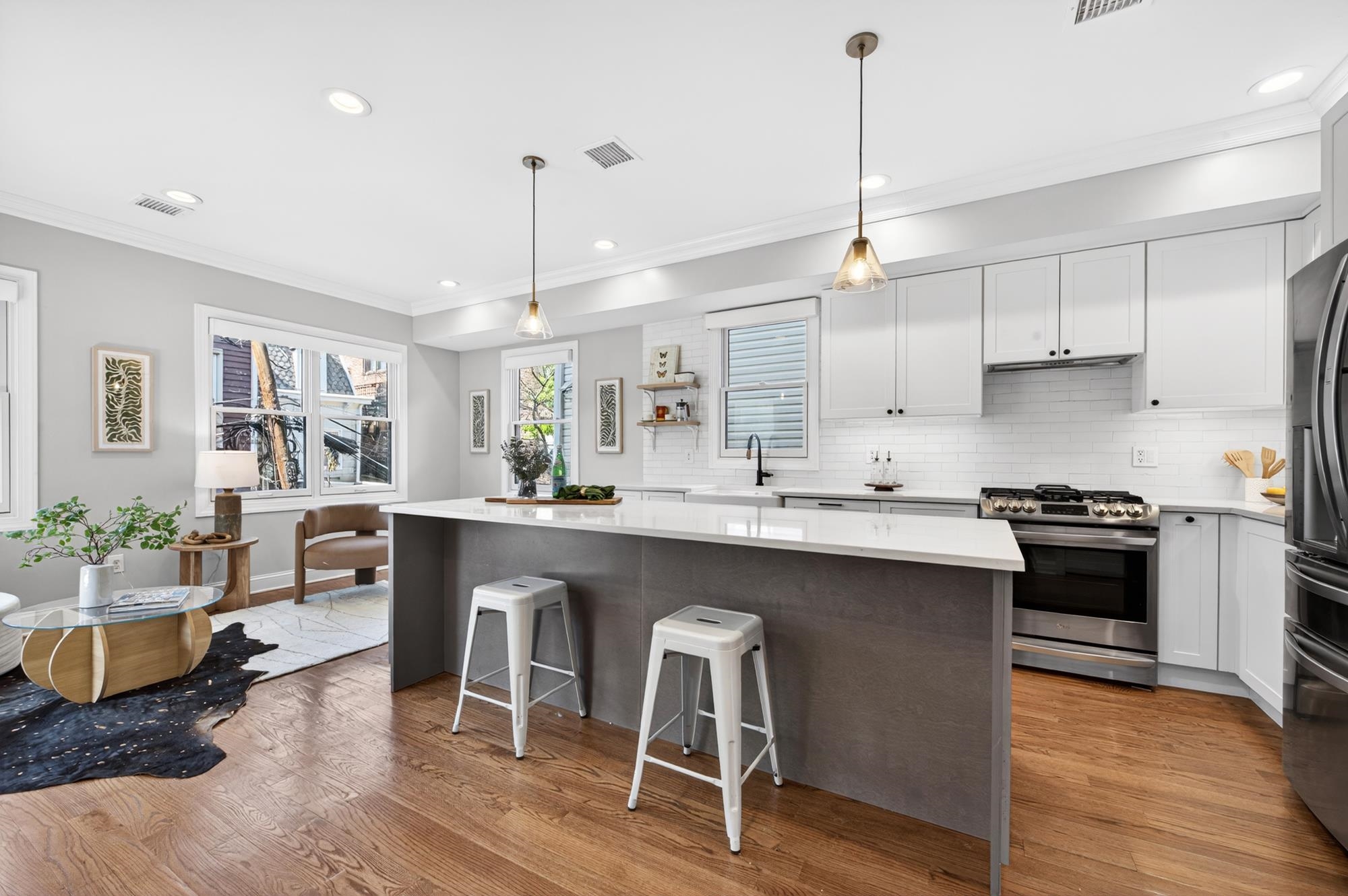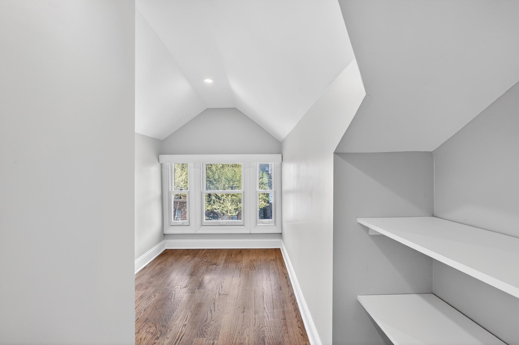 Stunning, recently renovated 3 bedroom duplex condo near Lincoln Park offering an expansive living space, with 1430+ square feet, three spacious bedrooms, two full bathrooms, and a bonus study. This home is a tasteful blend of modern renovations combined with original details, such as the restored facade, striking stained glass windows, blue stone pavers and columns. The kitchen is equipped with stainless steel appliances, a spacious island, custom cabinetry, quartz countertops, and touch-activated sink faucet, and is open to the living / dining area, framed by windows on three sides. The lavish primary suite, with views of trees on three sides, includes an en-suite bathroom and walk in closet. This sunny home has central air & heat, 9ft ceilings, four exposures, in-unit washer & dryer, hardwood floors, ample storage and is fully smart-home enabled. Situated in the coveted Lincoln Park section of Journal Square, with its 21 tennis courts, 9-hole golf course, historic fountain, sports fields, playgrounds, farmer's market, and summer concerts. Convenient access to public transportation/PATH, schools, and shopping, makes this condominium a rare gem in a highly sought-after location.