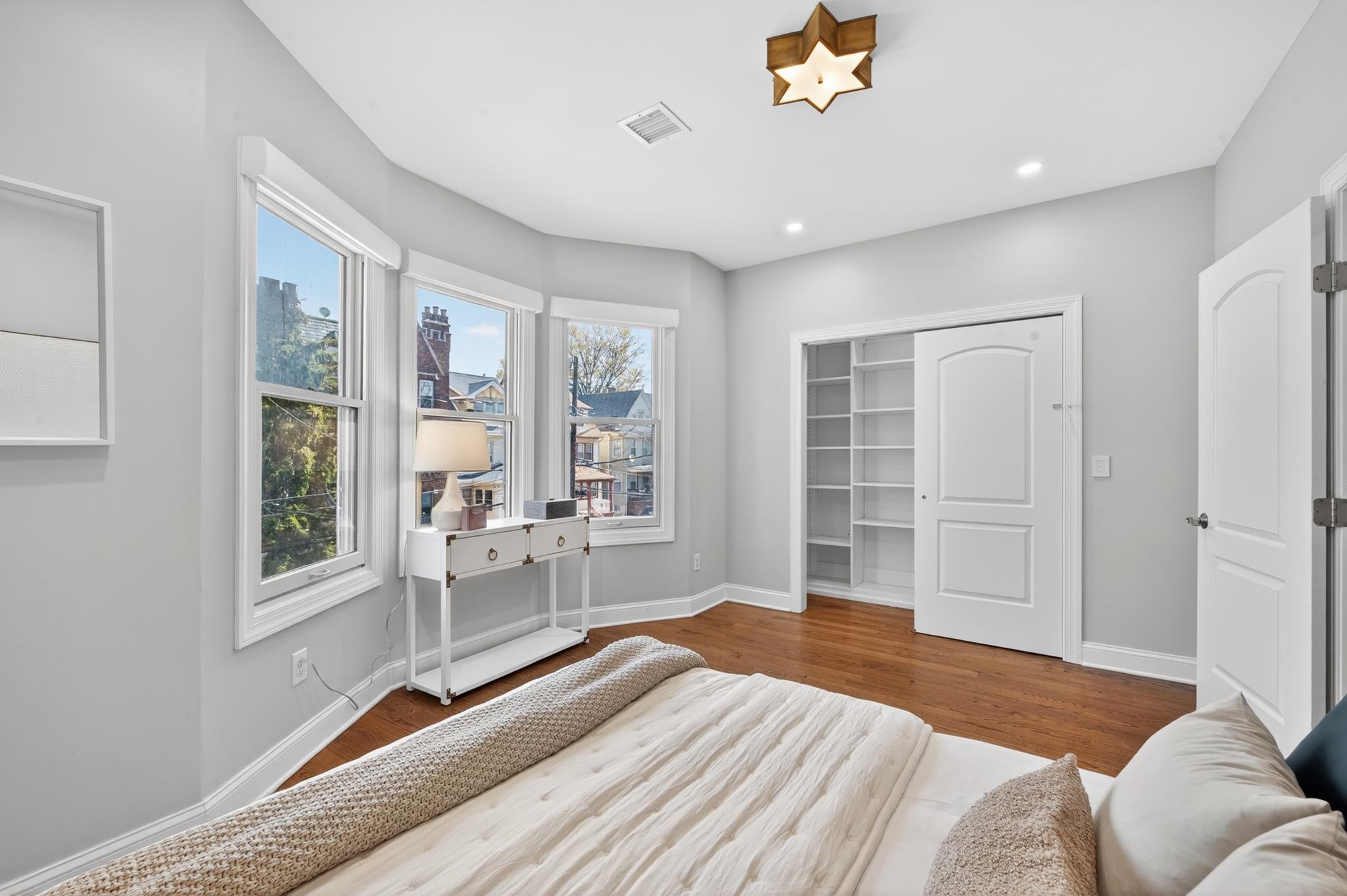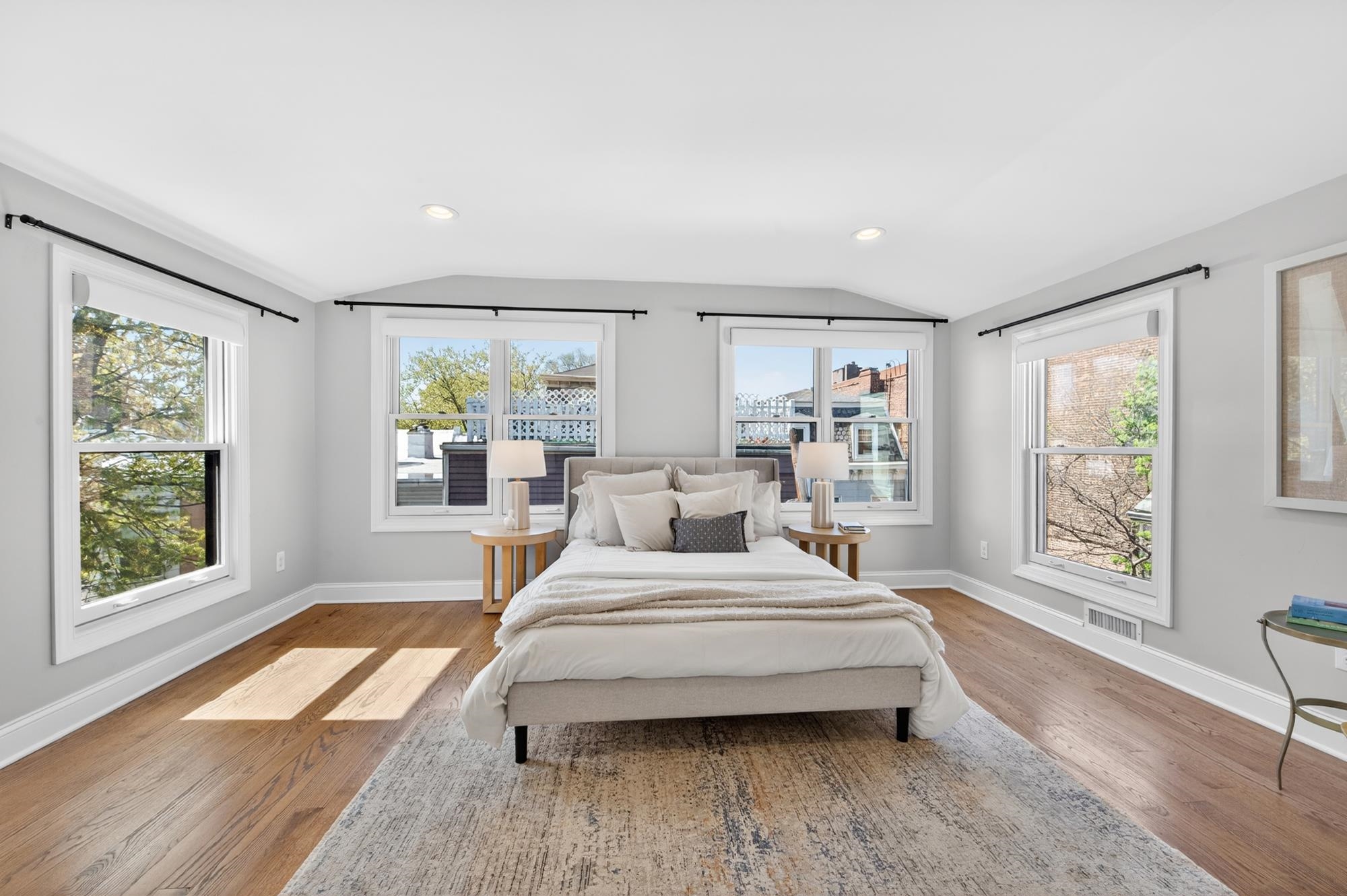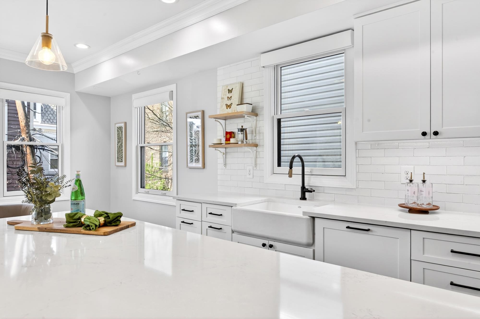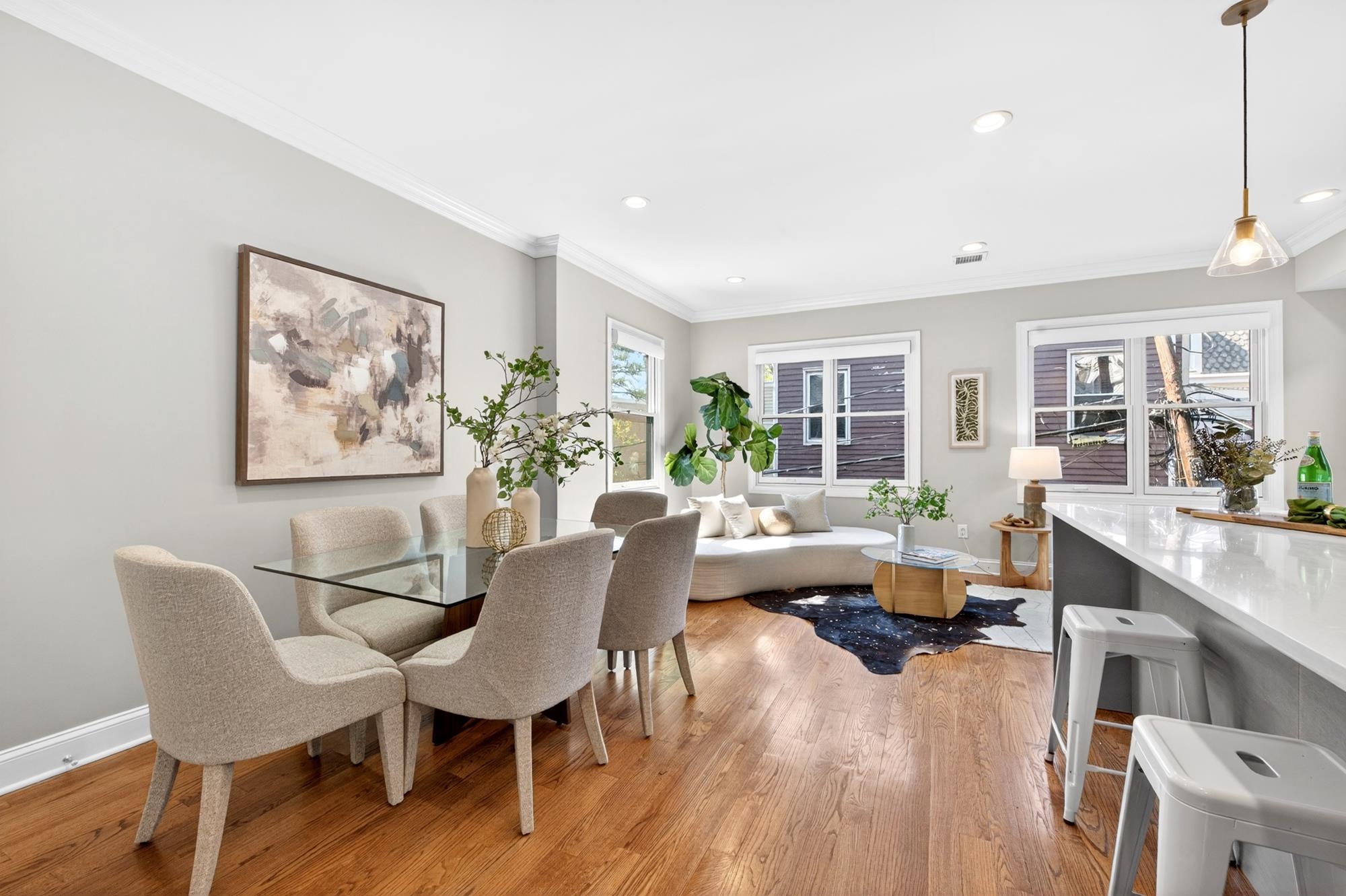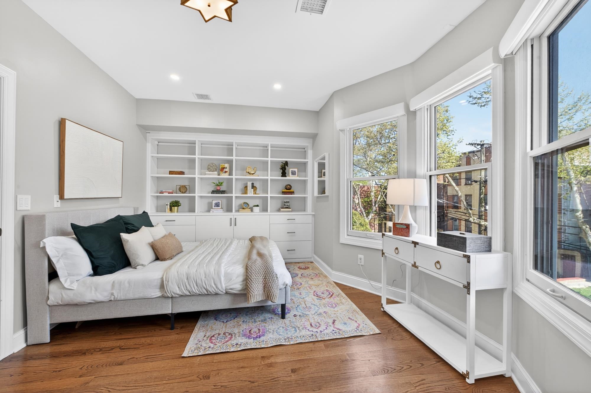 Stunning, recently renovated 3 bedroom duplex condo near Lincoln Park offering an expansive living space, with 1430+ square feet, three spacious bedrooms, two full bathrooms, and a bonus study. This home is a tasteful blend of modern renovations combined with original details, such as the restored facade, striking stained glass windows, blue stone pavers and columns. The kitchen is equipped with stainless steel appliances, a spacious island, custom cabinetry, quartz countertops, and touch-activated sink faucet, and is open to the living / dining area, framed by windows on three sides. The lavish primary suite, with views of trees on three sides, includes an en-suite bathroom and walk in closet. This sunny home has central air & heat, 9ft ceilings, four exposures, in-unit washer & dryer, hardwood floors, ample storage and is fully smart-home enabled. Situated in the coveted Lincoln Park section of Journal Square, with its 21 tennis courts, 9-hole golf course, historic fountain, sports fields, playgrounds, farmer's market, and summer concerts. Convenient access to public transportation/PATH, schools, and shopping, makes this condominium a rare gem in a highly sought-after location.