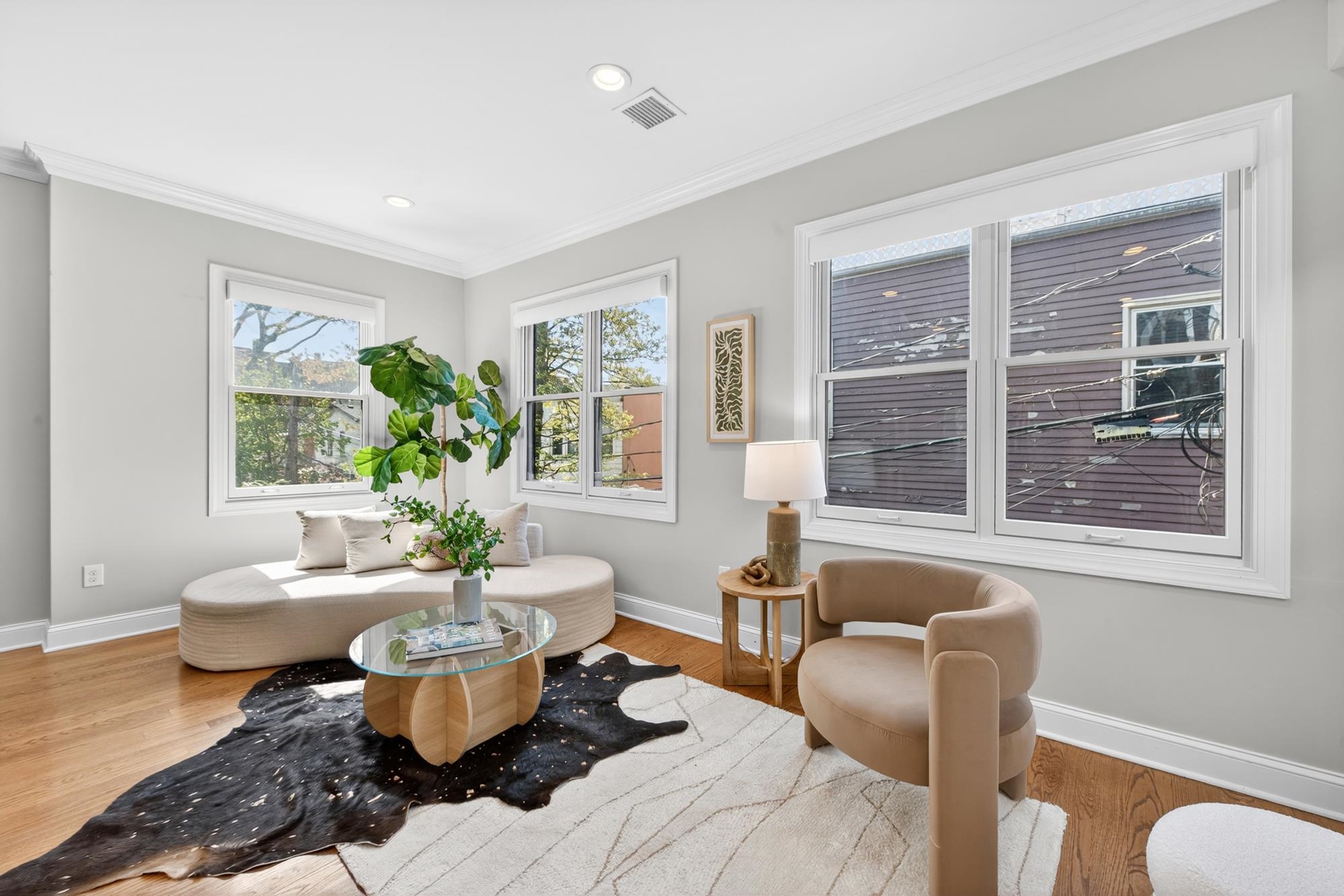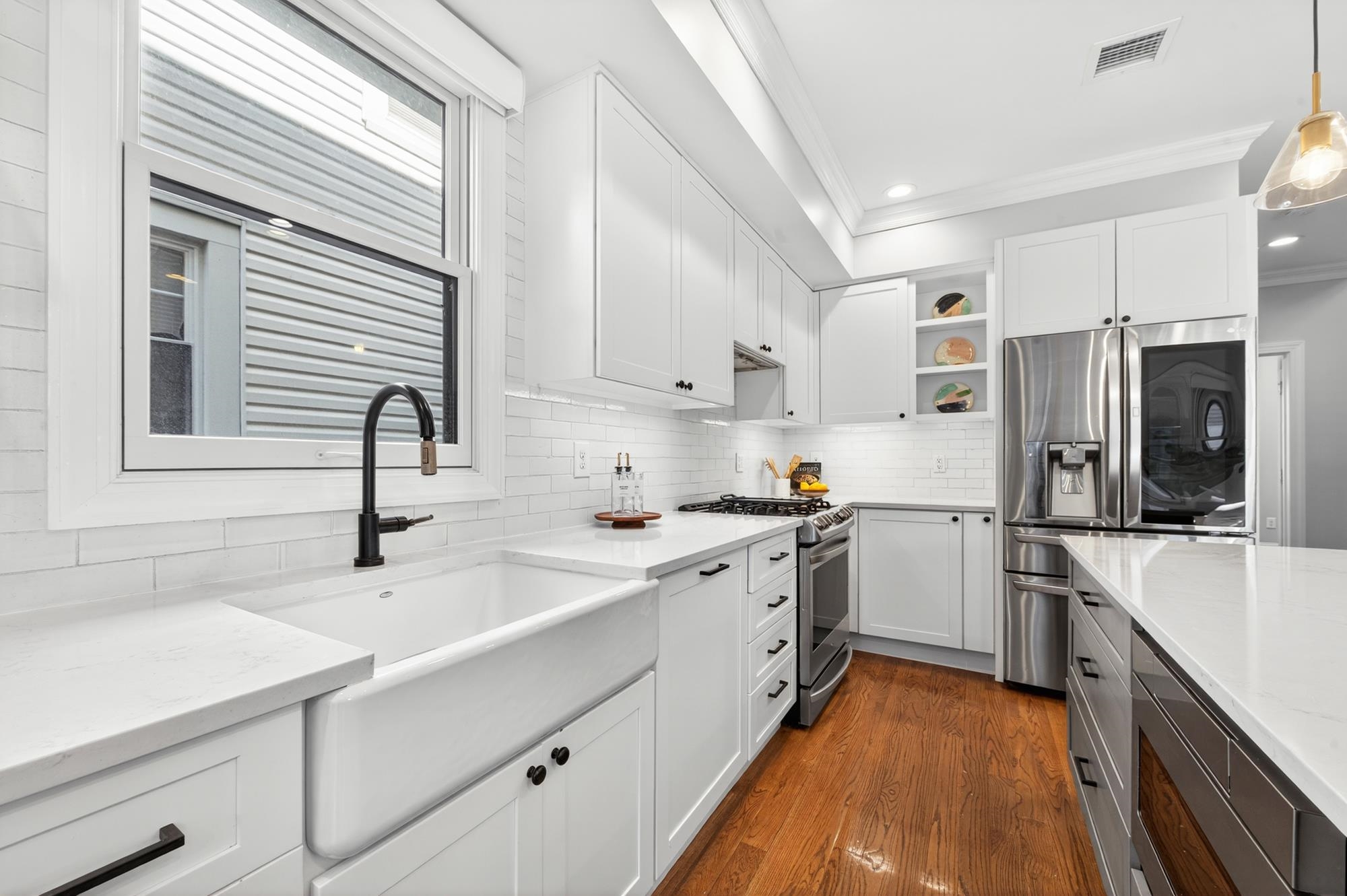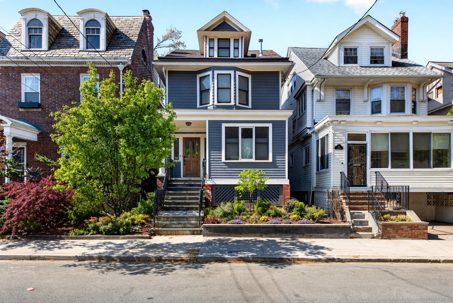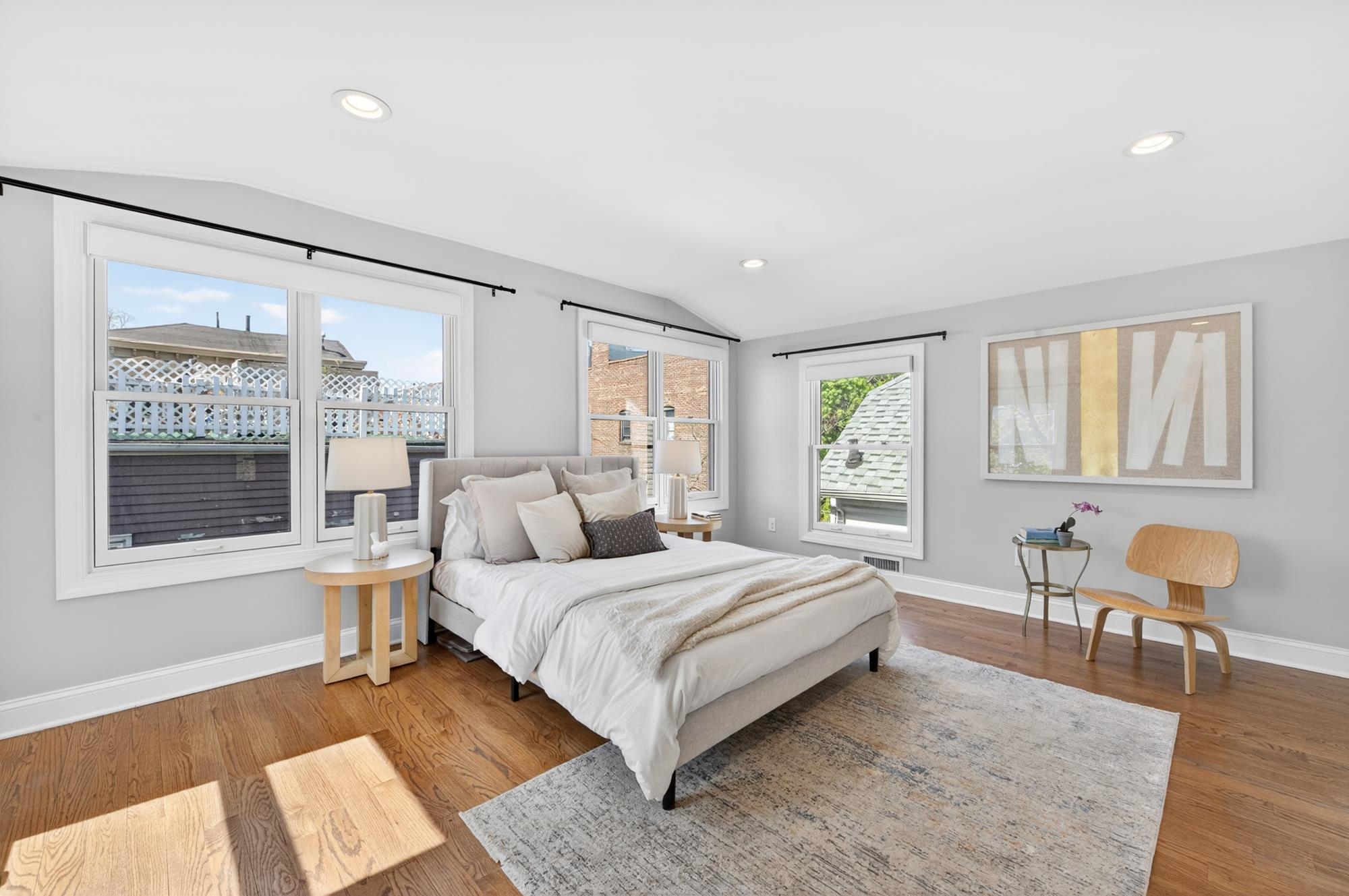 Stunning, recently renovated 3 bedroom duplex condo near Lincoln Park offering an expansive living space, with 1430+ square feet, three spacious bedrooms, two full bathrooms, and a bonus study. This home is a tasteful blend of modern renovations combined with original details, such as the restored facade, striking stained glass windows, blue stone pavers and columns. The kitchen is equipped with stainless steel appliances, a spacious island, custom cabinetry, quartz countertops, and touch-activated sink faucet, and is open to the living / dining area, framed by windows on three sides. The lavish primary suite, with views of trees on three sides, includes an en-suite bathroom and walk in closet. This sunny home has central air & heat, 9ft ceilings, four exposures, in-unit washer & dryer, hardwood floors, ample storage and is fully smart-home enabled. Situated in the coveted Lincoln Park section of Journal Square, with its 21 tennis courts, 9-hole golf course, historic fountain, sports fields, playgrounds, farmer's market, and summer concerts. Convenient access to public transportation/PATH, schools, and shopping, makes this condominium a rare gem in a highly sought-after location.