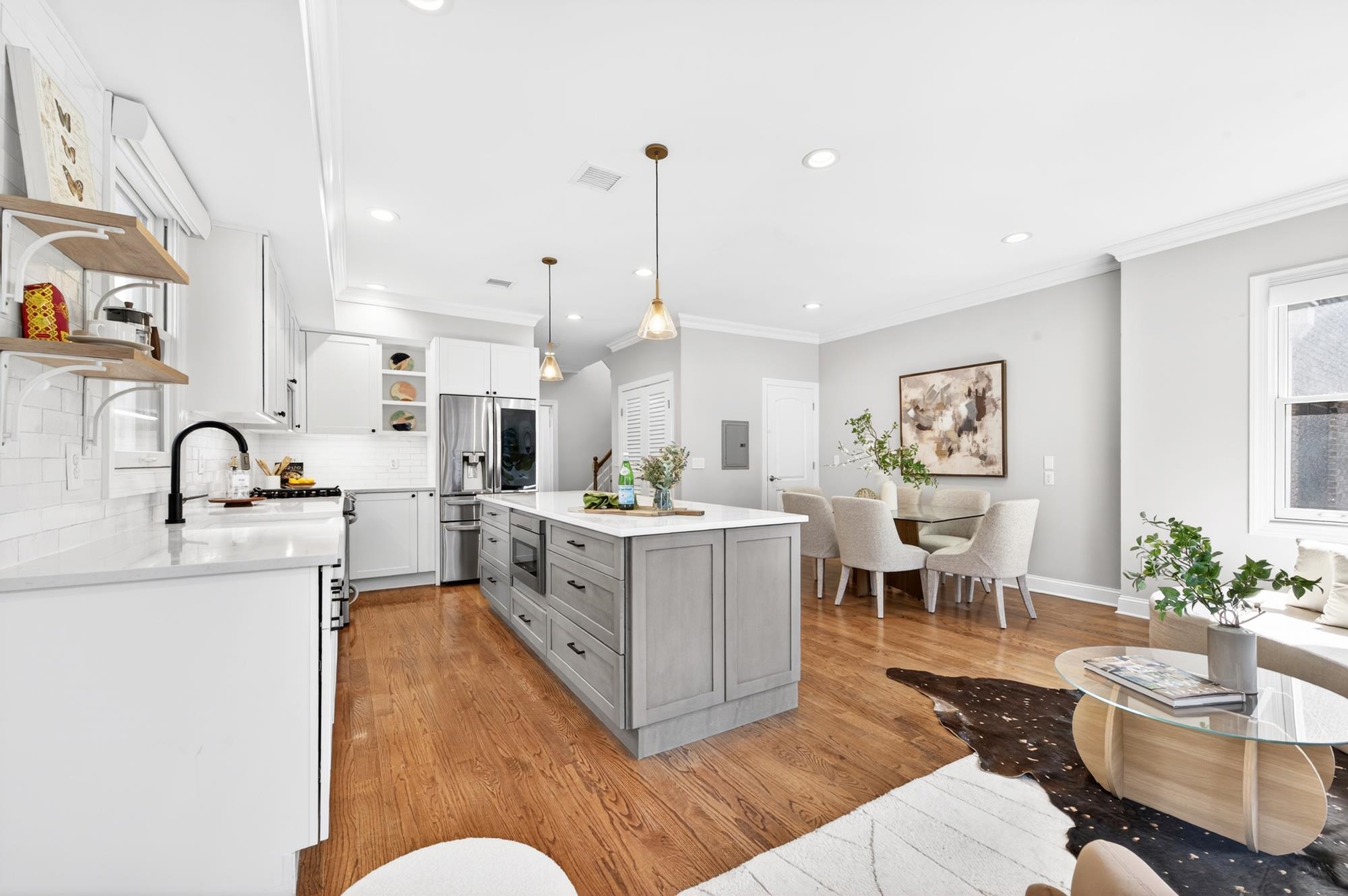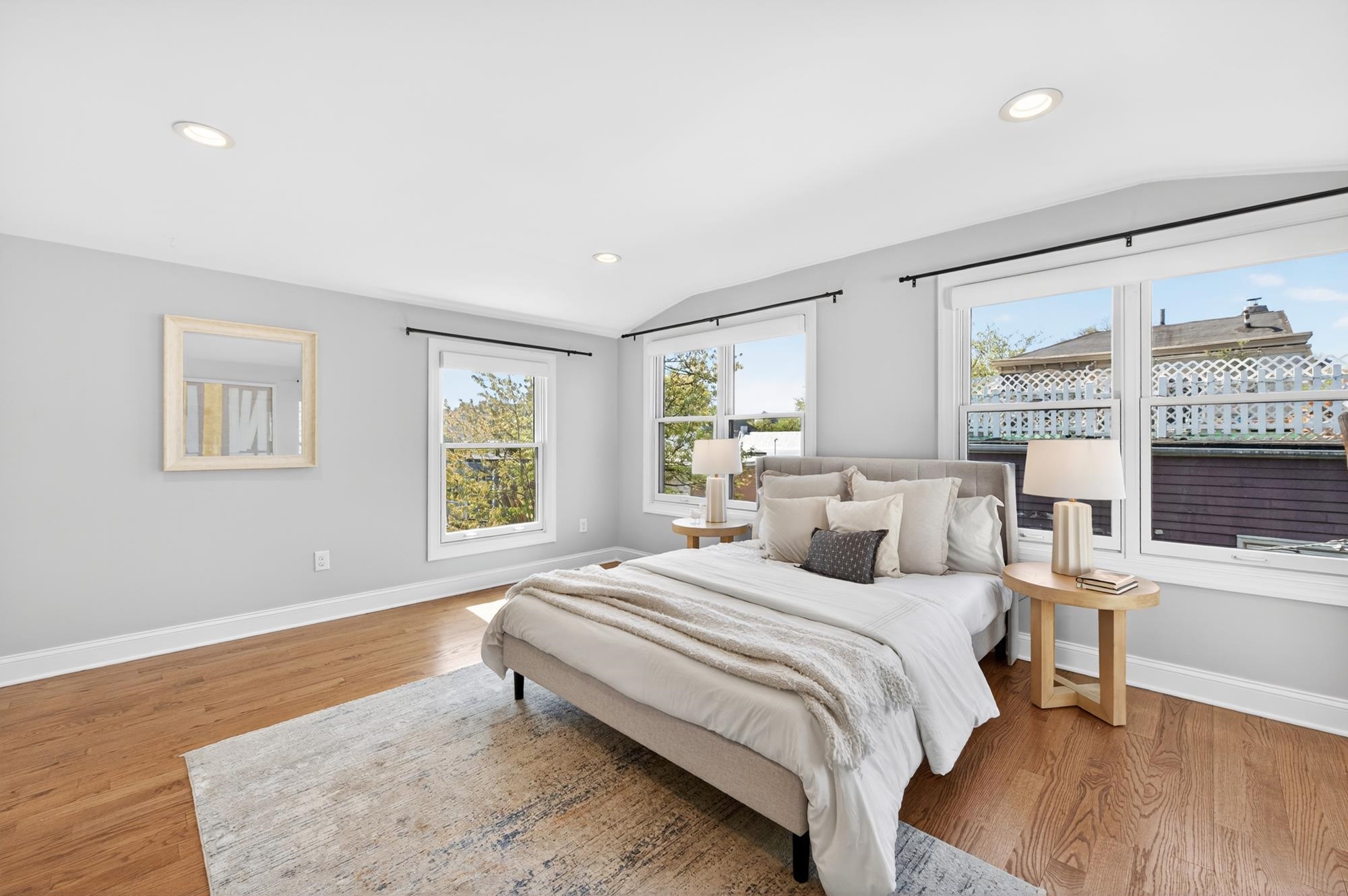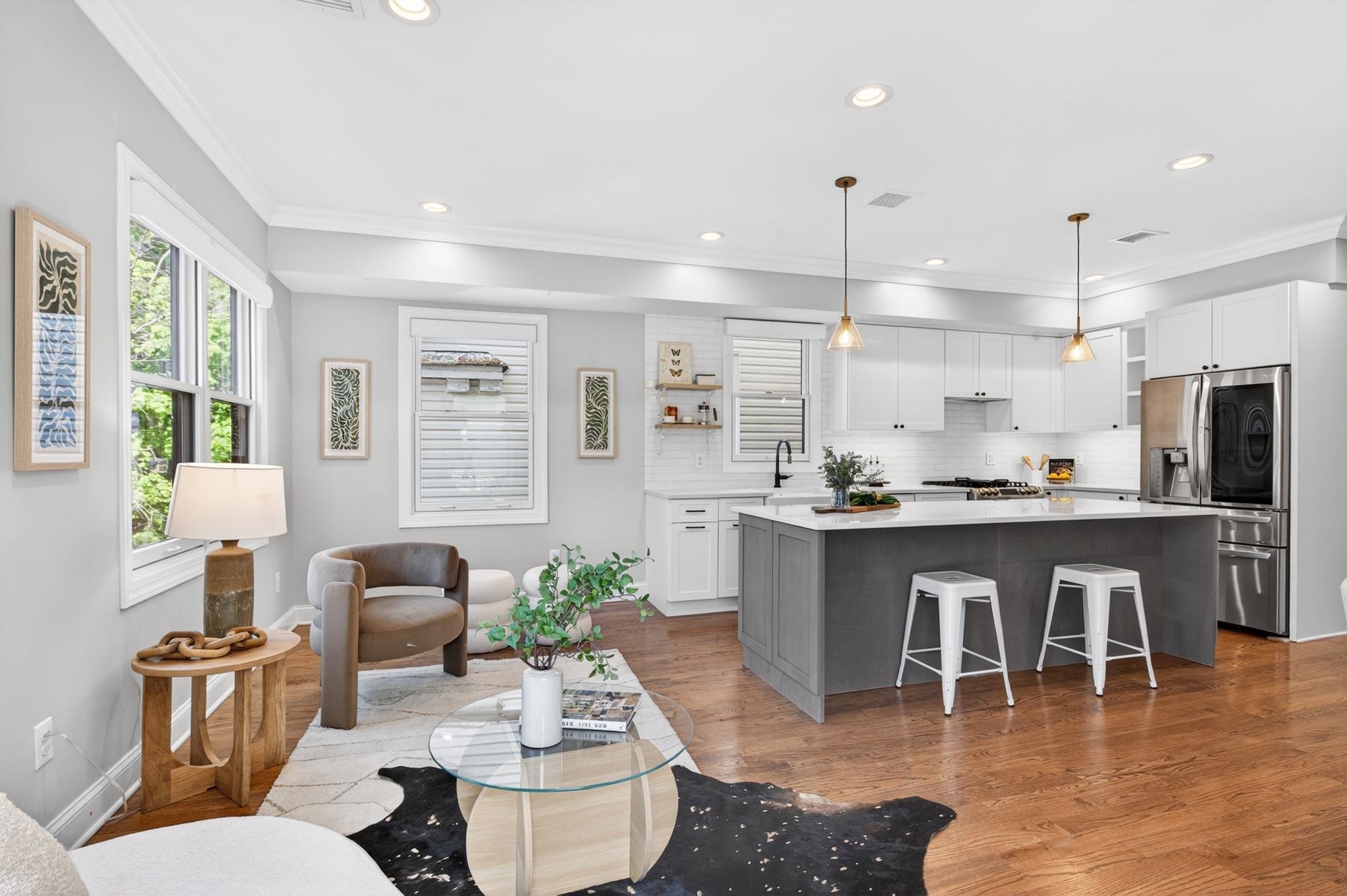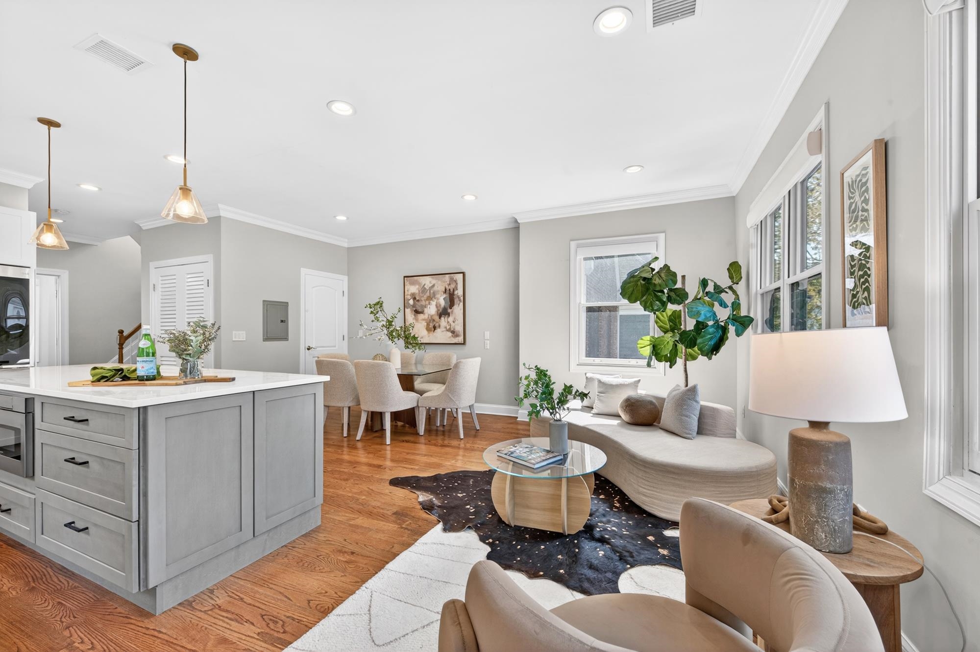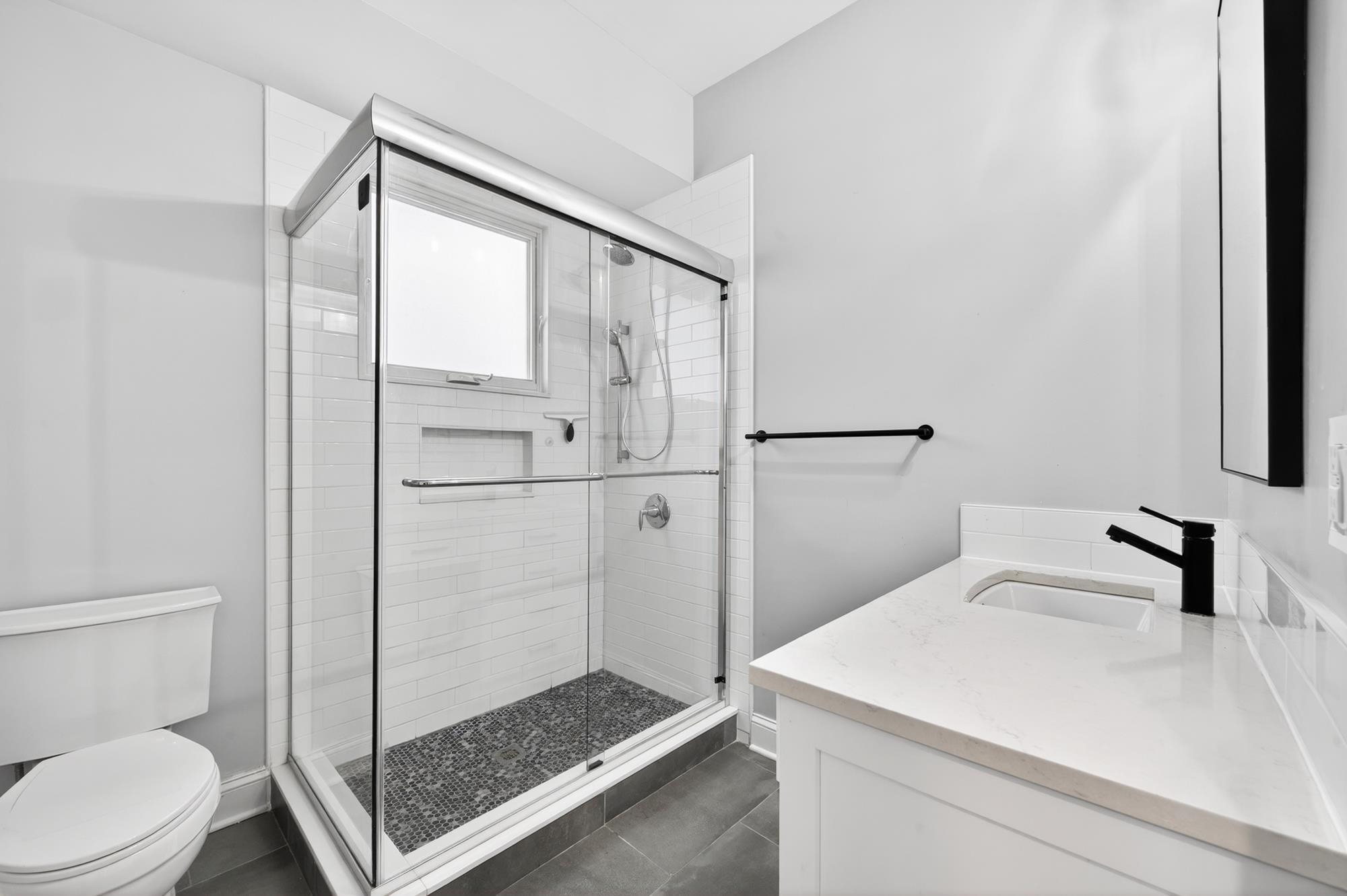 Stunning, recently renovated 3 bedroom duplex condo near Lincoln Park offering an expansive living space, with 1430+ square feet, three spacious bedrooms, two full bathrooms, and a bonus study. This home is a tasteful blend of modern renovations combined with original details, such as the restored facade, striking stained glass windows, blue stone pavers and columns. The kitchen is equipped with stainless steel appliances, a spacious island, custom cabinetry, quartz countertops, and touch-activated sink faucet, and is open to the living / dining area, framed by windows on three sides. The lavish primary suite, with views of trees on three sides, includes an en-suite bathroom and walk in closet. This sunny home has central air & heat, 9ft ceilings, four exposures, in-unit washer & dryer, hardwood floors, ample storage and is fully smart-home enabled. Situated in the coveted Lincoln Park section of Journal Square, with its 21 tennis courts, 9-hole golf course, historic fountain, sports fields, playgrounds, farmer's market, and summer concerts. Convenient access to public transportation/PATH, schools, and shopping, makes this condominium a rare gem in a highly sought-after location.