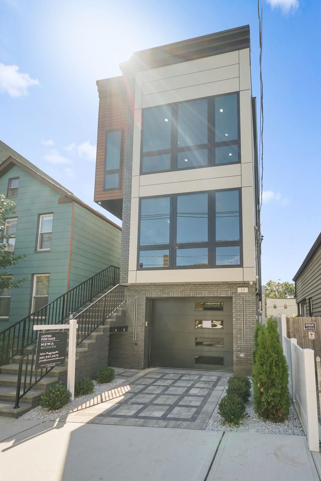 Welcome to 15 Zabriskie, This OVERSIZED 3 bedroom 2 full bath duplex unit spans an impressive 1,750 sqft, which was designed with timeless interior design, top line finishes and fixtures, quality craftsmanship and modern technological features. Â This home sits right off of Central Ave, minutes from Hoboken, Congress St Light Rail, Riverview-Fisk Park and Central & Palisades gourmet restaurants! Your main floor enters to an oversized open concept Dining & Living featuring 12 ft high walls lined with oversized Andersen windows, natural light, floor to ceiling glass accent wall and realistic flame fireplace. Â Your Chefs kitchen features top of line designer - two tone cabinetry, Thermador Stove, Thermador Heating Drawer, Panel Ready Fridge, pot filler, pantry, oversized double waterfall quartz center island and countertops backed with luxurious porcelain backsplash. The kitchen is further enhanced by the West elm accent lighting and mulitple OVERSIZED windows for plenty of natural sunlight within your kitchen. Main level features OVERSIZED Primary bedroom designed with custom millwork, bedside pendant lighting, walk in-closet with custom built ins and large picturesque private balcony. Your ensuite bath has been designed with modern yet warm natural tones to create a spa like ambience and offers double vanity, warm pendant lighting, OVERSIZED shower with multiple jets and rain fall shower head. Two additional bedrooms with finished custom closets and OVERSIZED full bath, laundry room with Top Line Washer / Dryer complete your main level. Your upper floor level enters from a recessed lit staircase which includes wet bar backed with custom backsplash, recessed lighting and wine fridge. This leads out to an oversized rooftop with turf and NYC views, gas / electric and water hook ups making it perfect for entertaining and creating memories. Full Smart Home technology allows for ease of living, complete with Google Nest doorbell, Security Cameras, Google Smart Hub, Smart Thermo and Smart Touch Screen Switches, Lighting Dimmer Switches, and more all accessible via smart phone. Garage features OVERSIZED SIDE BY SIDE parking and separate Level 2 High Voltage EV Charging outlet for each unit. Home is complete with exterior facade and recessed driveway lighting and landscaping. Please note that sqft is approx. New Home Warranty and Tax Abatement.