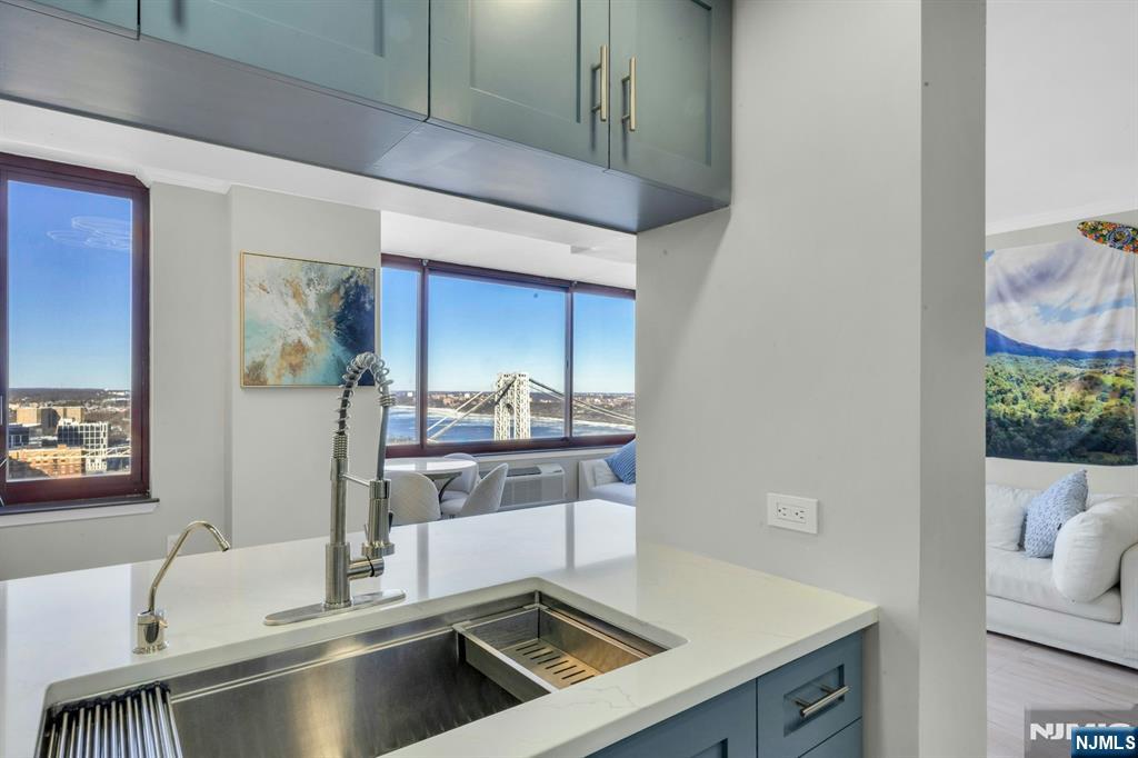 Beautiful high floor one bedroom residence on the 39th floor. The Palisades luxury condominium with breathtaking GWB, Hudson River and NY views. Brand new renovation with new flooring, ceilings, kitchen, bathroom with walk-in shower. Expansive windows provide abundant natural light and spectacular skyline views. Full service building offering 24 hour security, visitors valet, fitness center, children's playroom, community room and library. One deeded indoor parking space. Beautiful outdoor pool with stunning varanda overlooking NYC. BBQ area. Pet friendly. Conveniently located to lively downtown Fort lee with easy access to restaurants, shopping and NYC transportation.
