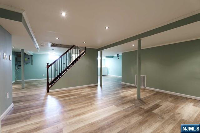 Welcome to this beautiful 3-bedroom, 2.5-bath home in a prime location! The first floor features an entry foyer, living room, a large eat-in kitchen with stainless steel appliances, a spacious family room with sliding doors to the patio, two bedrooms, and a fully updated bath. The second floor offers a large bedroom and a full bath. The beautifully renovated basement includes a large rec room, half bath, and laundry area. Enjoy hardwood floors throughout, an attached garage, and a great backyard with a large patio. Conveniently located near houses of worship, NYC trains, shopping, the library, and the town hall. This property also has great potential for future improvements. Don't miss out on this fantastic opportunity!