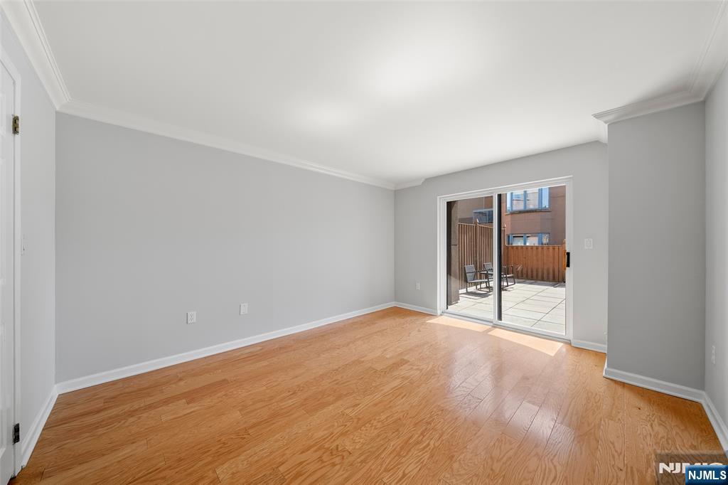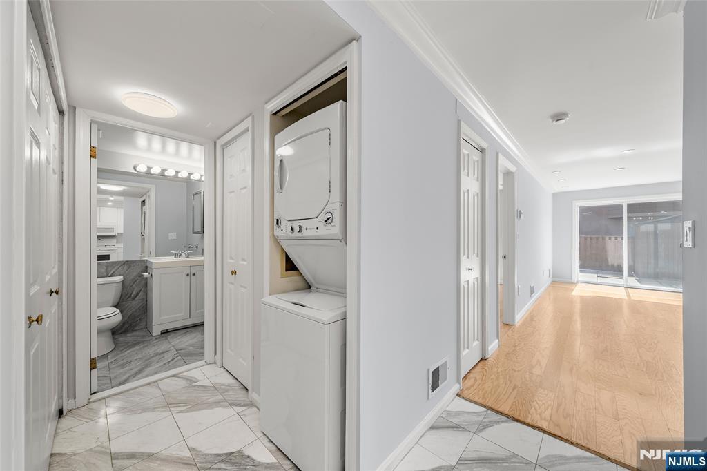 Independence Harbor, a 24-hour gated waterfront community. 1BR, 1 Bath, Features hardwood floors, walk-in closet, large window, modern kitchen with newer appliances, newer washer/dryer, and bath with whirlpool tub. New light fixtures, enjoy a large private patio with storage shed. Amenities include outdoor pool, jacuzzi, gym, tennis courts, clubhouse, play area, and direct access to Hudson River walkway. Easy NYC commute with bus and ferry at entrance. Includes 1 covered parking space (#418). Unit freshly painted, cleaned and move-in ready!