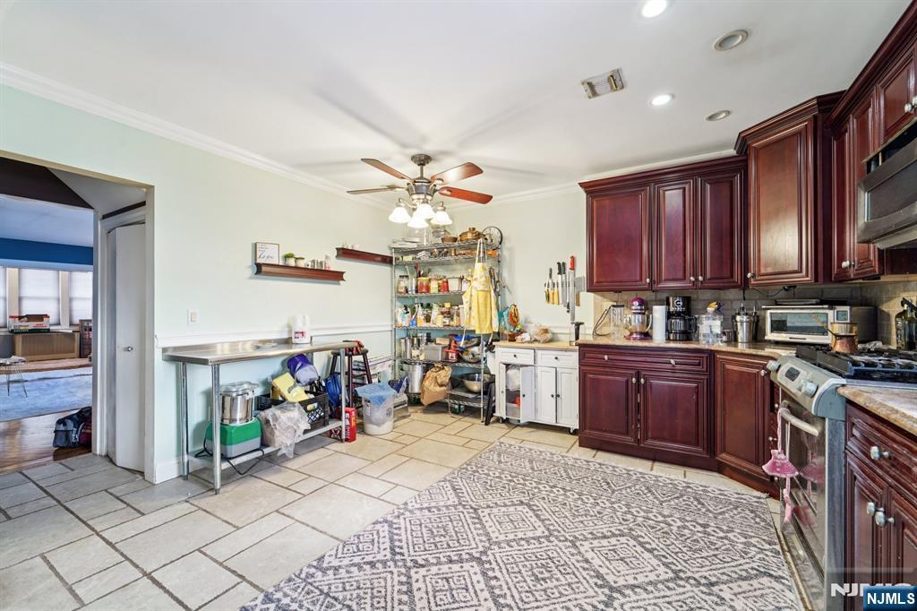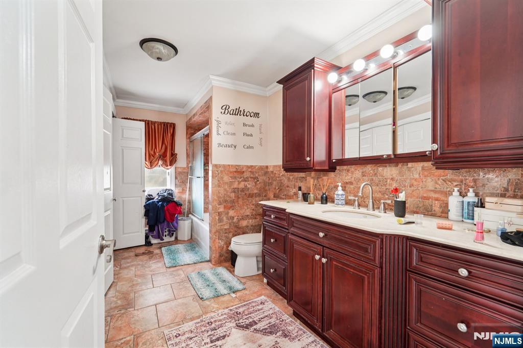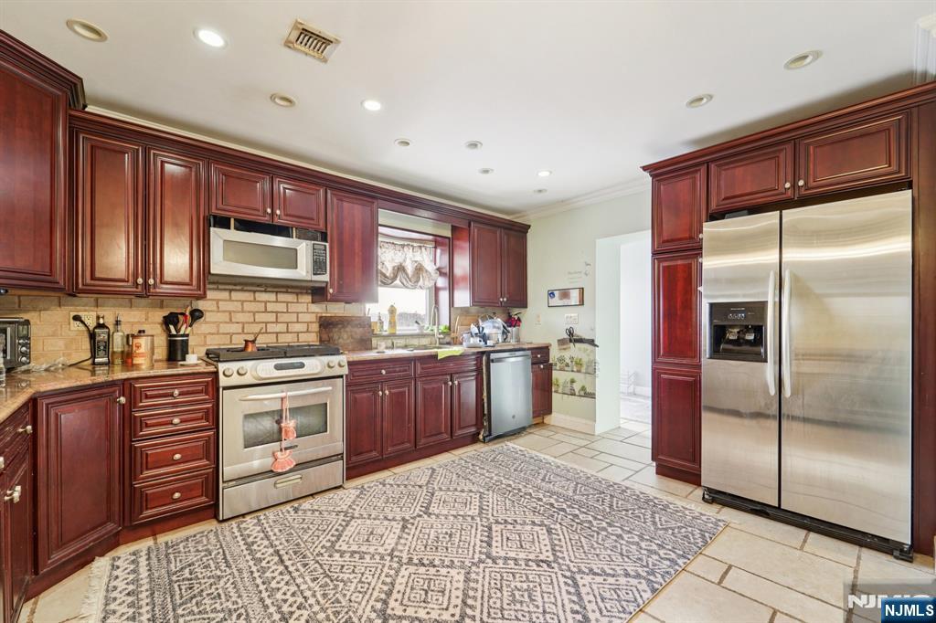 Unique two-family home offering a spacious first-floor unit featuring an entry foyer, large living room/dining room, modern eat-in kitchen with granite countertops, custom backsplash, custom cherry wood cabinetry, pantry, and stainless steel appliances. The first floor also includes a spacious bedroom with two closets, a family room, full bathroom, and access to a rear deck. The second-floor unit offers a kitchen with pantry, two bedrooms, and a full bathroom. Additional highlights include a finished attic, finished walk-out basement, two-car detached garage with driveway parking, and a large fenced-in yard. Conveniently located close to NYC transportation, shopping, and dining.