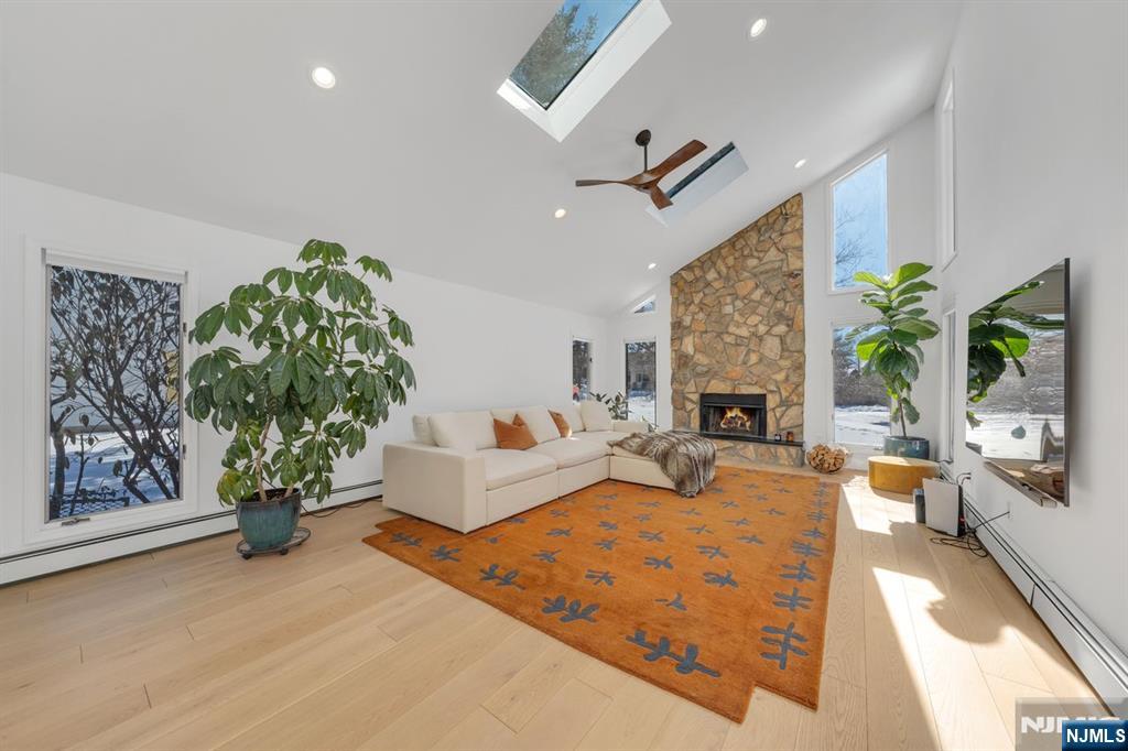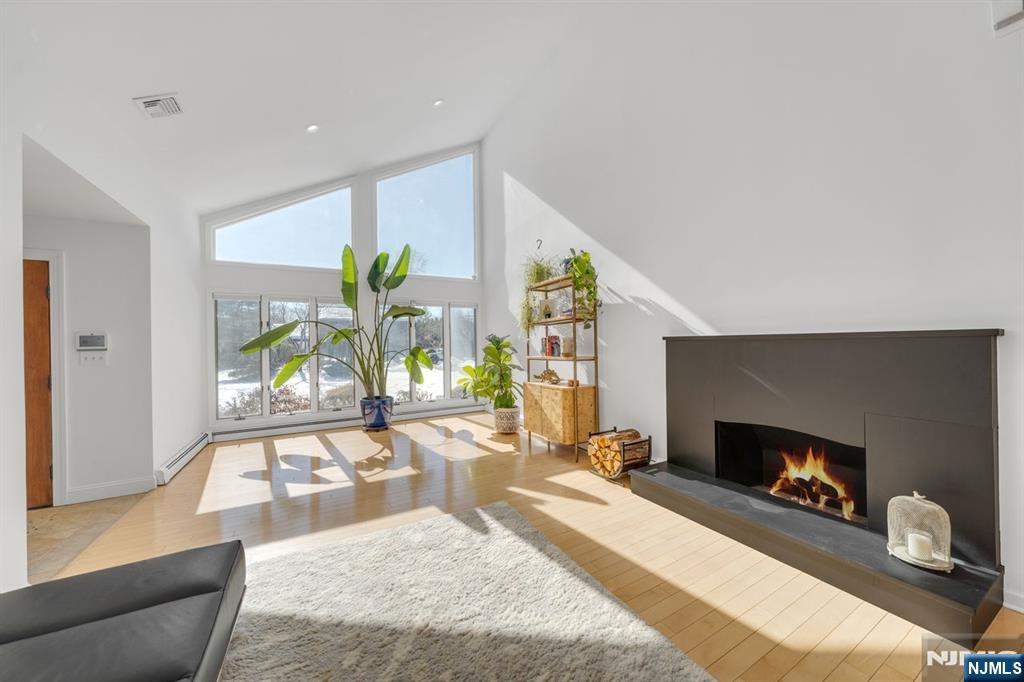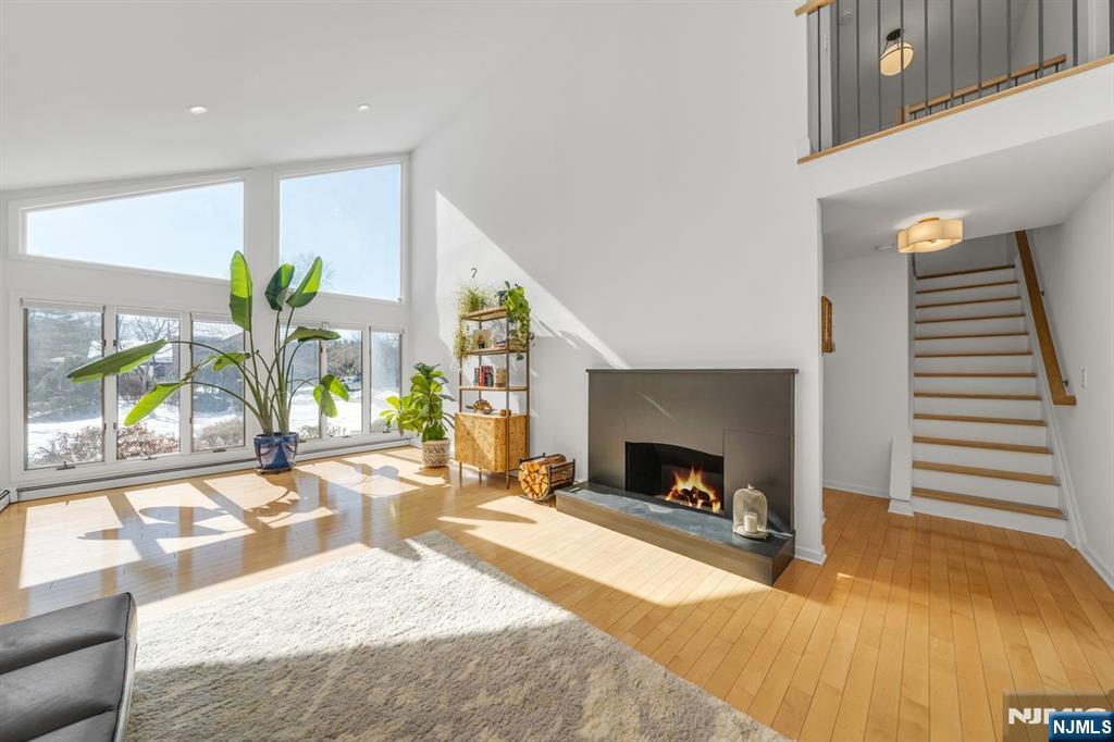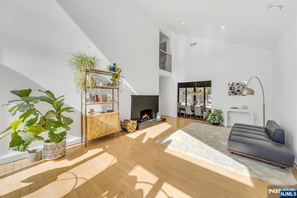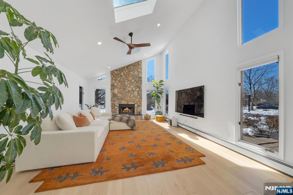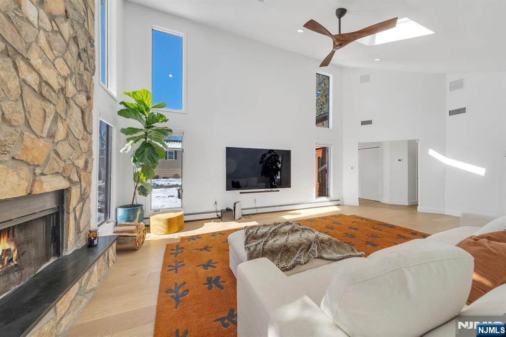 This exceptional South facing 4 bdrm, 3 bath contemporary residence is tucked away on a peaceful cul-de-sac, offering a perfect blend of style, and comfort. A wraparound driveway leads to a welcoming entry foyer that sets the tone once you step inside. The home has been thoughtfully updated with brand-new hardwood floors, new interior doors, fresh paint, new recessed lighting, new furnace and hvac system. The expansive living room is filled with natural light from floor to ceiling windows and skylights, anchored by a stone fireplace that creates a warm atmosphere. Just off this space, you'll find a convenient first-floor bdrm and full bath. The main living room showcases cathedral ceilings and an additional fireplace, flowing seamlessly into a sunken formal dining area designed for intimate dinners and gatherings. The adjacent kitchen is thoughtfully appointed with stainless steel appliances, custom cabinetry, dual wall ovens, a center island cooktop, and granite countertops. The first floor primary suite offers privacy and comfort, complete with a seated vanity, glass enclosed shower, and a relaxing jacuzzi tub. Upstairs, two generously sized bedrooms share a full bathroom with a storage vanity and glass enclosed shower. Outside, the spacious backyard serves as your own oasis with a large deck and jacuzzi, perfect for entertaining or simply unwinding. The fenced in yard offers plenty of room for outdoor enjoyment. Conveniently located near Whole Foods, Lidl, and NJ transit!