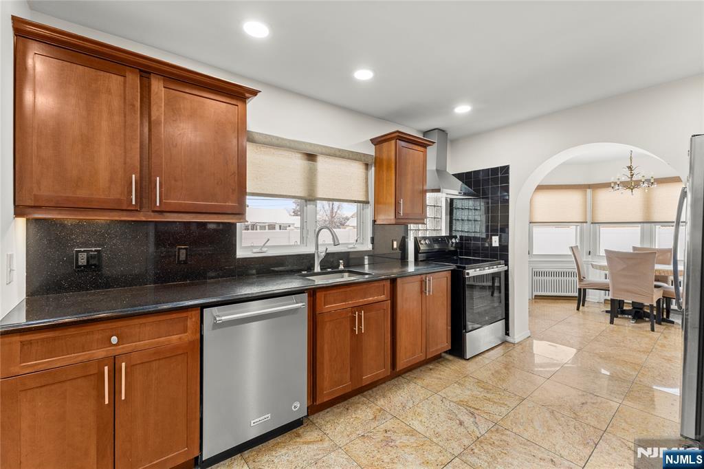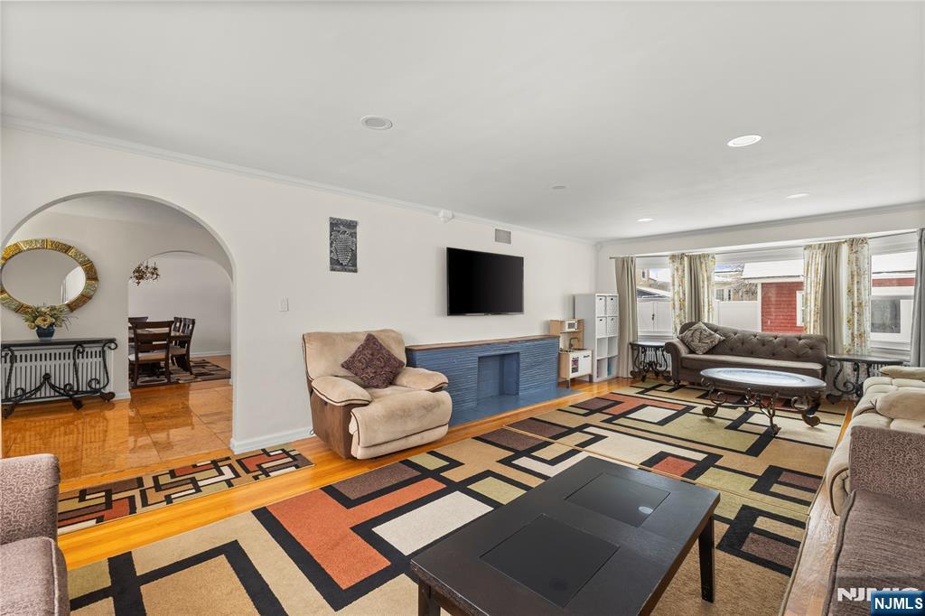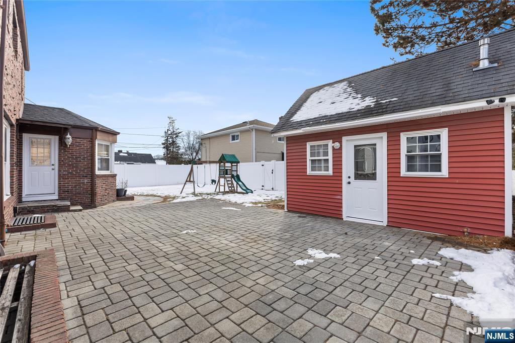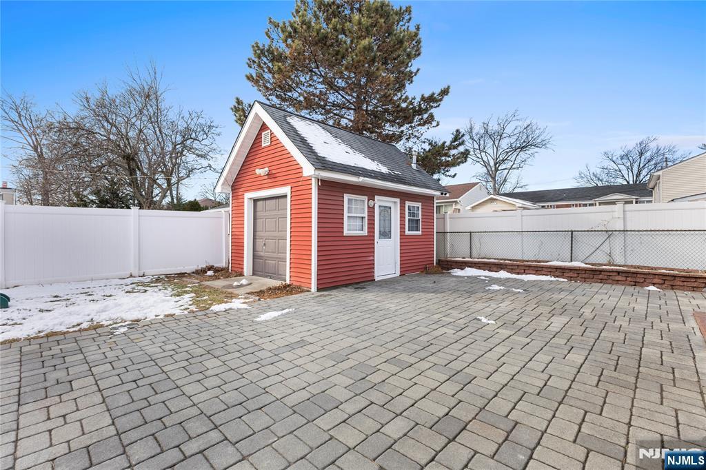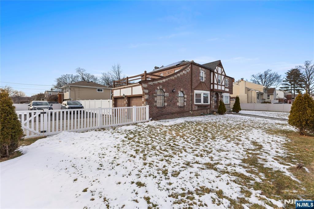 Stately 2,679 sq. ft. Tudor-style brick colonial offers exceptional space, character, and convenience in the heart of Elmwood Park, NJâ€â€just 14 miles from New York City and close to train stations, major roadways, and shopping. Featuring 5 bedrooms, 3 full baths, and 1 half bath, the home welcomes you with a blend of hardwood and granite flooring throughout. A grand living room stretches generously across the main level, highlighted by dramatic decorative windows at both ends that bathe the space in natural light. A charming breakfast nook extension adds warmth and charm with its arched doorways and built-in decorative shelving. The kitchen is outfitted with granite floors, granite countertops, and an exhaust system vented outside. The fully finished day light basement is an entertainer’s dream, offering an expansive open layout with tiled floors, a wall-length bar with sink, a full bathroom, and direct access to the backyard. The exterior features are equally impressive, including a paver driveway that accommodates up to six cars, a two-car garage with a newly epoxy-coated floor, and a fully fenced yard. A standout bonus is the oversized storage shedâ€â€more like a small cottage complete with tiled floors, heat, electricity, and attic storage, making it ideal for a workshop, studio, or hobby space. With its timeless architecture, generous layout, and unbeatable location, this remarkable home offers both everyday comfort and easy access to all that Elmwood Park has to offer
