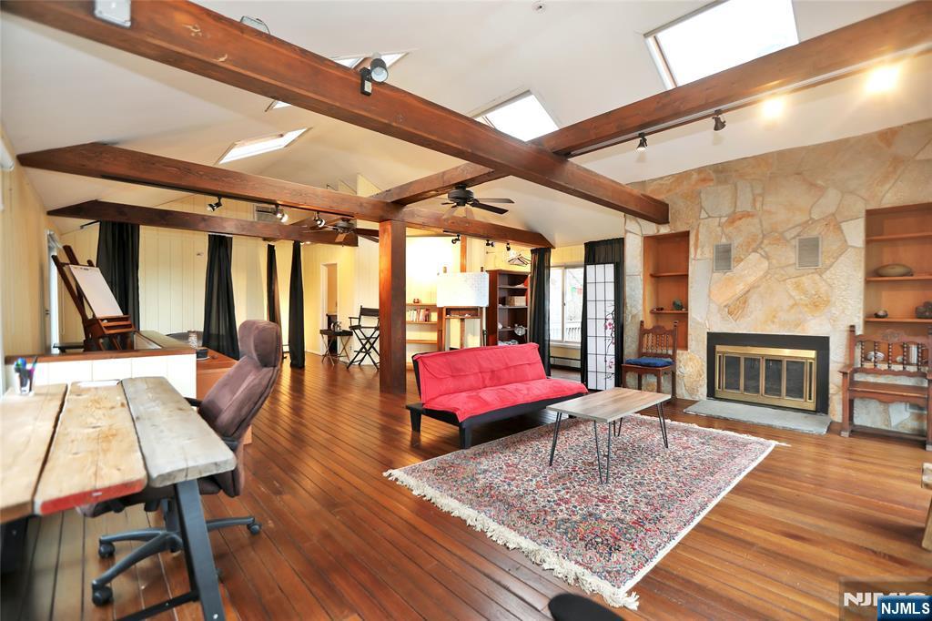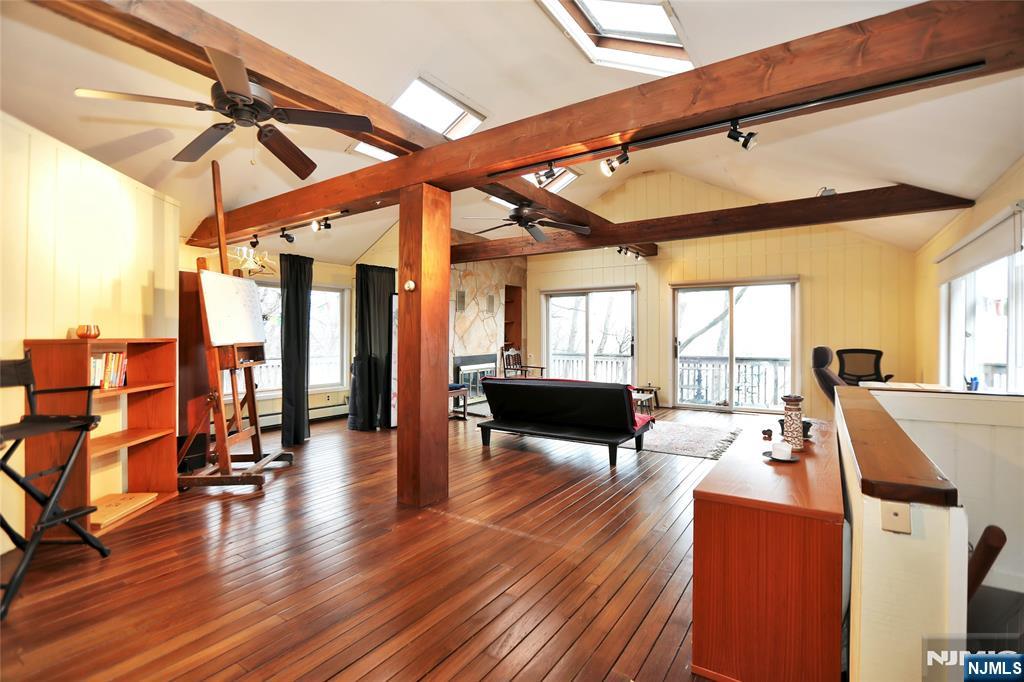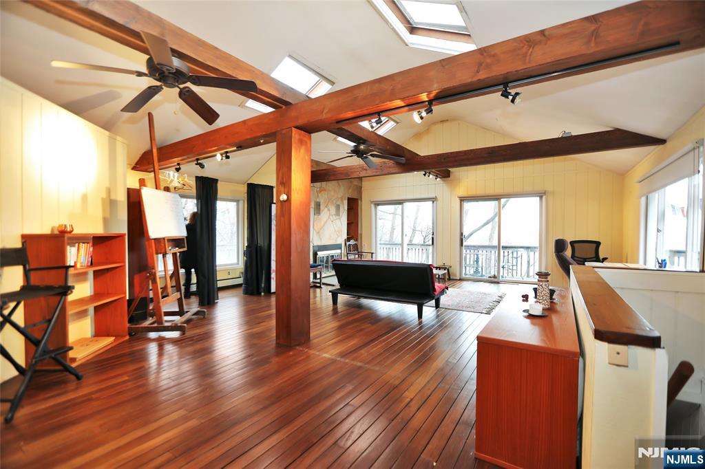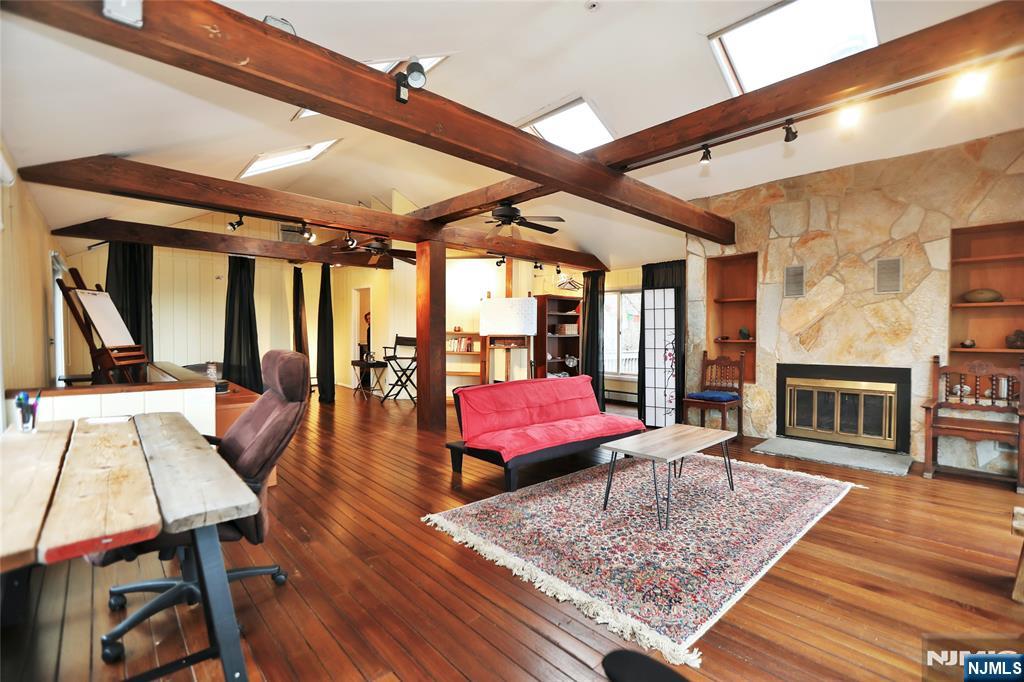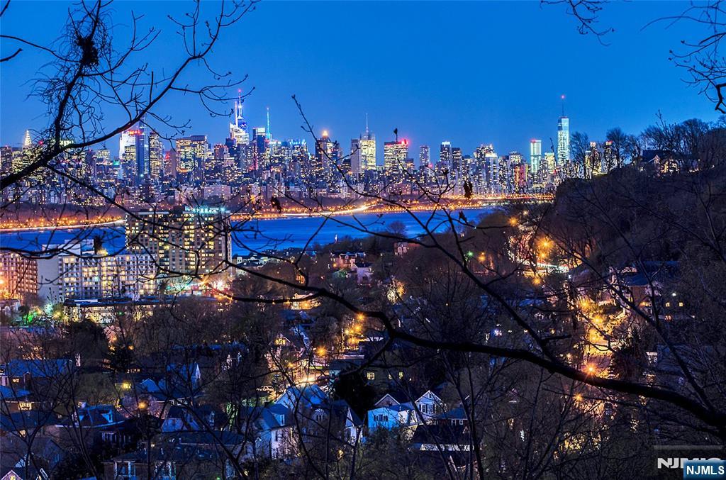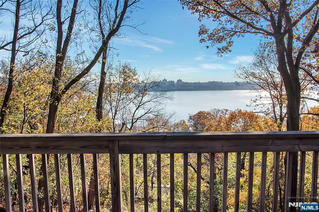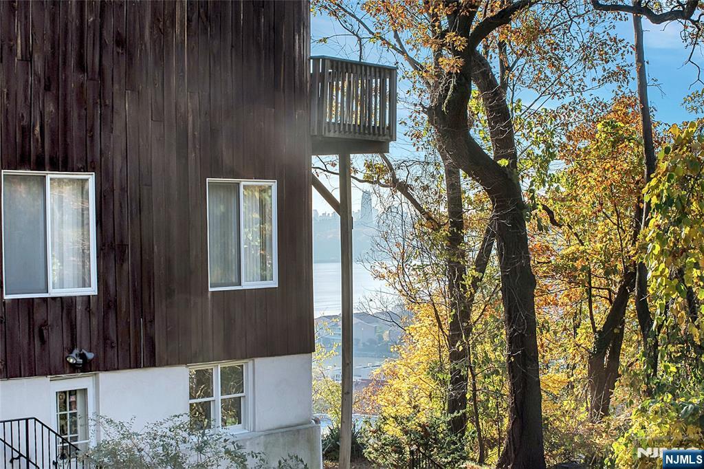 It has fabulous views of NYC and it is in the woods. Views--with trees and privacy in Fort Lee-it is a miracle. House has 2 bedrooms on 1st floor and an open bedroom loft on the 2nd floor.. Enter a spacious, cozy living room with fp facing the Hudson, 2 bedrooms, 1 full bathroom. One flight of steps down--large den, dining area, large kitchen with door to woods. 3rd floor-LOFT ROOM as large as the house with a deck facing the Hudson, full bathroom. Property is approximately 3/4 of an acre, part of the property is in Edgewater. Edgewater taxxes are $1350.00.
