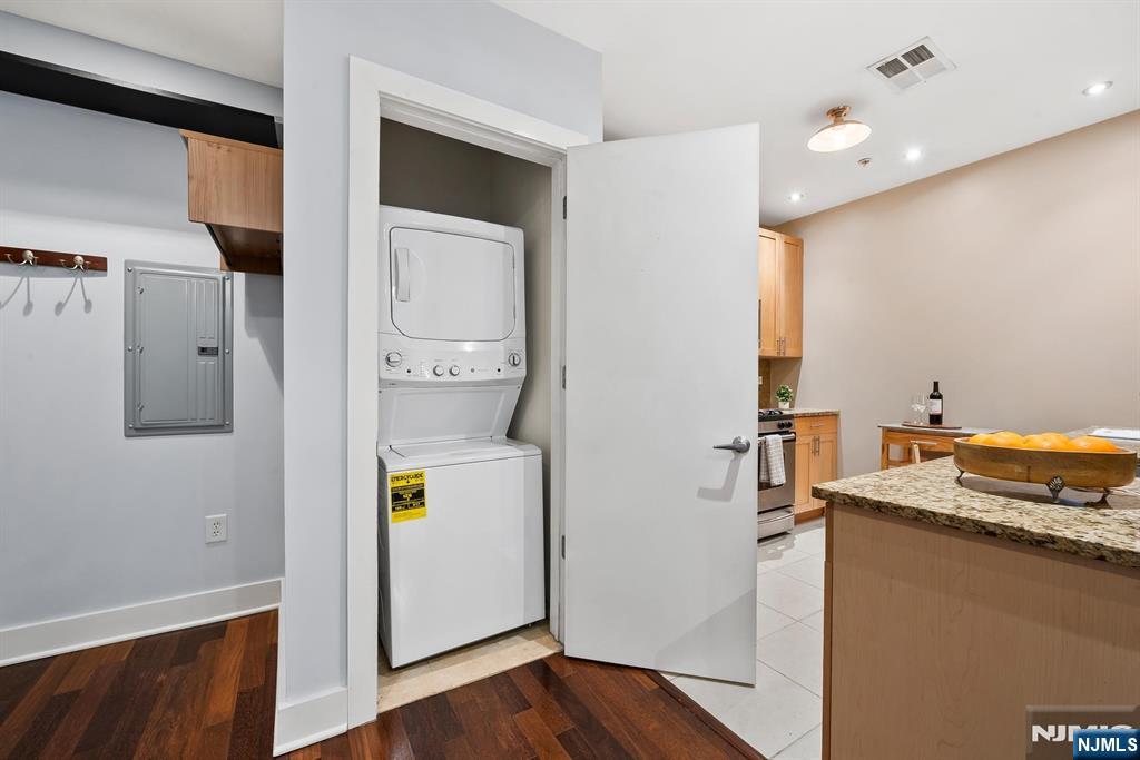 Welcome to the award-winning Waldo Lofts, ideally located in the highly coveted Powerhouse Arts District of Downtown Jersey City. This expansive 1-bedroom residence offers a striking open-concept layout complemented by a private balcony, perfect for both everyday living and entertaining. Inside, the home showcases rich hardwood flooring, soaring loft-style ceilings, and dramatic floor-to-ceiling windows that flood the space with natural light. The thoughtfully designed gourmet kitchen features granite countertops, a raised breakfast bar, stainless steel appliances, and a dishwasher, blending style and functionality seamlessly. Additional comforts include an in-unit washer and dryer and central HVAC, completing this exceptional home. Residents of Waldo Lofts enjoy a full suite of premium amenities, including a well-equipped fitness center, package room, bike storage, secure key-fob access, and an attentive on-site superintendent available five days a week, along with building cleaning services six days a week. Recent building enhancements include a state-of-the-art video intercom system. Verizon Fios, and utilities such as heat, hot water, and gas are included in the HOA. Conveniently located near the Grove Street PATH Station, commuting to New York City is effortless, while the surrounding neighborhood offers some of the best dining, shopping, and nightlife in Downtown Jersey City, making this a truly elevated urban lifestyle.