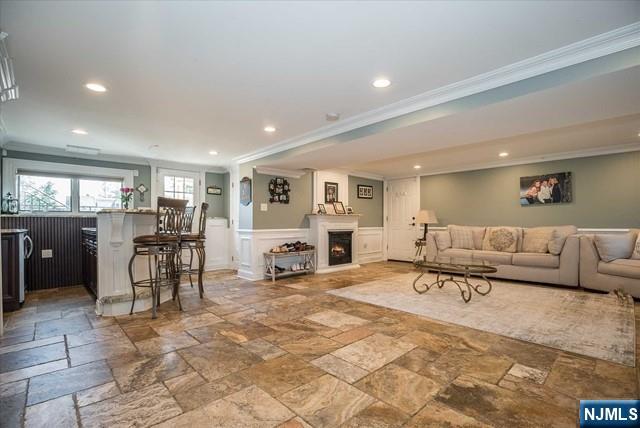 Spectacular custom home featuring a stunning stucco and stone fa ade, brick paver driveway, and walkway. The impressive two-story living room showcases a dramatic stone accent wall with fireplace, while the custom modern eat-in kitchen offers vaulted ceilings, an oversized center island, granite countertops, and top-of-the-line appliances. A formal dining room with coffered ceilings adds elegance for entertaining. The primary suite includes two walk-in closets and a luxurious spa-like bath, plus a third-level loft/office for added flexibility. The walk-out family room features a fireplace and wet bar, and the finished basement includes a dedicated laundry room. Additional highlights include recessed lighting, custom paint and trim throughout, central air, and multi-zone heating. Step outside to your own private backyard oasis complete with a covered brick paver patio, fenced heated in-ground pool with newer liner, and playground area. Fabulous location with desirable schools and just minutes to shopping, restaurants, and NJ Transit. A truly exceptional home that must be seen to be appreciated!