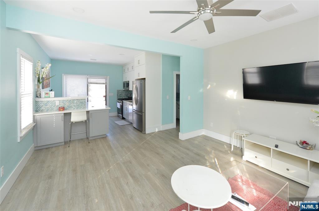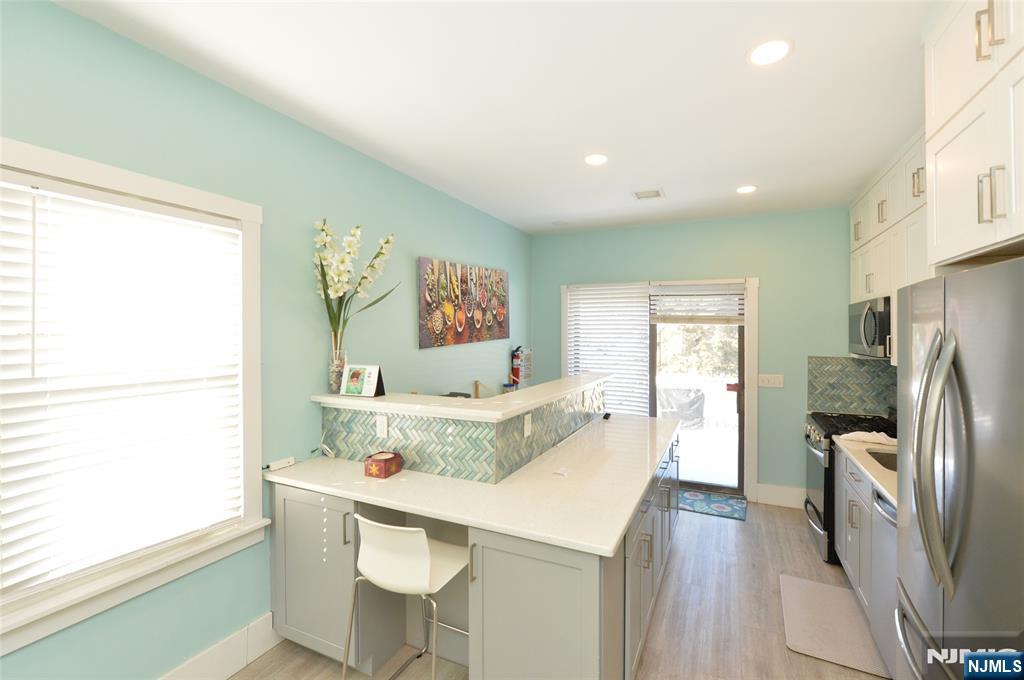 Fully renovated in 2020, this light-filled four-bedroom, two-bath home blends modern luxury with the relaxed charm of a coastal retreat in the heart of Bergen County. Designed with efficiency and style in mind, the home showcases soaring 10-foot ceilings, expansive windows, and sun-drenched interiors that feel bright, airy, and effortlessly inviting. Soft teal blue walls create a serene atmosphere, while the beautifully appointed kitchen features stainless steel appliances, a striking tile backsplash, abundant cabinetry, and a center island that serves as a breakfast bar or organized hub for everyday living, with concealed storage behind. Each level offers two spacious bedrooms and a full bath, while the fully finished lower level adds exceptional versatility with a private bedroom and bath, kitchenette, recreation space, built-in cabinetry, and countertops mirroring the main kitchen for a seamless, cohesive feel. A stacked washer and dryer add convenience. Outdoor living is equally captivating, with a charming “lemonade†front porch perfect for spring mornings and summer breezes, a full-width elevated rear deck, and a breathtaking landscaped backyard with patio, an ideal setting for relaxation or entertaining. A truly special home where comfort, style, and tranquility meet.
