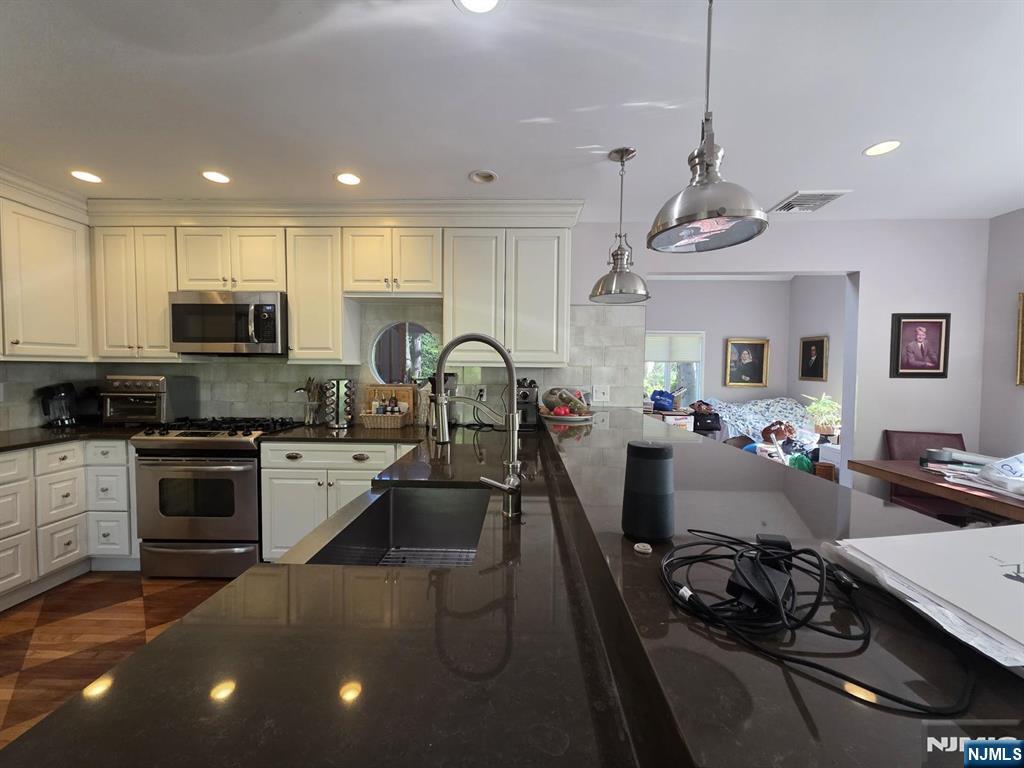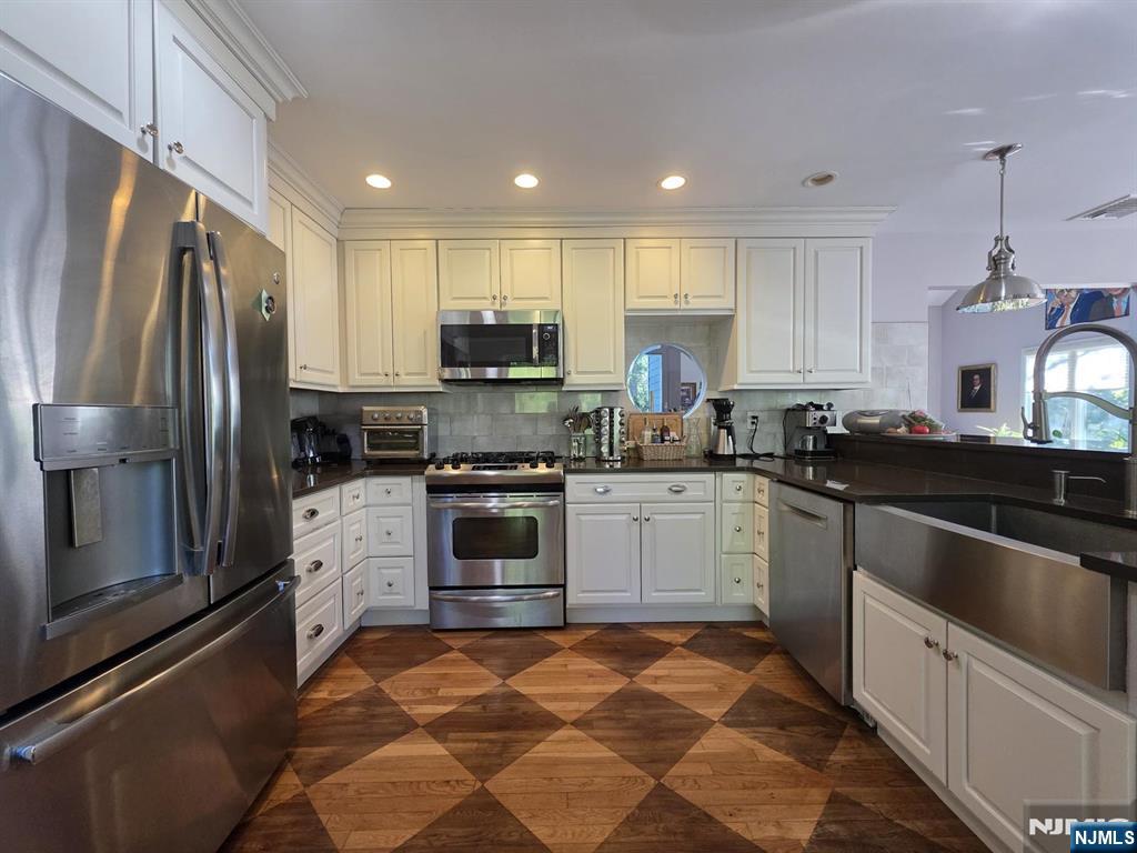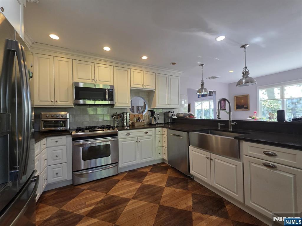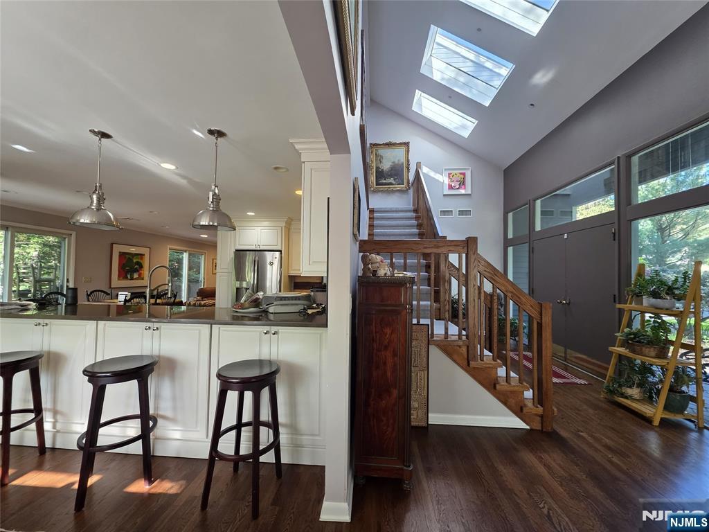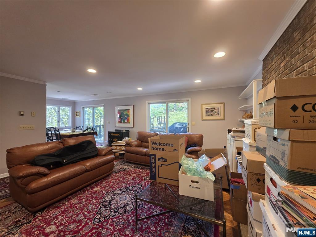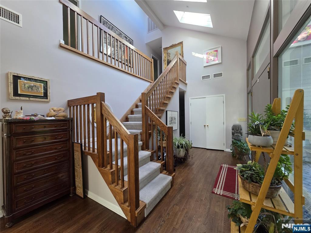 ***Please note, the home is currently in the process of packing, and we appreciate your understanding for any visible boxes or temporary clutter. Bedroom photos are not included at this time as they are being packed*** Welcome to this beautifully maintained home located on a quiet, tree-lined street in the highly sought-after town of Closter. The welcoming entrance features high ceilings, skylights, and an elegant staircase, creating a warm and inviting first impression. The home offers a bright and functional layout with spacious living areas ideal for everyday living and entertaining. The first floor features a formal living room, an additional living area, dining room, eat-in kitchen with direct access to the backyard, office, half bath, and sliding doors leading to a deck and backyard, along with a two-car garage. The property also offers beautiful front and back yards, with a fish pond located in the side yard near the backyard exit. The second floor offers three bedrooms sharing a full bath, plus an oversized primary bedroom with a wide closet and primary bath. The ground level is designed for entertainment and features a spacious layout ideal for a playroom, TV room, or family room, with direct access to the backyard.