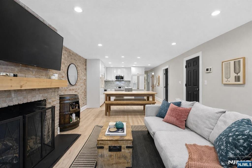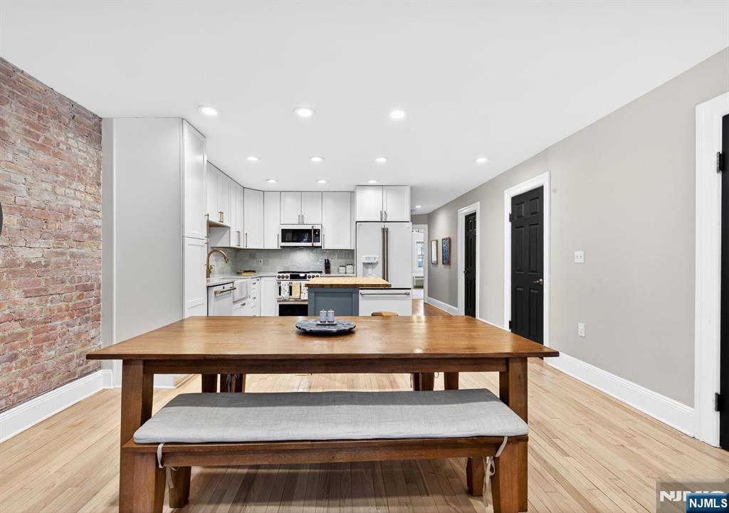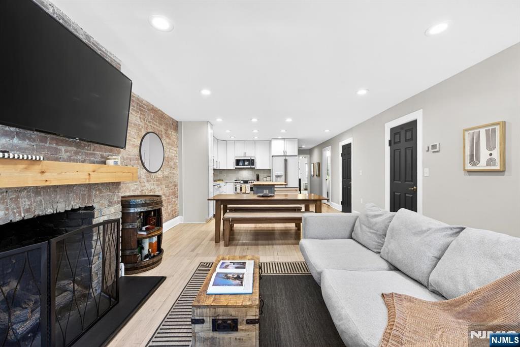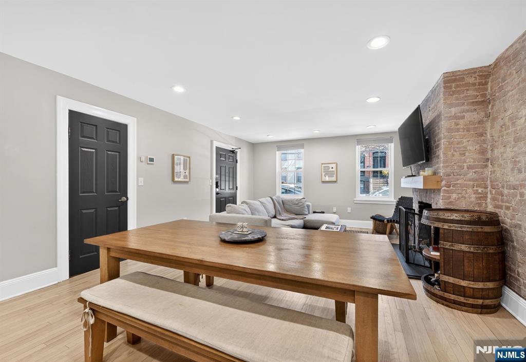 Welcome to 112 Bloomfield Street, Unit 1  a beautifully updated 2-bedroom, 2-bath home offering over 1,300 sq ft of refined living space, complete with a private terrace on one of Downtown Hoboken’s most desirable tree-lined streets. This sun-filled, open-concept living and dining area is perfect for both relaxing and entertaining, featuring exposed brick, a gas fireplace, recessed lighting, and Scandinavian oak hardwood floors throughout. The chef’s kitchen combines style and function with matte white GE Café appliances, an LG dishwasher, white quartz countertops, a custom butcher block island, soft-close cabinetry, and a deep farmhouse sink. Enjoy exceptional storage, including an oversized entry closet and a spacious walk-in laundry room with a full-size washer and dryer. The primary suite offers room for a king bed and office nook, plus a custom walk-in closet and a spa-like ensuite with a glass-enclosed shower. The second bedroom is bright and inviting with its own walk-in closet. Additional features include smart keyless entry, stroller parking, and shared basement storage. Ideally located near the PATH, NY Waterway Ferry, NJ Transit, Washington Street, parks, dining, shops, and schools. Rental parking available nearby. A rare turnkey opportunity in the heart of Downtown Hoboken.
