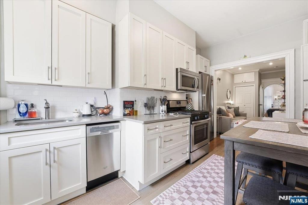 Welcome to this impeccably maintained 1-bedroom, 1-bathroom condo offering 600 square feet of sophisticated living space in a classic pre-war building. This turnkey residence is truly ready for you to move right in, featuring brand-new flooring throughout and a total renovation of both the kitchen and bathroom. The sleek kitchen is a chef's delight, complete with premium quarts countertops and high-end stainless steel appliances. Residents enjoy the ultimate convenience of an on-site washer and dryer within the building. Perfectly situated for the modern commuter, you are just minutes from the Hudson-Bergen Light Rail and the PATH for an easy commute to NYC, with quick access to all major highways. Embrace the best of Mile Square City living with Hoboken’s world-class restaurants, vibrant bars, boutique shopping, and lush waterfront parks right at your doorstep. Experience the perfect blend of historic character and modern luxury in this must-see home.