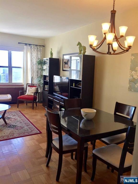 Penthouse floor with 9 foot ceilings, this, one bedroom/one bath condo has a birds' eye view of the NYC skyline. Totally renovated kitchen with pass through to the dining area/living room. Hardwood parquet floors throughout. Bedroom window faces south. Large WIC in bedroom. 3 additional closets in the unit for extra storage. Bathroom was also renovated. This unit has NO TERRACE/BALCONY. Med South offers 24/7 concierge/security service, community room, outdoor athletic courts, playground, seasonal pools. Gym and bike storage available for monthly fee. Parking is assigned after closing and is $95/$85/$75 per month per car, depending on space location. Choice of Spectrum or Verizon FiOS for internet and cable. Close to GWB, NJ highways, downtown shopping and restaurants. Free shuttle for NYPresbyterian employees across the street by the neighborhood. In a great location, Med South is the perfect place to call home !