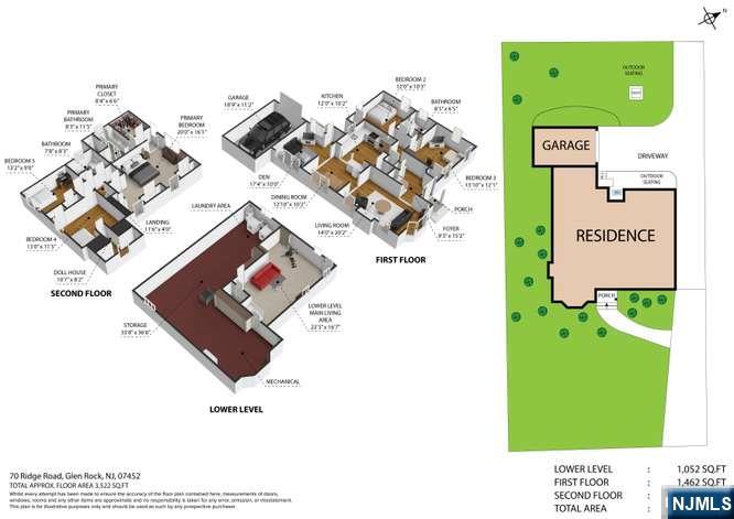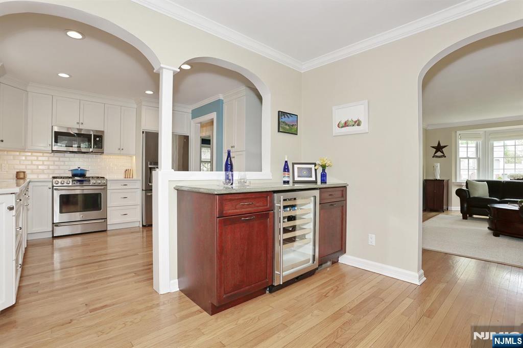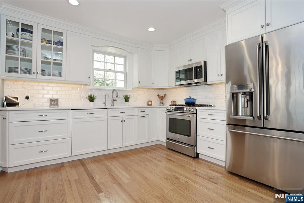 Sitting pretty on one of the most coveted streets in Glen Rock as if it were plucked from the pages of a fairytale, is this thoughtfully expanded 5 bedroom, 3 full bath home. Meticulously updated, you will be charmed from minute one. Starting with the perfectly landscaped front yard, paver walkway, and foyer leading to a large living room with gorgeous architectural details, gas fireplace and hardwood floors. Continue to the dining area leading to the open concept, renovated kitchen with custom cabinetry, quartz counters, and SS appliances-ideal for entertaining. Leading off the dining area is a bright den flanked with windows, with easy access to the private backyard as well as one car garage and driveway. The first level continues with a full hall bath, sizable Bedroom # 1, Bedroom # 2 used as an office, and ample closets throughout.The 2nd level features the Primary Bedroom Suite with large walk in closet, expansive Primary Bath and other storage nooks. The 2nd floor continues with a full hall bath, Bedroom # 4 and charming Bedroom # 5 complete with an attached room that can be used as a playroom, or additional oversized closet.The lower level offers an expansive partially finished basement with rec room, laundry, storage-the possibilities for the unfinished portion are endless.The backyard is your own private oasis with plenty of room to relax or gather. Close to Glen Rock's highly rated schools, NYC transportation and more, 70 Ridge Road is where your story begins!