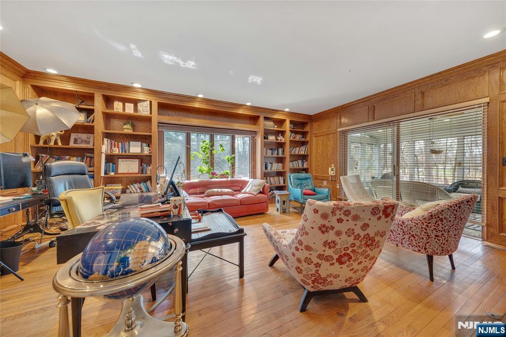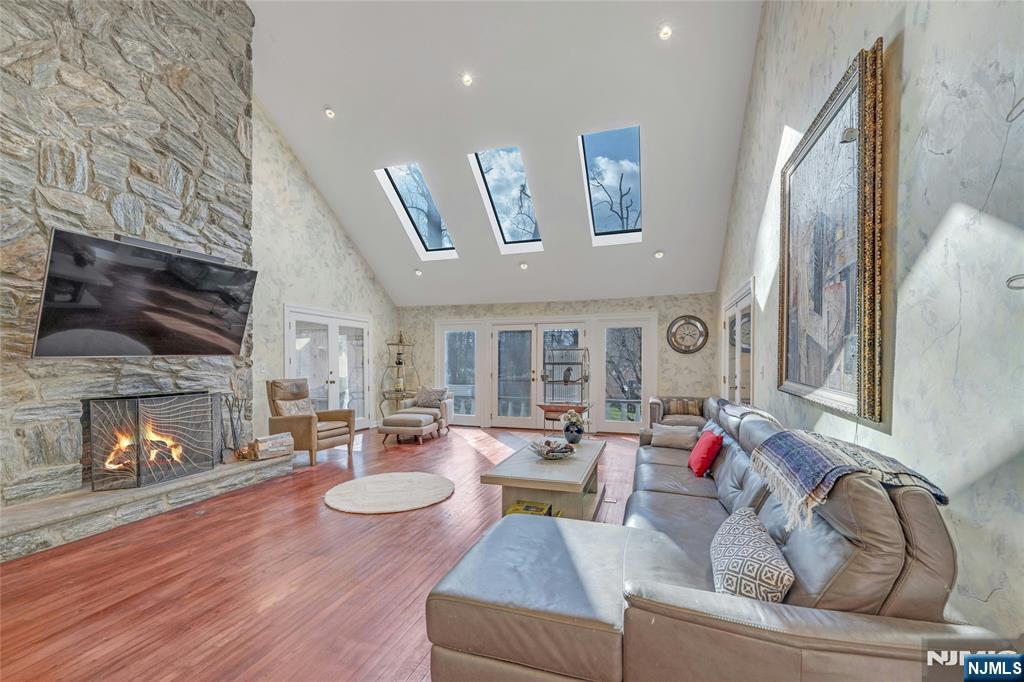Custom-Built Stone & Masonry Stucco Tudor Manor, set on a prime, level, 2-acre lot, framed by mature landscaping, with serene garden waterfall koi pond feature and circular drive, located in the sought-after Burning Hollow neighborhood of prestigious Saddle River. This beautifully designed, 6BR, 6.2 bath spacious home features a grand 2-story marble entry foyer, 4 fireplaces, a huge sunlit great room with soaring 2-story vaulted ceiling, massive stone fireplace, and skylights, and a relaxing screened-in sun porch overlooking the park-like very private backyard. Richly paneled library/office with fireplace. Expansive modern eat-in kitchen with sliding doors to the large deck. Sumptuous primary bedroom suite with fireplace, sitting room retreat w/exclusive access to private enclosed balcony, 2 walk-in closets, and primary bath with sauna, steam shower and sunken tub. Exceptional functional floorplan with generously proportioned rooms, bathed in natural light. Third floor bonus hobby room. Full finished LL with spa room, bath, and more. Gorgeous custom Sylvan pool and spa, wrap-around flagstone patio, 3-car garage with lifts to accommodate 6 vehicles, newer roof and HVAC, the list goes on!