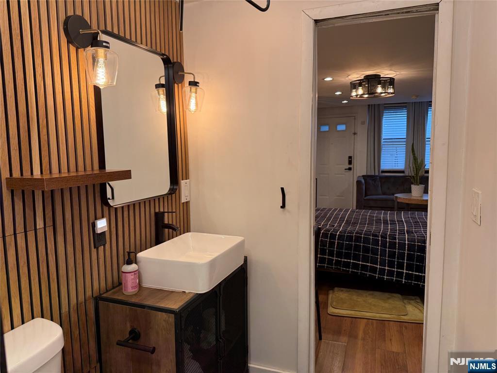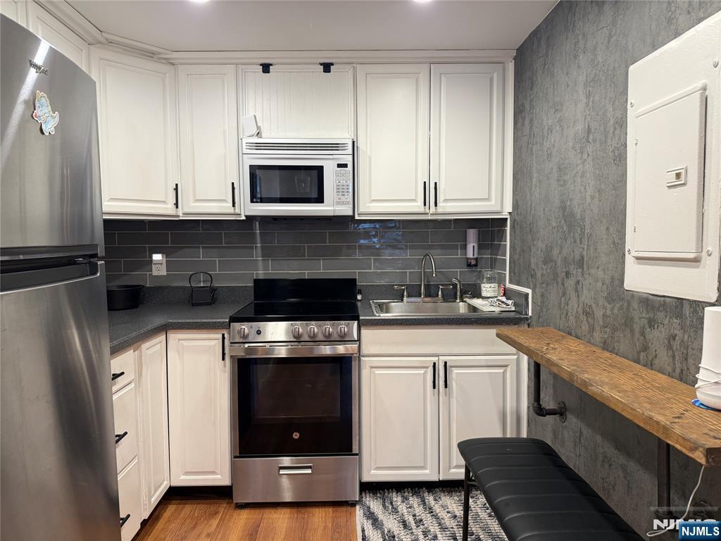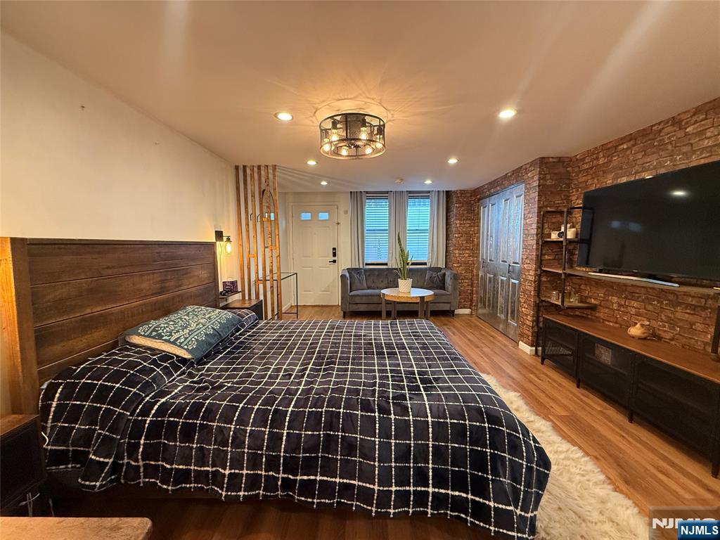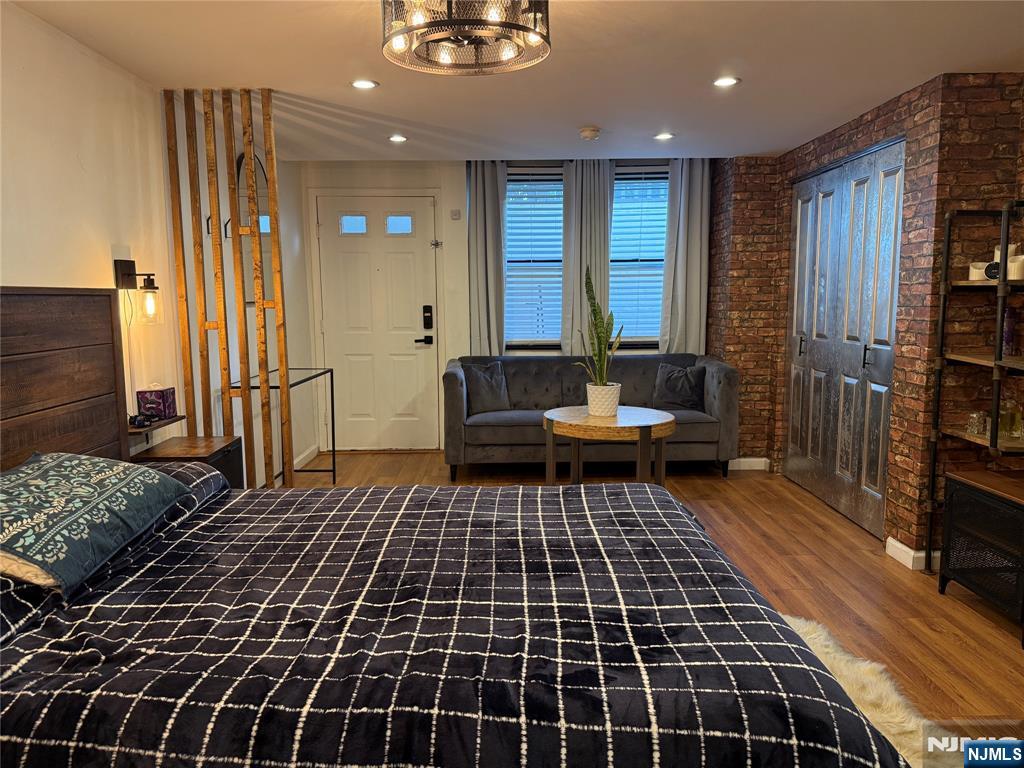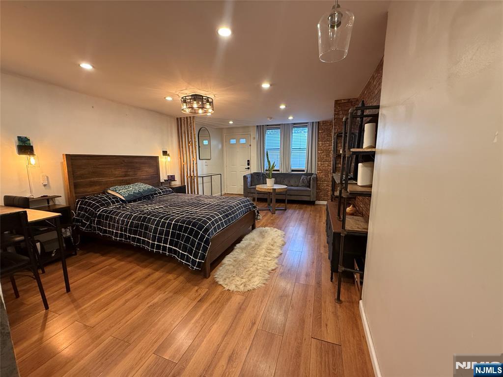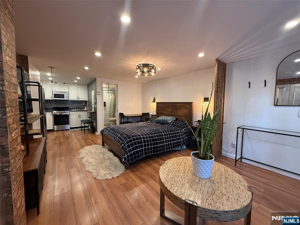Commuter’s dream with style. This updated East Rutherford studio delivers smart design and standout finishes just minutes to NYC. Easy access to NJ Transit bus/train and major highways makes your daily commute simple and efficient. Inside, a well-executed open layout maximizes every square foot. The modern kitchen features stainless steel appliances, white shaker cabinetry, gray subway tile backsplash, and ample prep space. A custom breakfast bar with seating adds both function and character. The main living area is warm and inviting with wide-plank wood floors, recessed lighting, and a statement industrial-style ceiling fixture. A brick-accent wallpaper creates a true focal point, while a sleek wood partition defines the sleeping area without sacrificing openness. Space comfortably accommodates a bed, living setup, and work-from-home desk. Beautifully updated bath with subway tile detailing completes the unit. Ideal for anyone seeking low-maintenance living in a prime commuter location near dining, shopping, and MetLife Stadium. Turnkey, efficient, and full of personality. Furnished option also available.