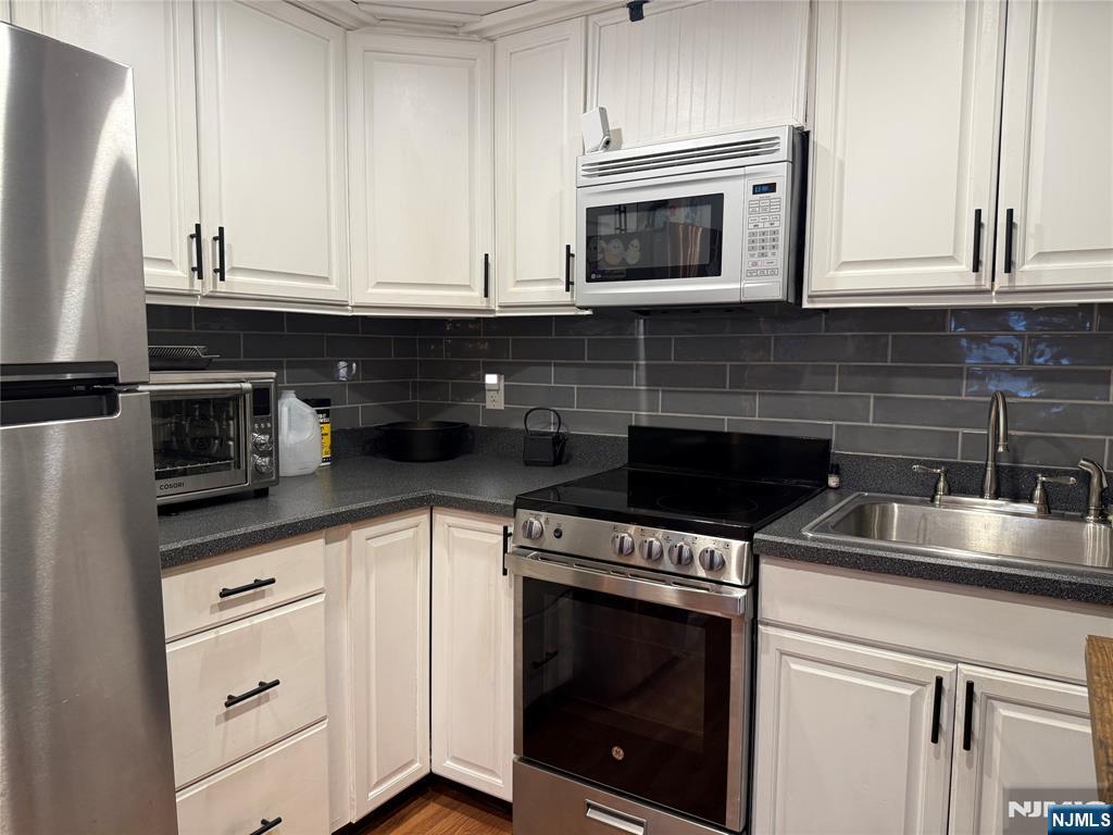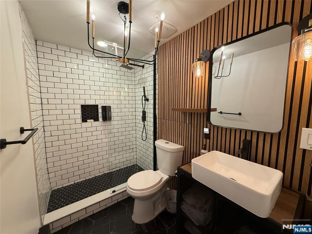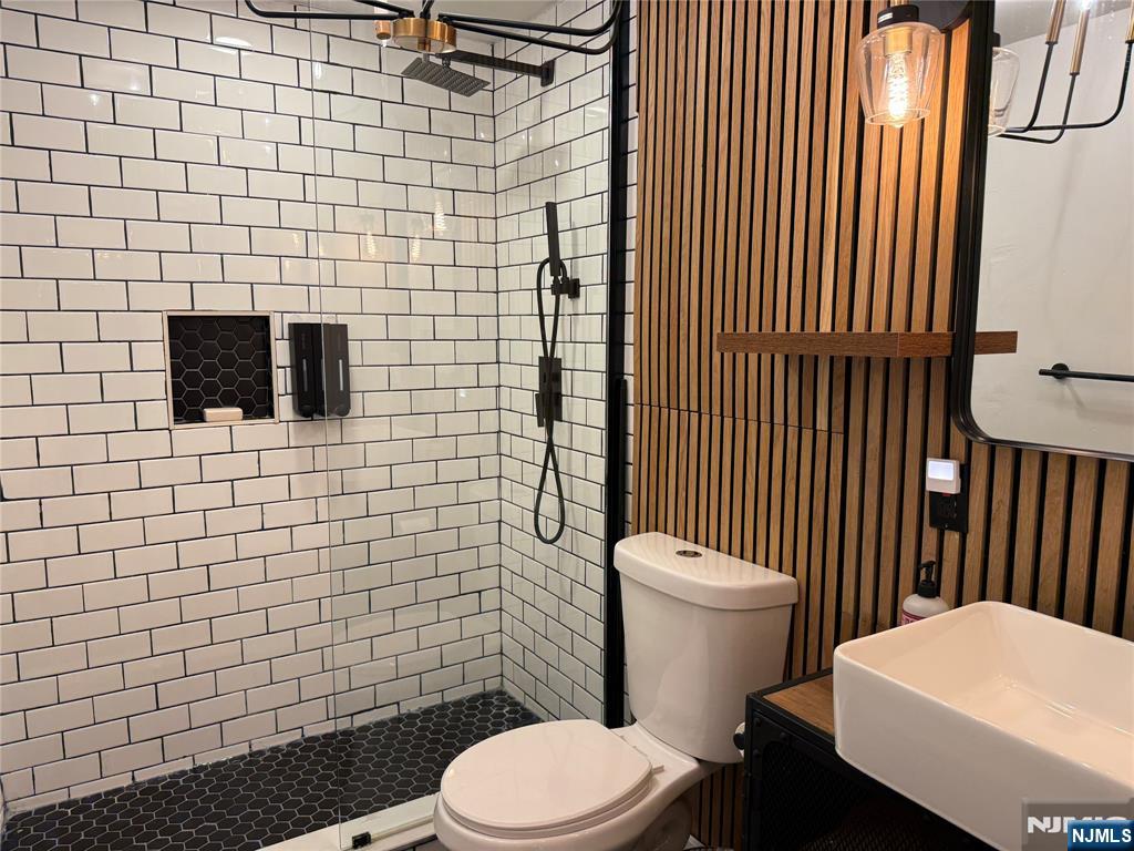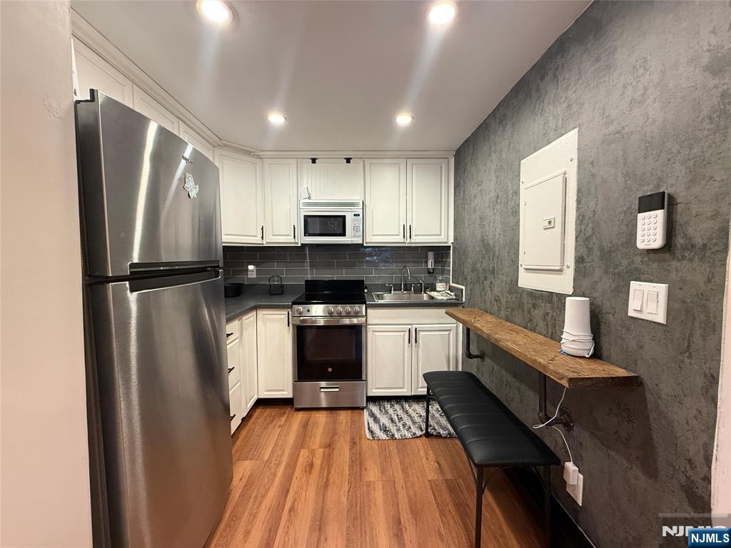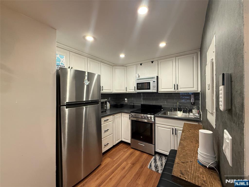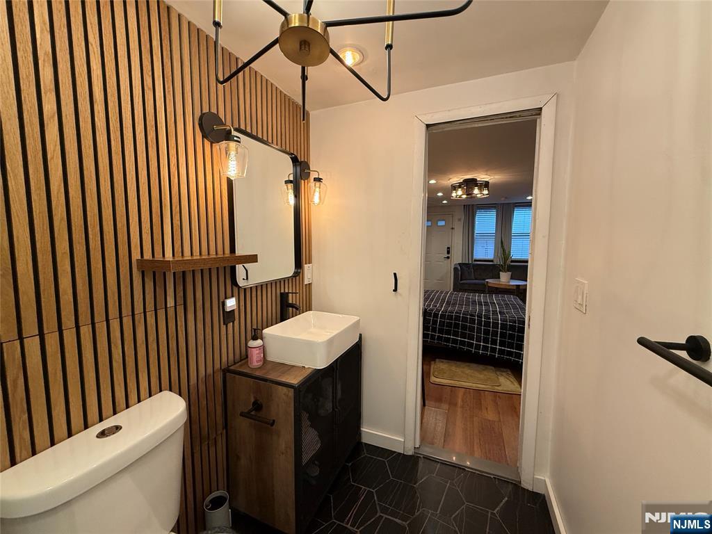 Commuter’s dream with style. This updated East Rutherford studio delivers smart design and standout finishes just minutes to NYC. Easy access to NJ Transit bus/train and major highways makes your daily commute simple and efficient. Inside, a well-executed open layout maximizes every square foot. The modern kitchen features stainless steel appliances, white shaker cabinetry, gray subway tile backsplash, and ample prep space. A custom breakfast bar with seating adds both function and character. The main living area is warm and inviting with wide-plank wood floors, recessed lighting, and a statement industrial-style ceiling fixture. A brick-accent wallpaper creates a true focal point, while a sleek wood partition defines the sleeping area without sacrificing openness. Space comfortably accommodates a bed, living setup, and work-from-home desk. Beautifully updated bath with subway tile detailing completes the unit. Ideal for anyone seeking low-maintenance living in a prime commuter location near dining, shopping, and MetLife Stadium. Turnkey, efficient, and full of personality. Furnished option also available.