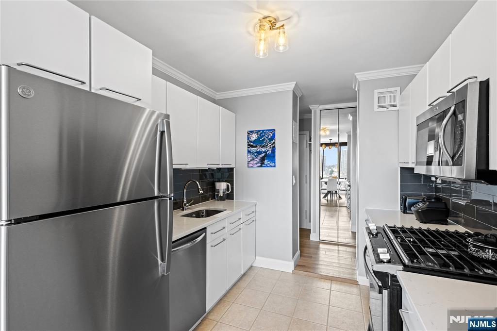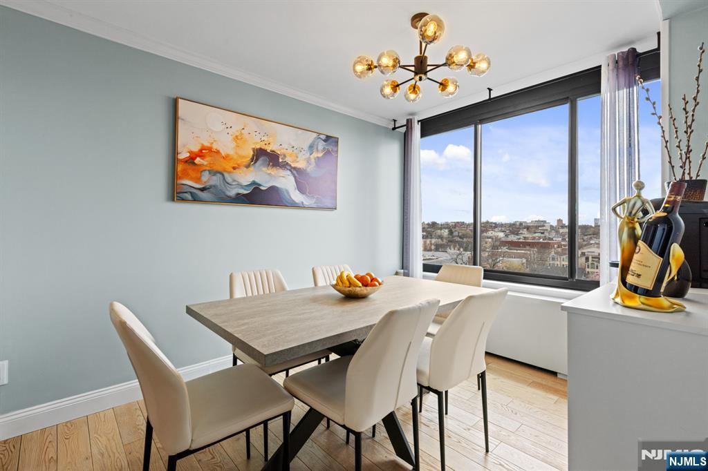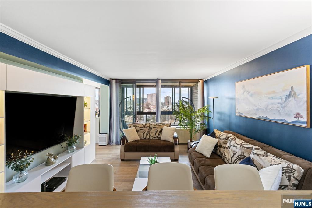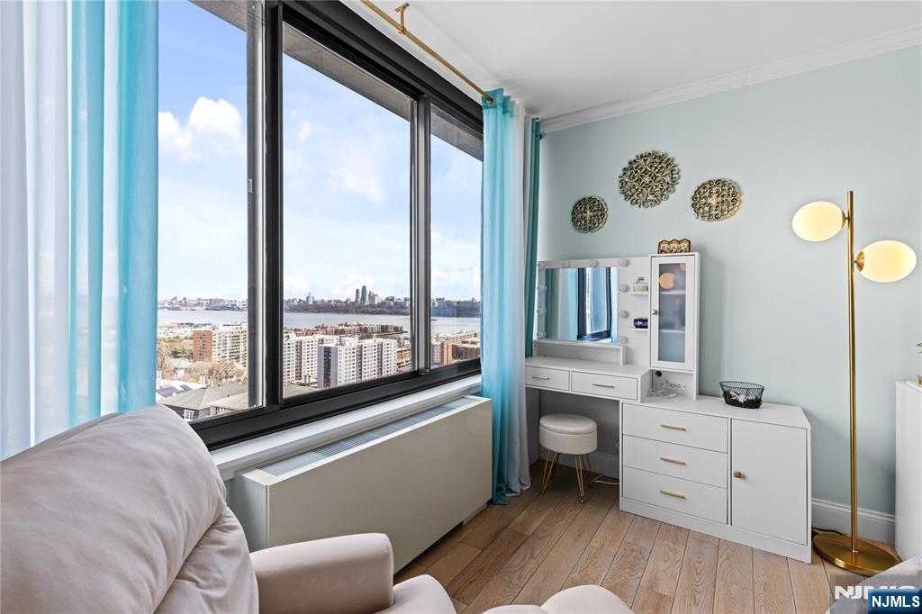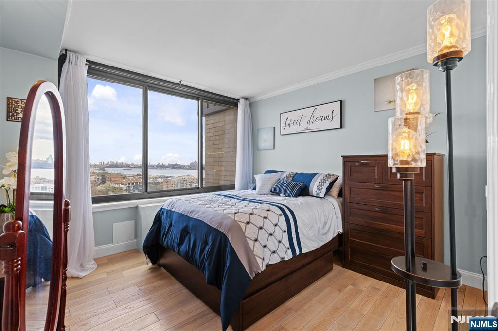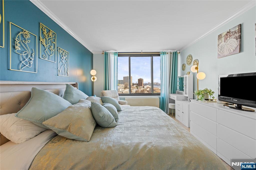 Newly renovated 3-bedroom, 2-bath rental with approx. 1,500 sq ft. Includes 2 INDOOR GARAGE parking spaces and is within walking distance to the NJ Transit bus to NYC Port Authority. Features an enclosed terrace with NYC and sunrise views from every bedroom, filling the unit with natural sunlight. Located right next to James J. Braddock Park. Updated kitchen and bathrooms, new flooring throughout, and a spacious, functional layout. Primary bedroom boasts an en-suite bath and two walk-in closets. Full-service building offers 24-hour doorman, outdoor pool with BBQ area, gym, and laundry room.