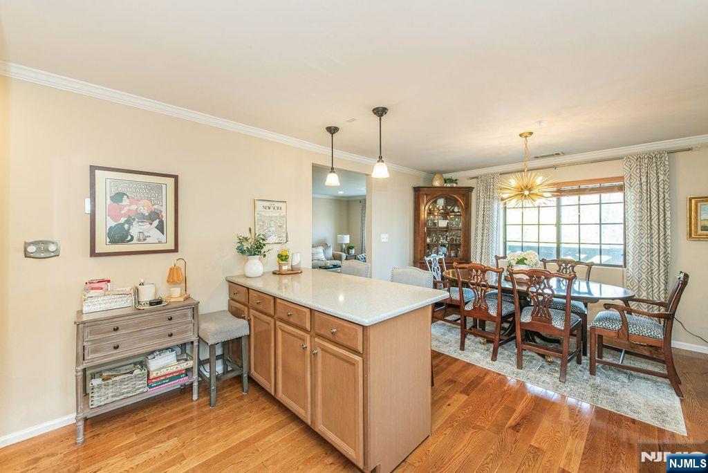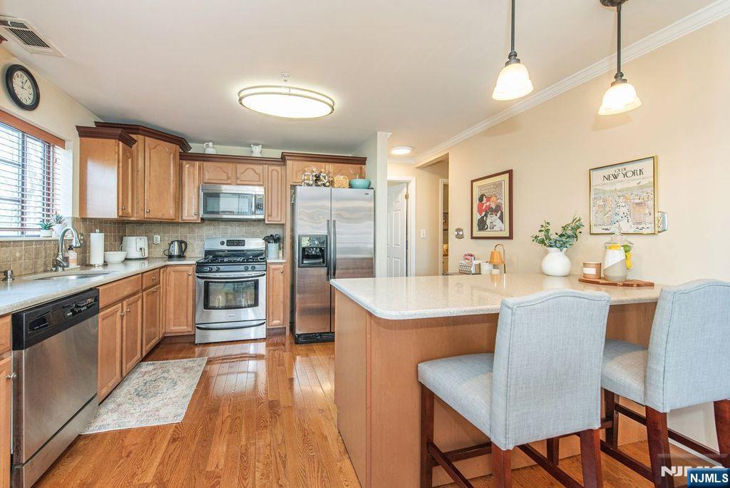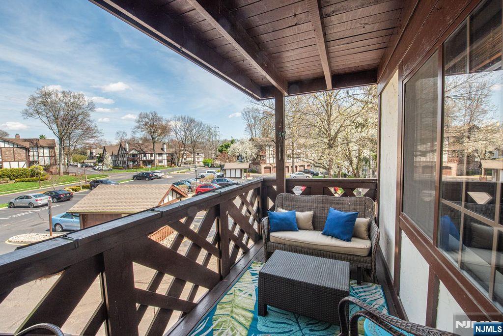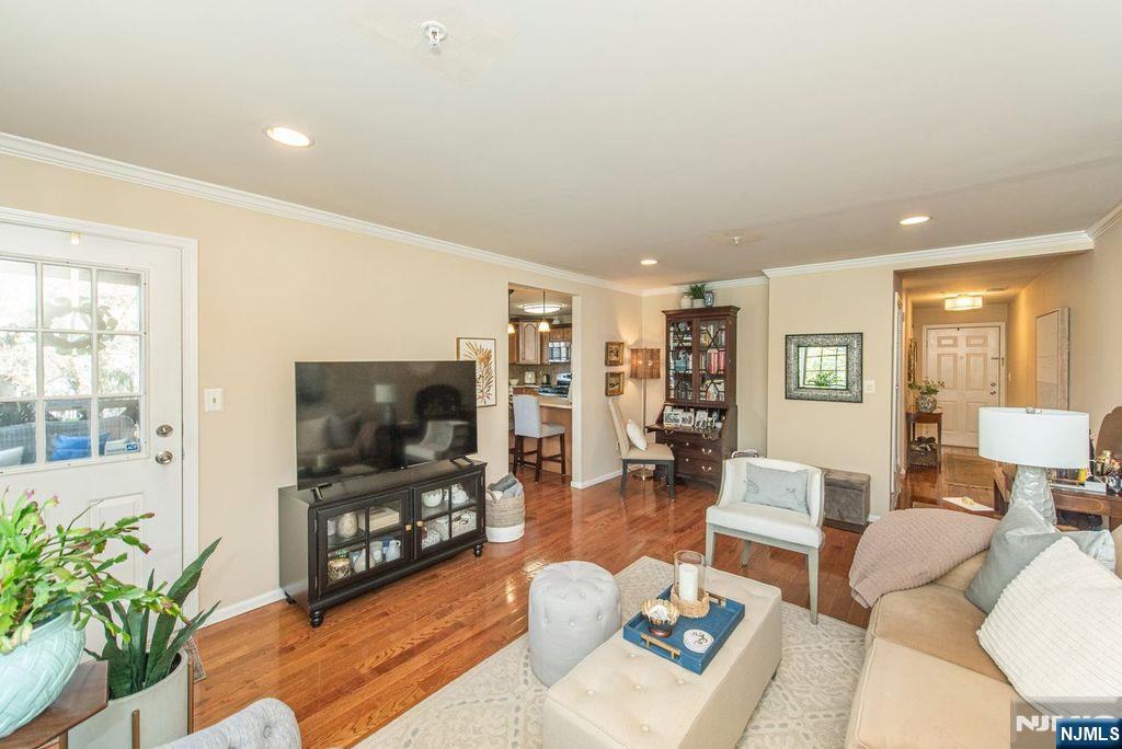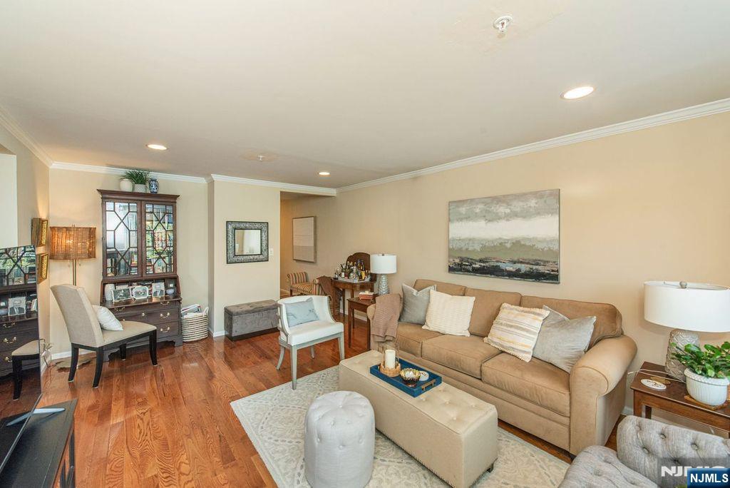 Lovely and spacious condo is ready for a new owner. Gleaming hardwood floors greet you as you enter the foyer to the living room and formal dining room which is open to the kitchen. This sunny condo boasts an updated kitchen with stone countertops, SS appliances and breakfast bar for casual dining. Commune with your guests as you prepare a gourmet meal. King size bedroom boasts walk in closet. Updated full bath with walk-in shower is warm and cozy. Full size washer & dryer with storage. Private balcony for outdoor living completes this beauty. Caged and locked storage in the building. Ridge Gardens is like being in the English countryside. Paver walkways to meet your neighbors as you walk, jog, bike or take your dog out for exercise. Refreshing pool for summer fun, tennis and picklelball courts for the sports enthusiast. NYC bus stop just outside the entrance. Close to schools, library, shopping and transportation. A fabulous lifestyle.