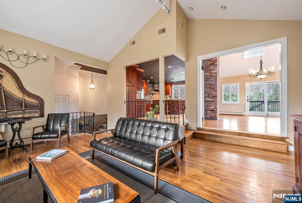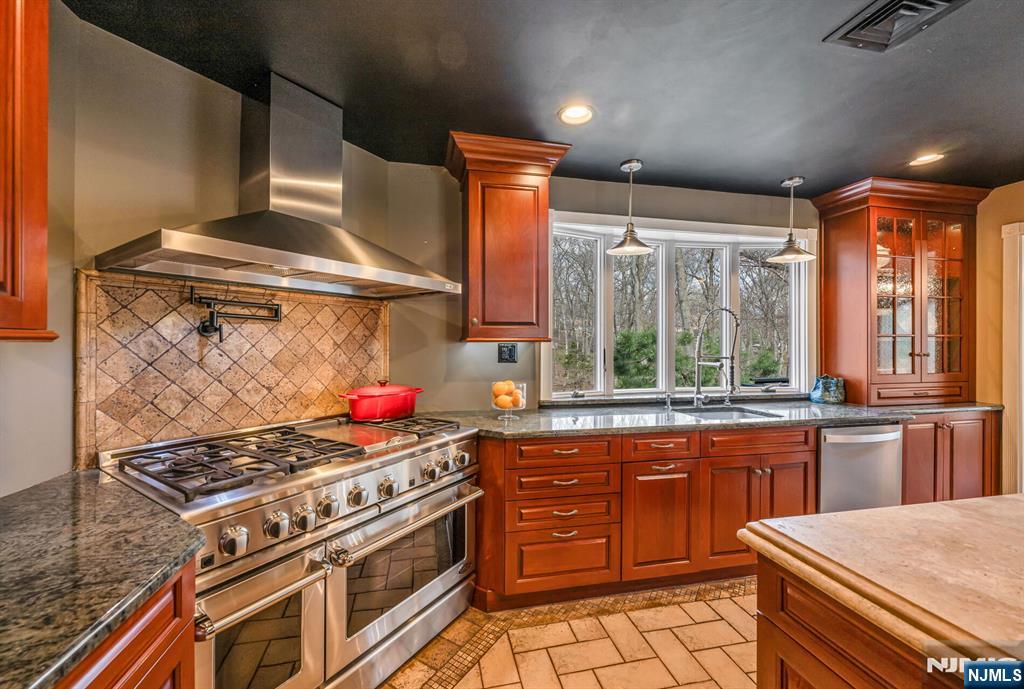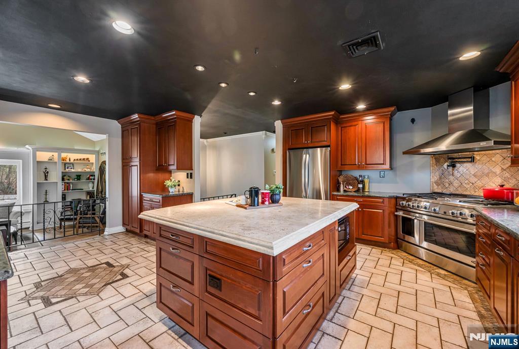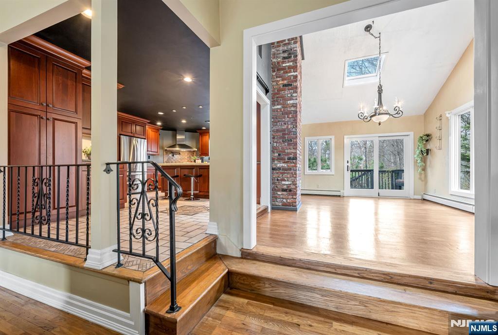Spectacular, one-of-a-kind home with an upscale flair far from typical! This unique property features an elevated living room w/vaulted ceiling, filled with natural light and designed for open, airy living. A few steps up, the formal dining room impresses with high ceilings and sliding glass doors leading to a deck overlooking a serene backyard perfect for indoor-outdoor entertaining. The exceptional kitchen is anything but ordinary, Showcasing a large center island w/ honed travertine & seats 4, endless cabinetry, granite countertops, & an oversized 6-burner stove with griddle & hood vent - a dream for everyday living, gourmet cooking & entertaining. A large bay window allows for beautiful natural views while you cook & gather. This level offers three spacious bedrooms and an updated full bath. The lower level adds even more living space with an industrial-style family room featuring a waxed cement floor, open beamed ceiling, and a wood-burning brick fireplace, 4th bedroom / office w/full bath & walkout to patio, large media / bonus room, powder room & laundry complete the space, plus Sliding glass doors leading to a large composite deck ideal for hosting or relaxing. 2 car garage. Additional highlights include a circular driveway with plenty of parking, maintenance-free landscaped front yard means no lawn mower needed, Hardy plank siding, newer Andersen windows, new C/A Private rear yard. prime location close to shopping, restaurants, parks, & NYC Express bus