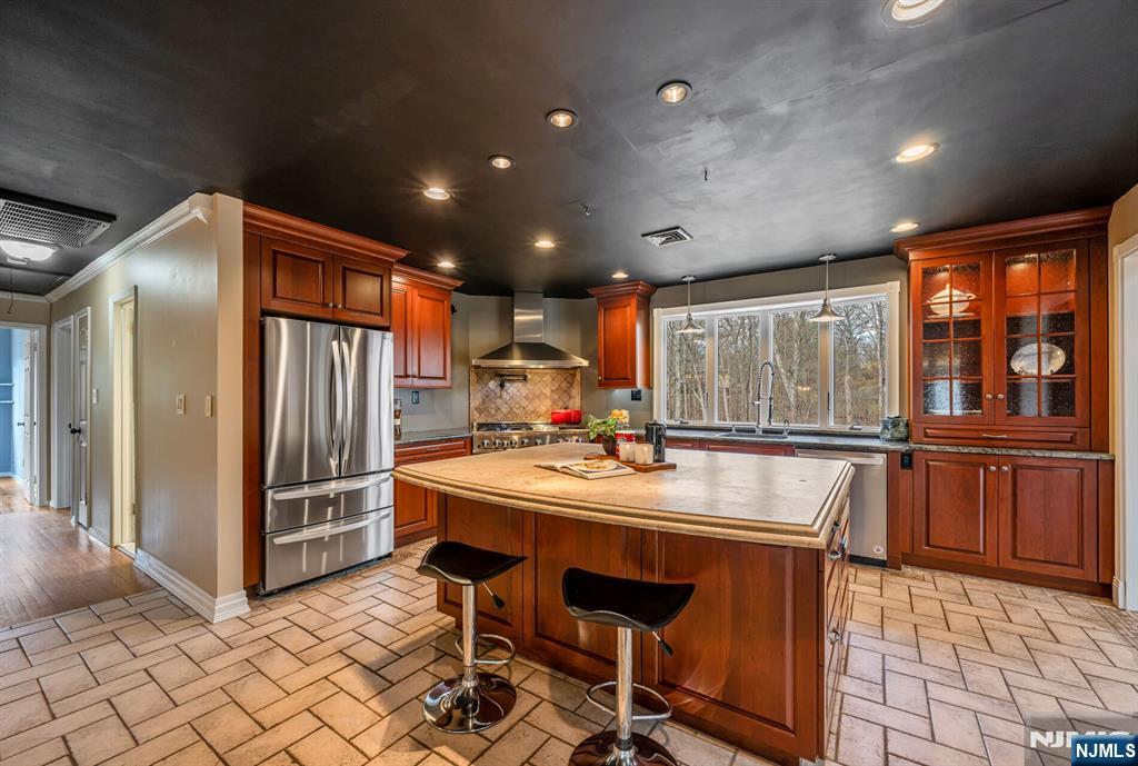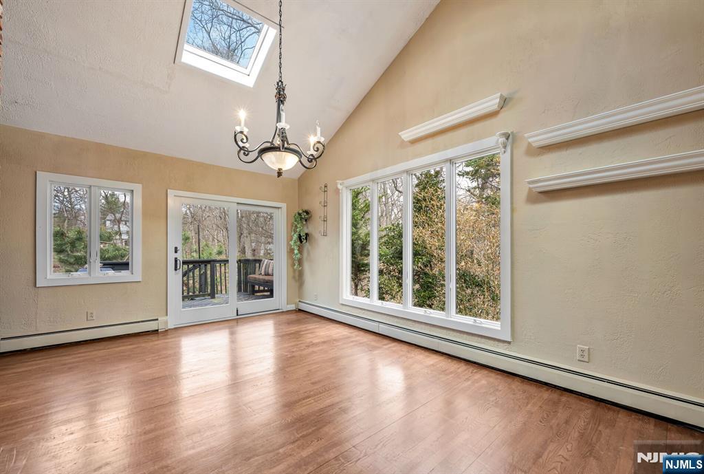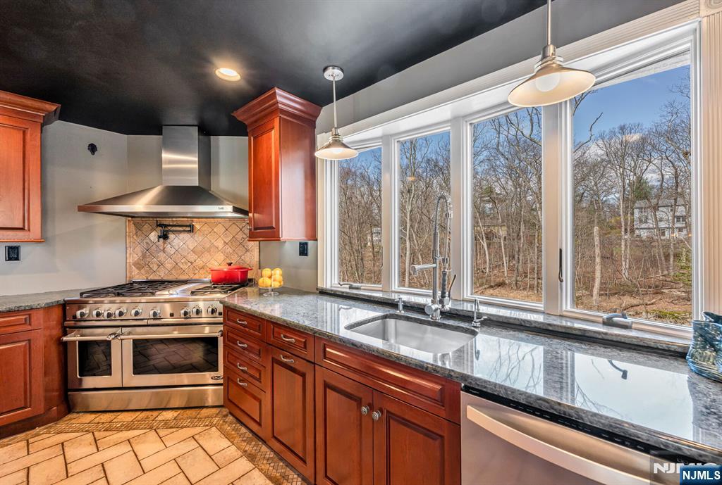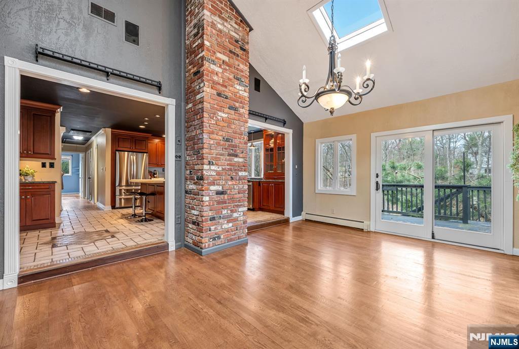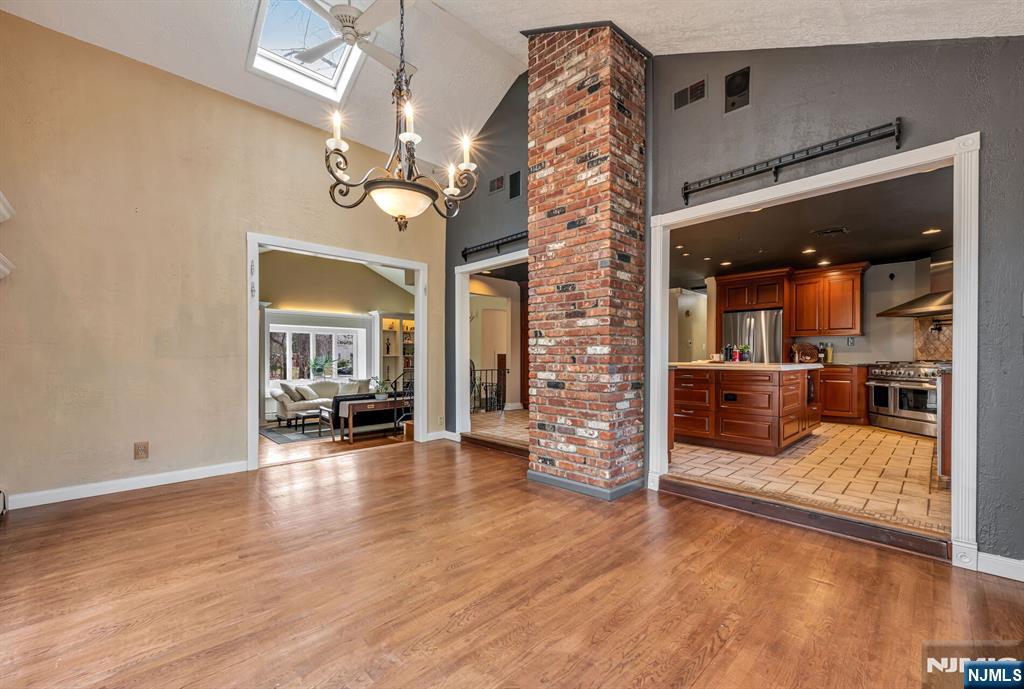 Spectacular, one-of-a-kind home with an upscale flair far from typical! This unique property features an elevated living room w/vaulted ceiling, filled with natural light and designed for open, airy living. A few steps up, the formal dining room impresses with high ceilings and sliding glass doors leading to a deck overlooking a serene backyard perfect for indoor-outdoor entertaining. The exceptional kitchen is anything but ordinary, Showcasing a large center island w/ honed travertine & seats 4, endless cabinetry, granite countertops, & an oversized 6-burner stove with griddle & hood vent - a dream for everyday living, gourmet cooking & entertaining. A large bay window allows for beautiful natural views while you cook & gather. This level offers three spacious bedrooms and an updated full bath. The lower level adds even more living space with an industrial-style family room featuring a waxed cement floor, open beamed ceiling, and a wood-burning brick fireplace, 4th bedroom / office w/full bath & walkout to patio, large media / bonus room, powder room & laundry complete the space, plus Sliding glass doors leading to a large composite deck ideal for hosting or relaxing. 2 car garage. Additional highlights include a circular driveway with plenty of parking, maintenance-free landscaped front yard means no lawn mower needed, Hardy plank siding, newer Andersen windows, new C/A Private rear yard. prime location close to shopping, restaurants, parks, & NYC Express bus