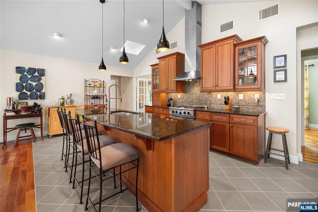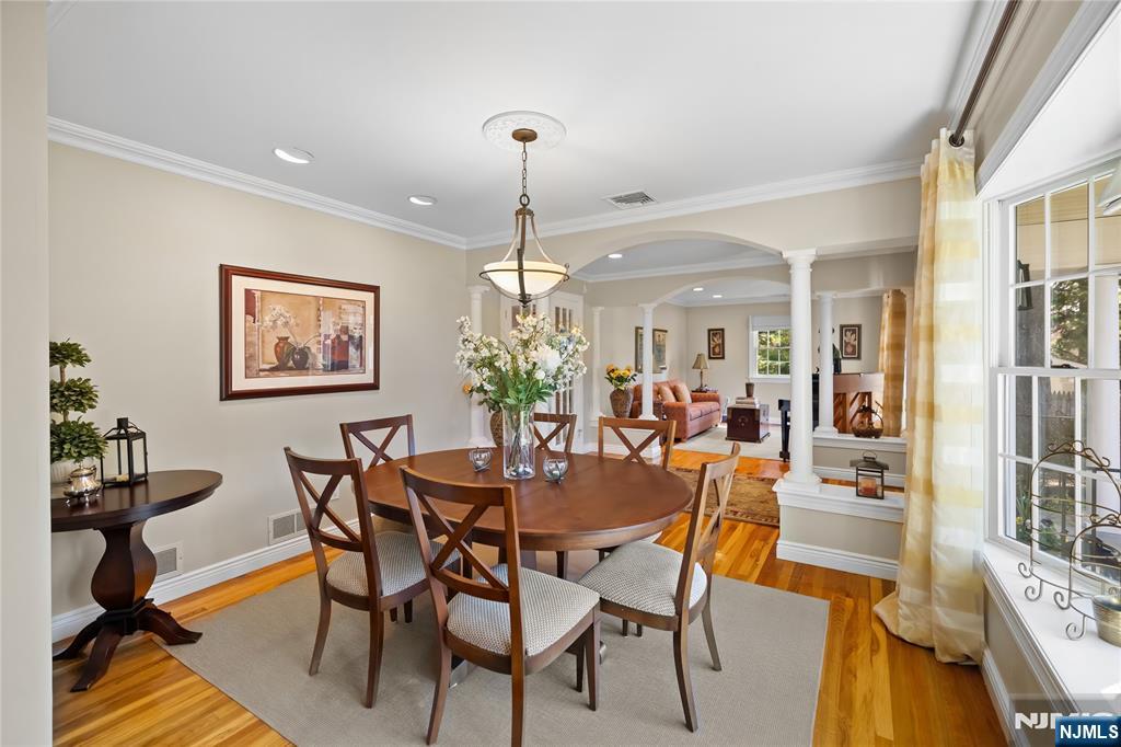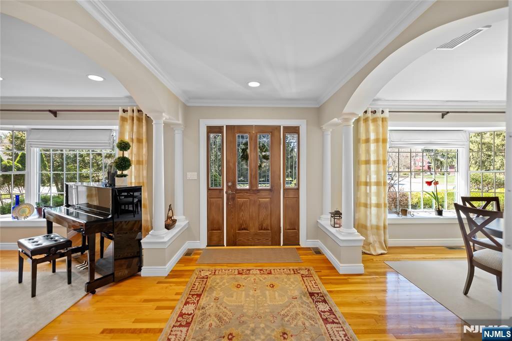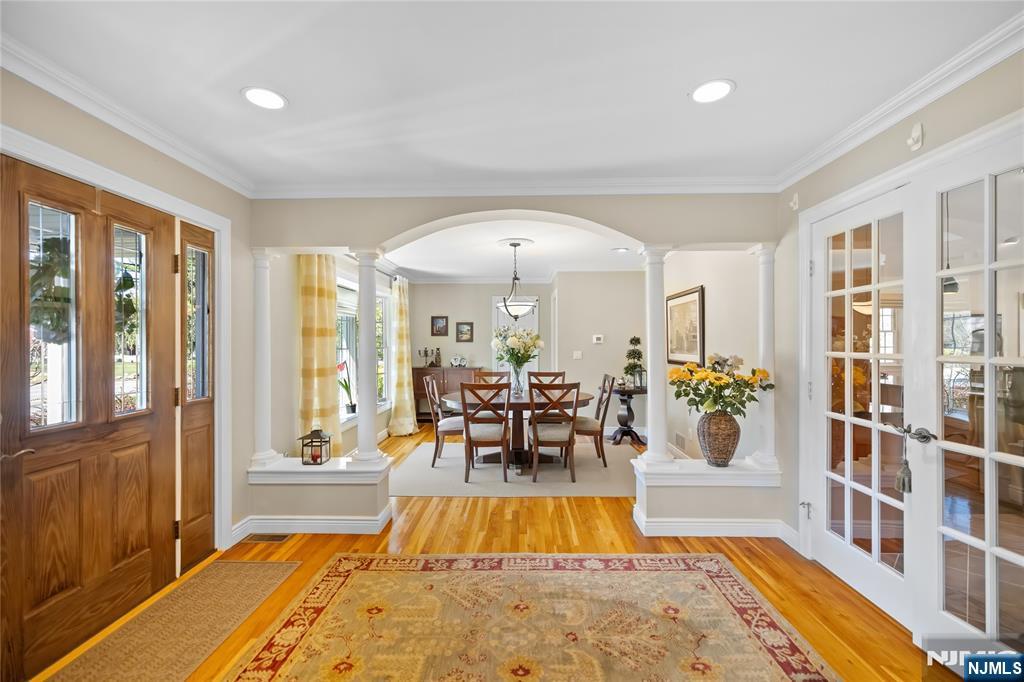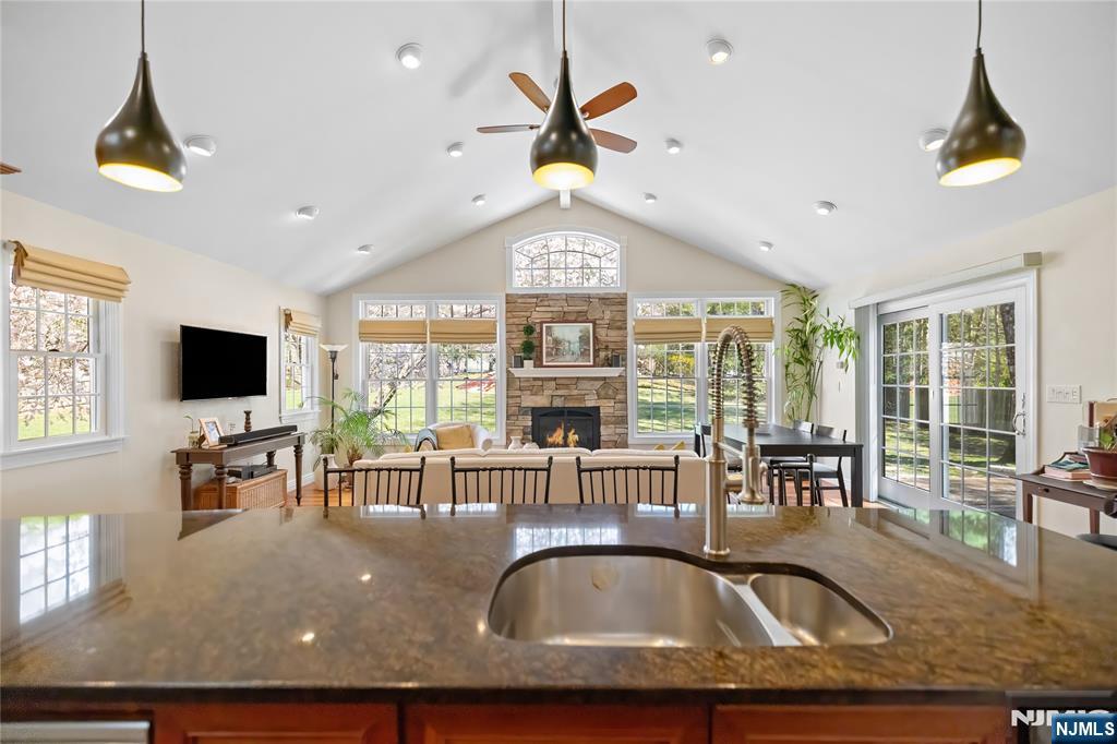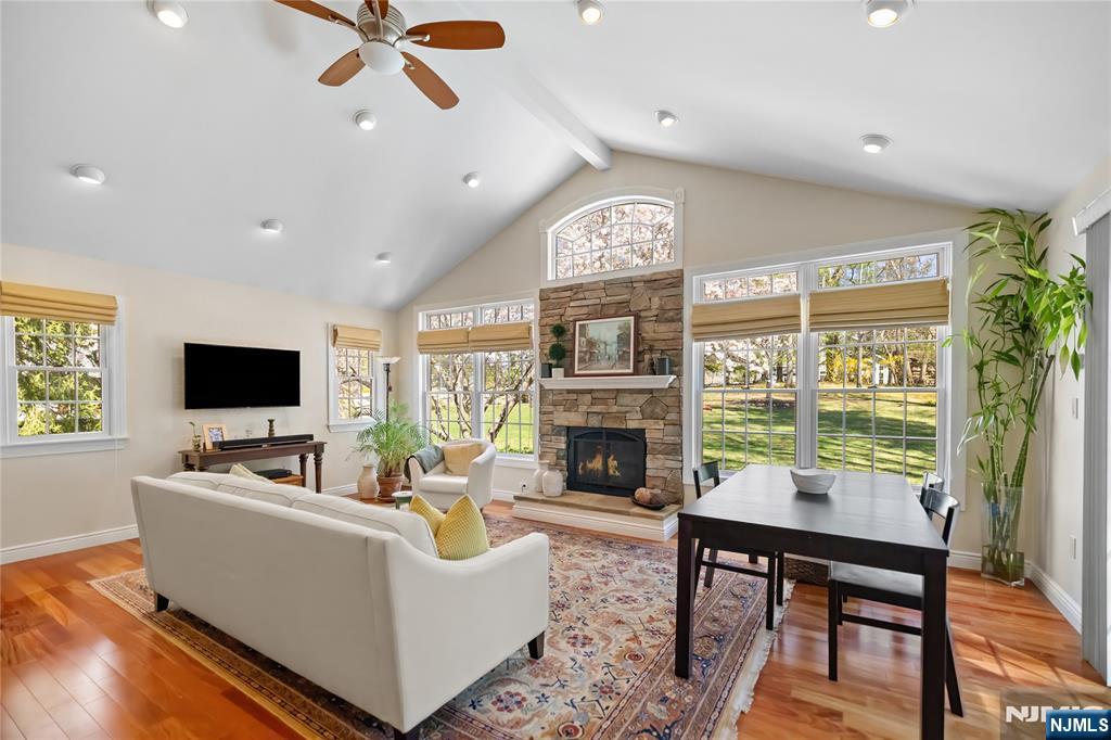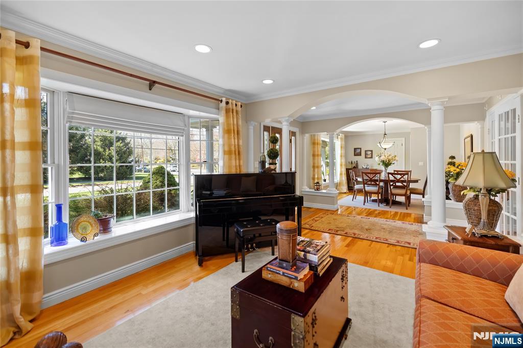 This Remarkable Expanded & Renovated Split Ranch w/soaring ceilings, huge rooms & open floor plan blends the sophistication of Contemporary Elegance w/the convenience of a high end life style. You will LOVE the Incredible deep & wide private property! The Columned Entry foyer leads to the Living Room & Dining Room. The Extraordinary Cathedral Ceiling Kitchen, Great Room & Breakfast Room addition w/fireplace is Beyond Beautiful, and allows for enjoying exemplary culinary cuisine, entertaining, & an incredible Life Style! The Updated Kitchen w/Breakfast Rm, Brkfst Bar, custom Cherry Cabinetry, Granite Counters, & Stainless appliances, opens to the Expansive Cathedral Ceiling Great Room w/fireplace & views of the spectacular rear yard. This incredible design & open floor plan is right out of Architectural Digest, and is truly breathtaking. A hallway leads to the home office/4th BR & Powder Rm. Upstairs is a Primary Suite w/Renovated Primary Bath, 2 additonal Bedrooms & a Beautiful Main Bath. The Ground level off the Kitchen has a large Laundry Area/ Mud Room which leads to the spacious 2 car attached Garage. The Lower Level has a large Recreation Room & lots of Storage. The exceptional rear Yard is remarkable in space and beauty, with paver patio, deck & your own private park. River Vale offers an Easy nyc commute by car, bus & rail, Seasonal Town Farmer's Market & close proximity to fine Restaurants, & the Exceptional River Vale Library. You will LOVE Living Here!