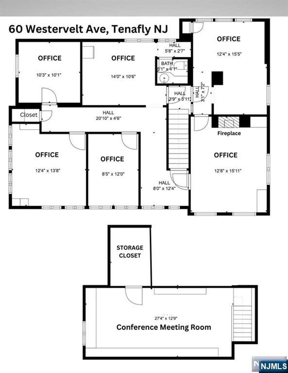 Beautifully updated, professional office space in a well-maintained building, ideally situated in a highly convenient location in desirable Tenafly. This unique and sun-filled suite offers approximately 1,200 sq. ft. and features six updated private offices, each with large windows, high ceilings, and central air. One standout office is truly exceptional, showcasing dramatic cathedral ceilings and a striking floor-to-ceiling brick fireplaceâ€â€adding warmth and character rarely found in office settings. As an added bonus, the expansive third floor includes two large conference/meeting rooms, complete with built-in bookcases and shelving throughout, as well as a dedicated storage room. This impressive second and third floor space also includes a private powder room and a convenient kitchenette area. The property offers designated parking spaces along with ample street parking. Ideally located just moments from bus service, Englewood Hospital, and Tenafly’s vibrant downtown shopping and dining districtâ€â€and only minutes to NYCâ€â€this is a rare opportunity to elevate your business in a prime location. **SEE FLOOR PLAN IN PHOTOS**