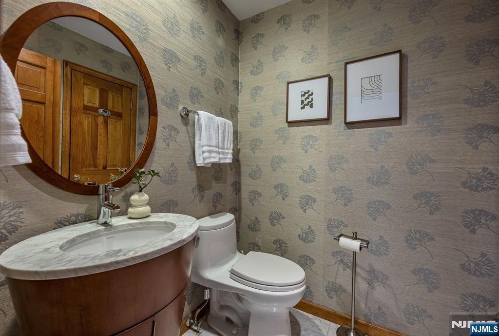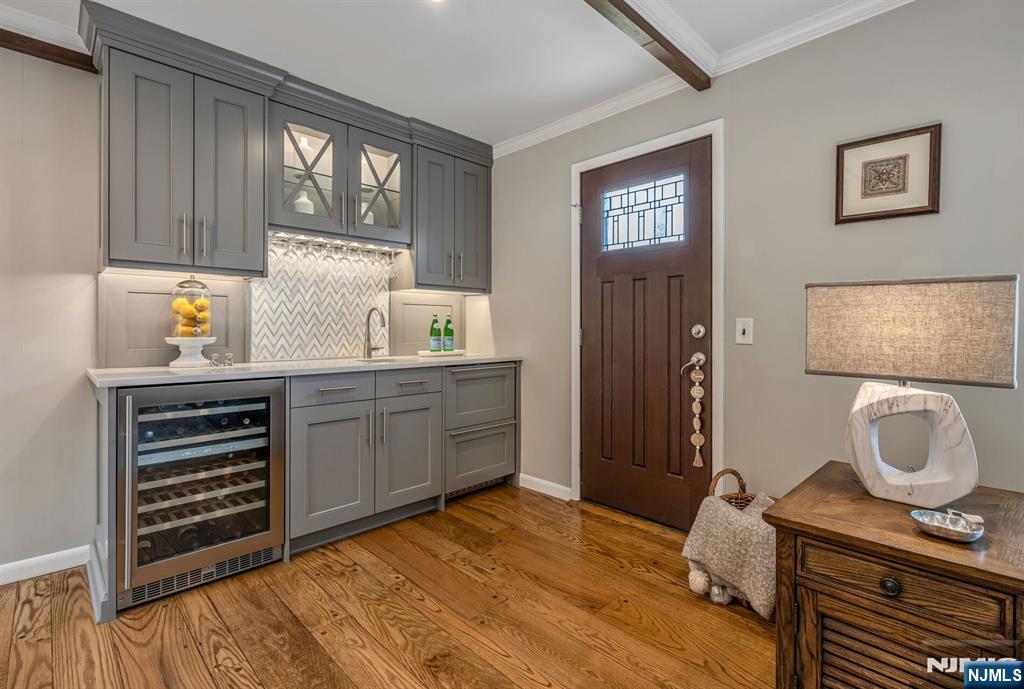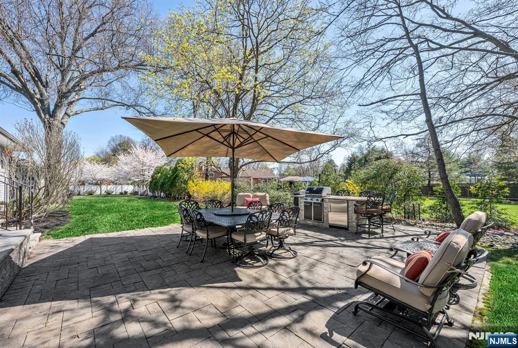 Located in Oradell's sought-after Blauvelt section, this beautifully updated home offers exceptional curb appeal and thoughtfully designed living spaces. A sunlit foyer with skylights creates a warm welcome, leading to an elegant living room with a fireplace and a seamless flow into the formal dining room. At the heart of the home, the custom kitchen features premium Wolf, Sub-Zero, and Bosch appliances, high-end finishes, and soaring ceilings filled with natural light. It opens to a stunning family room with exposed beams and a built-in wet bar--perfect for relaxing or entertaining. The main level includes three spacious bedrooms, including a junior ensuite, plus a versatile bonus room with a powder room off the garage. Upstairs, the private primary suite serves as a true retreat, complete with a spa-like bath featuring radiant heated marble floors, a jetted tub with pearl finishes, oversized glass shower, heated towel rack, and a beautiful bay window. The lower level offers a recreation area and unfinished space ready for customization. Outside, enjoy a fully equipped outdoor kitchen, manicured landscaping, and elegant paver hardscaping. A rare opportunity in a prime location that you won't want to miss.