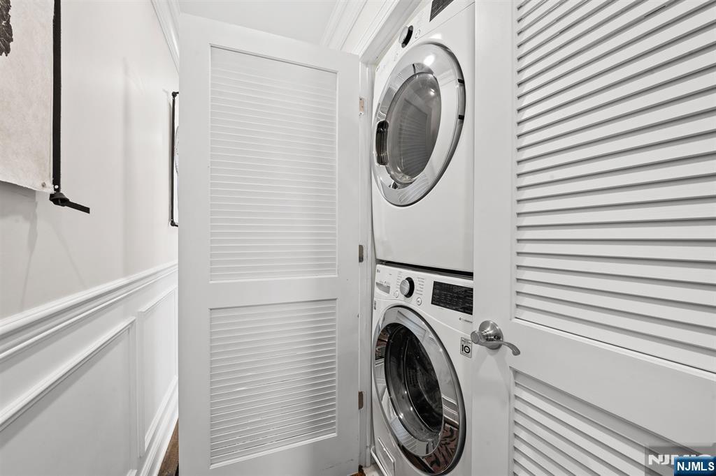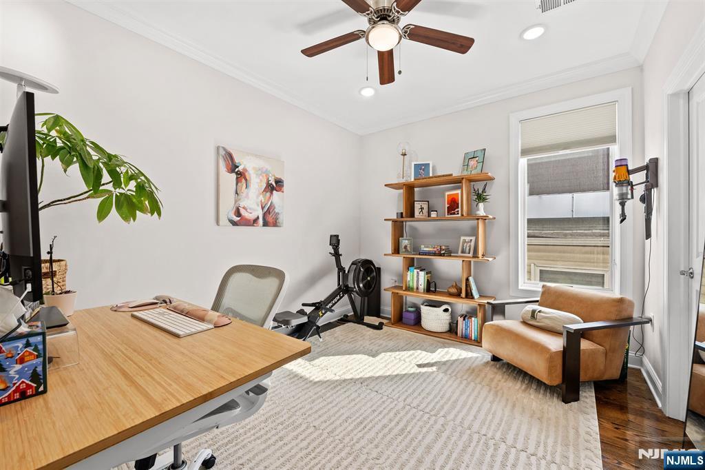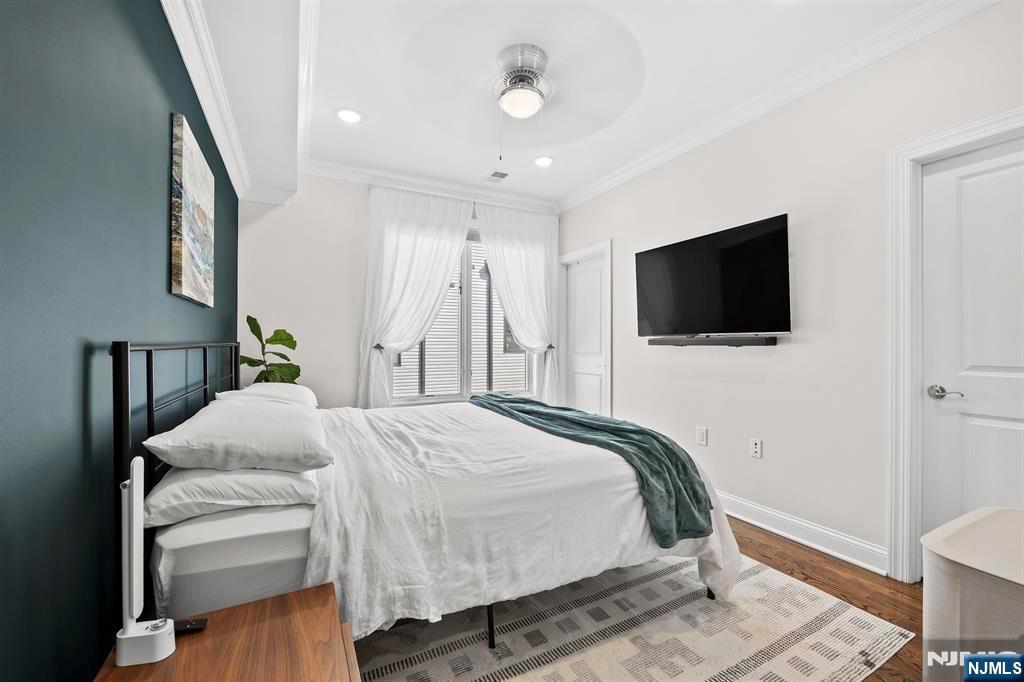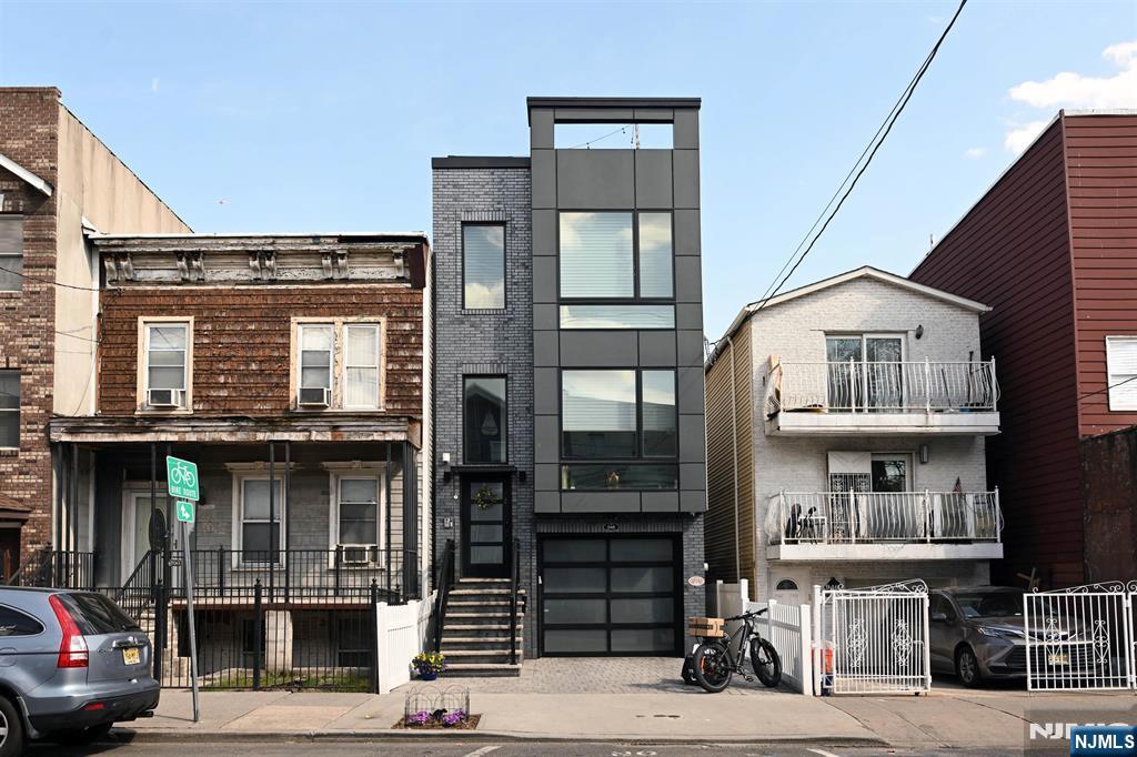This expansive and meticulously maintained 3-bedroom, 2-bathroom residence is flooded with natural light and offers a large private roof deck with panoramic NYC views. Oversized Pella windows enhance the bright, open feel, while thoughtful upgrades include central heating and A/C, a video intercom system, and built-in home theater speakers. The primary suite features a walk-in closet and a beautifully finished en-suite bathroom. Both bathrooms are outfitted with floor-to-ceiling Porcelanosa tile. The modern kitchen is designed with quartz countertops, a waterfall island, Oxford latte white cabinetry, and LG black stainless-steel appliances. Additional highlights include hardwood floors, wainscoting throughout, recessed lighting, and generous closet space, including a walk-in closet in the second bedroom and a storage closet on the rooftop. This home also includes a deeded tandem parking spot along with two large bonus storage closets in the garage. Ideally located in the heart of Jersey City Heights, with easy access to shops and restaurants and a bus stop right down the street allowing for convenient access to NYC and PATH train.