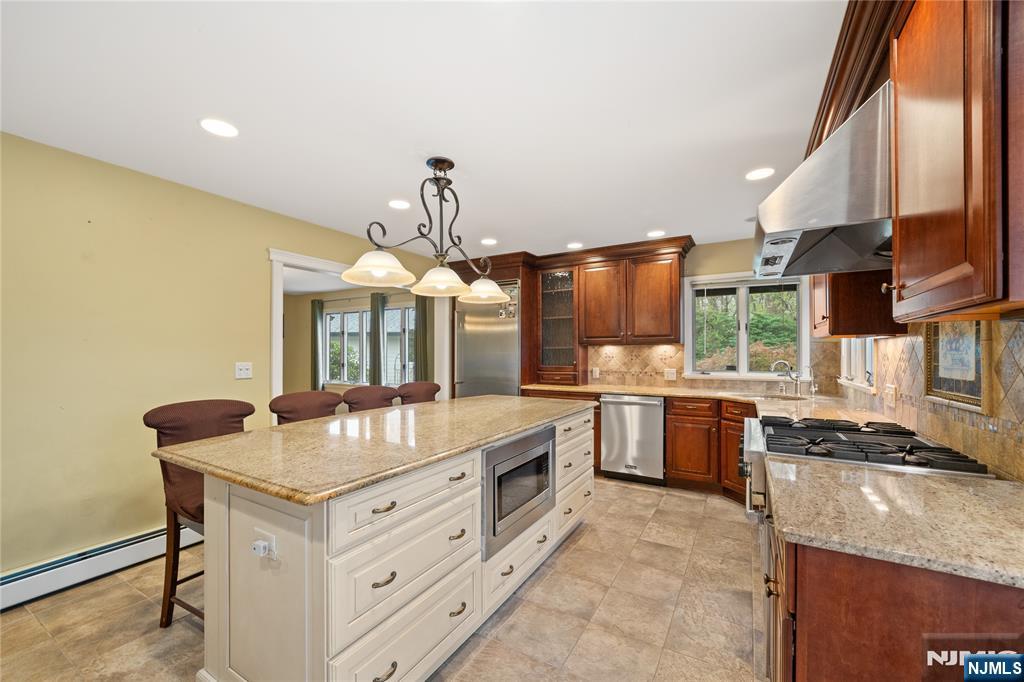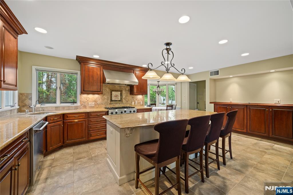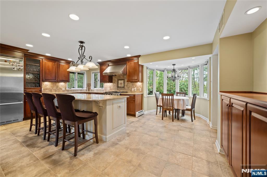 Step into a custom-built home that blends everyday comfort with standout design. A dramatic two-story foyer welcomes you, highlighted by a sweeping staircase that creates an immediate sense of elegance. The formal living room features a soaring cathedral ceiling with exposed wood beams and an original brass fireplace, adding warmth and timeless character. A formal dining room provides the perfect setting for gatherings and special occasions.At the heart of the home is a renovated eat-in kitchen with cherry wood cabinetry, Viking stainless steel appliances, granite countertops, and a large center island with a breakfast bar. A separate dining area overlooks the backyard, filling the space with natural light. Each bedroom is designed as a private suite with its own full bathroom, offering comfort and privacy.Upstairs, the main primary suite includes a walk-in closet with custom built-ins and a spacious bath. A loft area offers flexibility for a home office or lounge. The finished basement features a kitchenette, full bath, media room, laundry, and a separate entrance. A wide driveway leads to a two-car garage. The backyard offers private outdoor space with patios and mature landscaping, perfect for relaxing or entertaining.