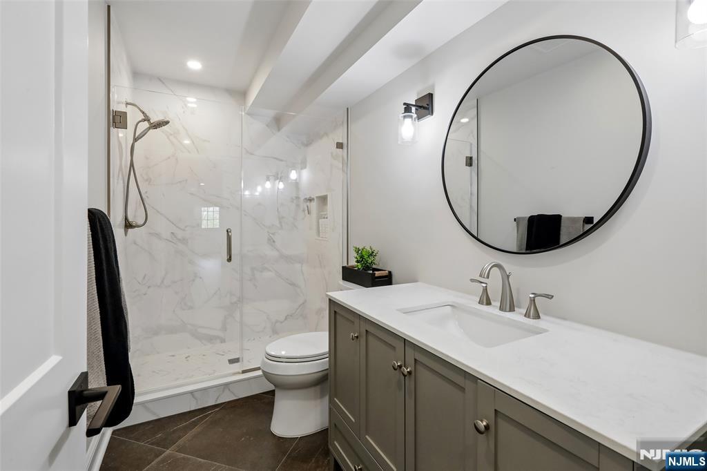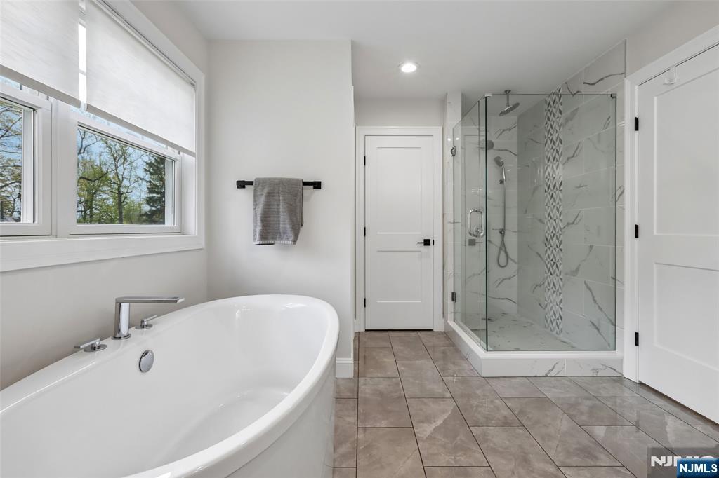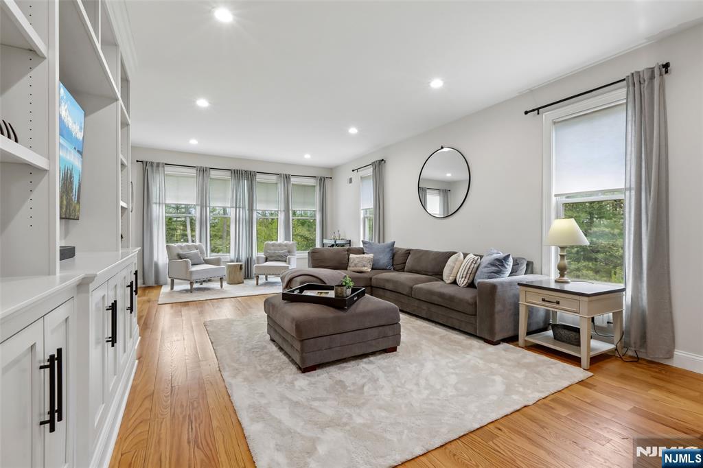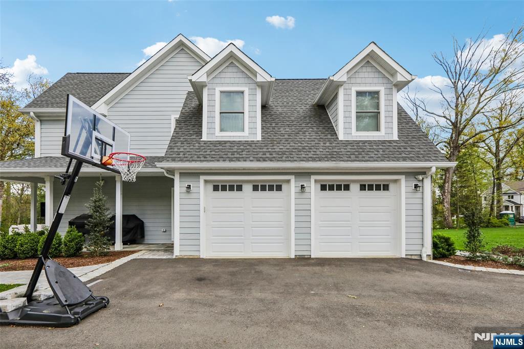 Custom-built on a new foundation in 2022, this refined Modern Farmhouse Colonial embodies contemporary luxury. Set on an expansive 0.9-acre lot near downtown Wyckoff, this thoughtfully designed residence offers approximately 4,000 sqft of living space plus an additional ~1,500 sqft in the expansive finished basement. The exterior beams with curb-appeal, showcasing Hardie board siding, shingle accents, a welcoming front porch, new landscaping, and a backyard bluestone porch and paver patios overlooking serene wooded surroundings. Inside, a grand two-story foyer opens to a sun-filled great room with a dramatic floor-to-ceiling stone fireplace and seamless flow into a gourmet chef’s kitchen with an oversized island, dining area, and pantry. Completing the main level are a living room with built-ins, a private office or playroom, a powder room, and a mudroom. Upstairs, the luxurious primary suite offers a spa-like bath with dual vanities, soaking tub, glass-enclosed shower, linen storage, and a generous walk-in closet. Three additional bedrooms include one with an ensuite bath, plus a full hall bath and second-floor laundry. The finished lower level features a gym, recreation area, and bonus space with an adjacent full bath. Additional highlights include high ceilings throughout, a two-car attached garage, new multi-zone HVAC, and radiant heated floors in the kitchen, great room, and living room - all just minutes from schools, shopping, and more.