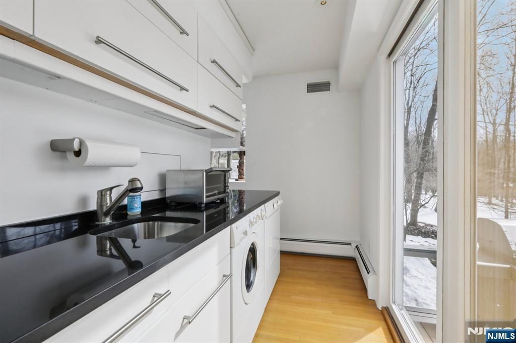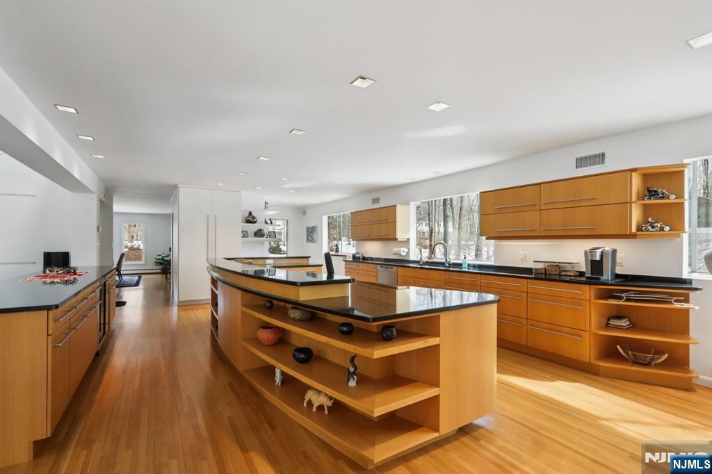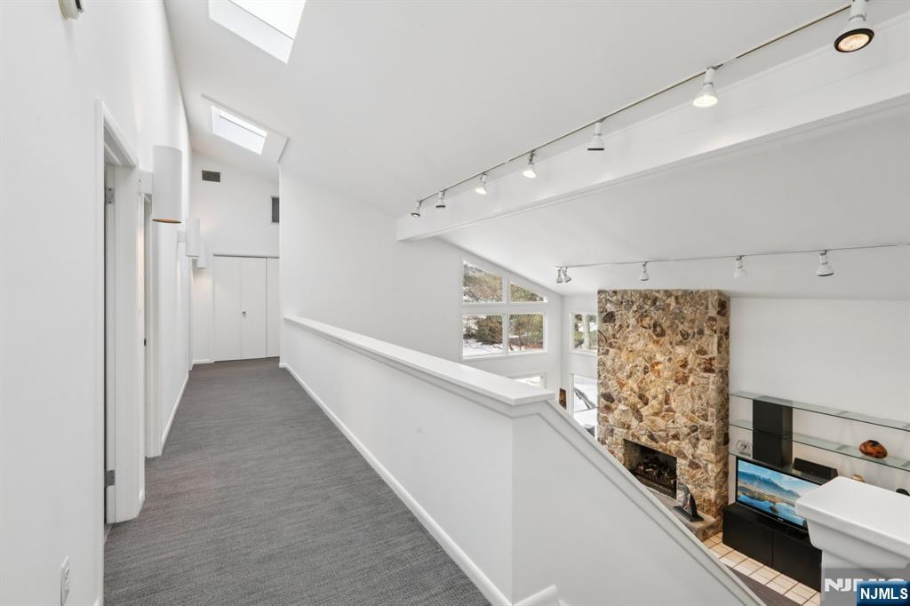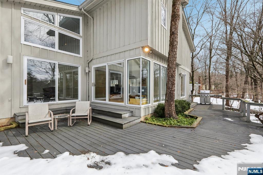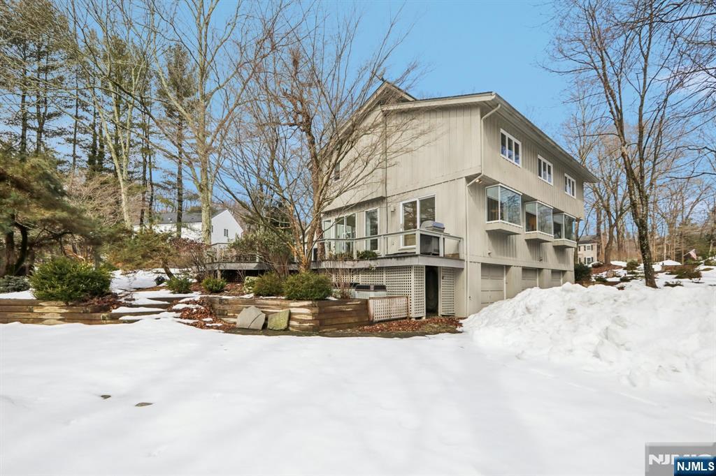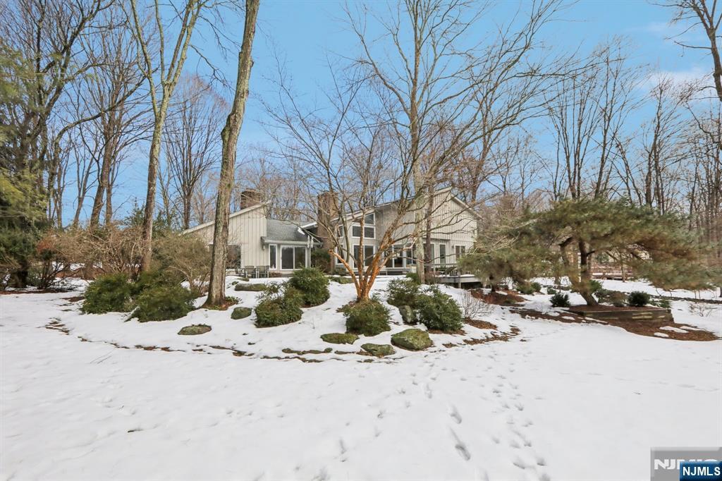 Set in a premier Upper Saddle River location, this custom home offers exceptional craftsmanship, comfort, and timeless appeal. Cathedral ceilings, large sun-filled windows, and elegant custom details create a warm yet sophisticated atmosphere throughout. The custom kitchen features oak cabinetry, an induction cooktop, Sub-Zero refrigerator, KitchenAid microwave/oven, built-in breakfast nook, and adjoining laundry/mudroom. Multiple sliding glass doors lead to an expansive deck and serene koi pond, creating an effortless indoor-outdoor flow for entertaining. The first-floor primary suite includes a beautifully appointed bath with double vanities and an oversized dual-outlet shower. Additional highlights include a three-floor elevator, three fireplaces, custom built-ins, and an integrated entertainment center. Upstairs, a library with built-in bookshelves and a dedicated office with custom workstations add charm and functionality. A full unfinished basement with built-in workbench, second washer/dryer, and a three-car garage complete this distinctive offering. Designed for both elegant entertaining and everyday ease, this is a home that feels as remarkable as it looks; warm, refined, and ready to be experienced in person.