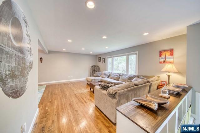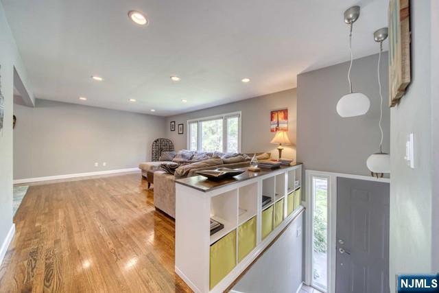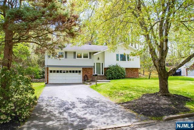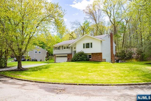 Welcome to this beautiful bi-level home located in a quiet cul-de-sac. Ideal open floor concept with spacious living room and dining room. Modern eat-in kitchen with vaulted ceilings and skylight. Hardwood floors throughout. Large primary bedroom with direct access to full bathroom. Two more bedrooms complement the main floor. Lower level offers a spacious family room with a wood burning fireplace. An additional bedroom can be used as an office or for guests. A 1/2 bath and ample closet space with laundry hook-up complete this level. Sliding doors lead to a spacious backyard with patio. 2 car garage adds additional room for storage. Other amenities include central air, hardwood floors, recessed lighting, and in-ground sprinklers. Close to NYC transportation, schools, shops, and restaurants. Tenant responsible for snow removal and all utilities. Grass maintenance included. Must see!!