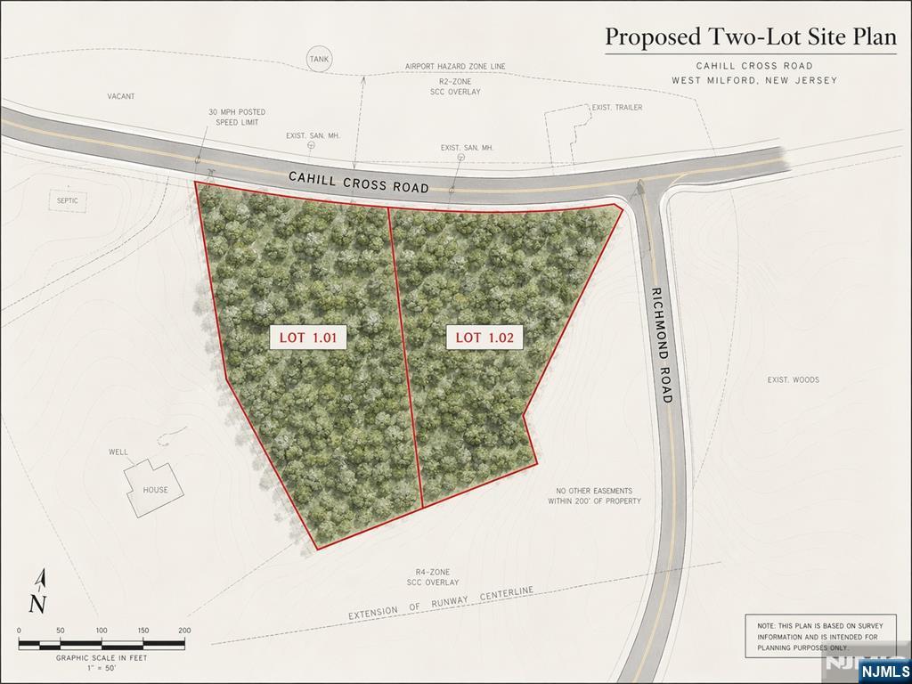 Rare West Milford land opportunity featuring Block 5309, Lots 1.01 & 1.02. Prior site plan materials reflect the potential for two custom single-family homes, each with its own private driveway, making this a standout opportunity for builders, developers, investors, or end-users. Site plans show the proposed placement of each home and the overall subdivision layout for the two lots. Prior plans reference public water and sewer availability, and the site plan notes the property is not in wetlands, transition area, flood plain, or flood fringe. Lots will require clearing, grading, and site improvements. Conceptual renderings are available for illustrative purposes only. Buyer to independently verify current zoning, approvals, utilities, permitted use, and buildability with the Township of West Milford