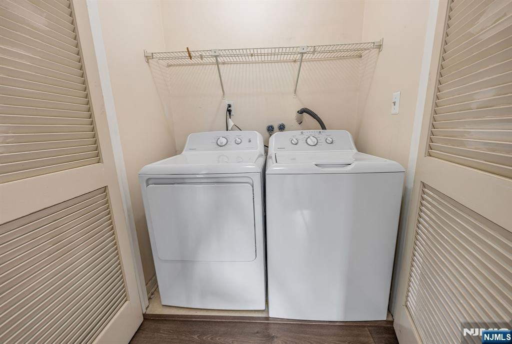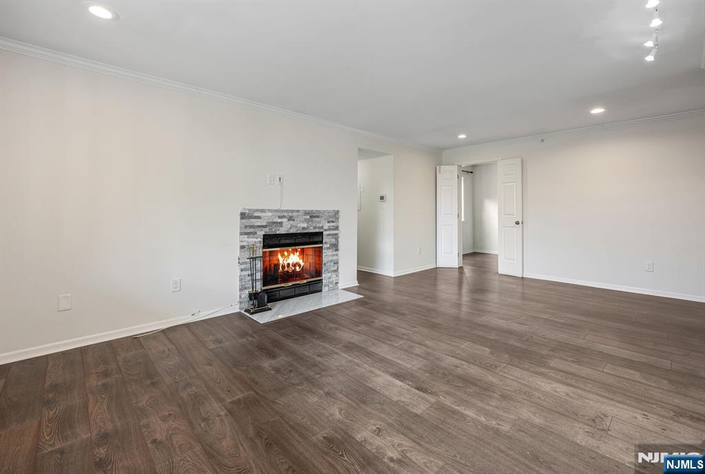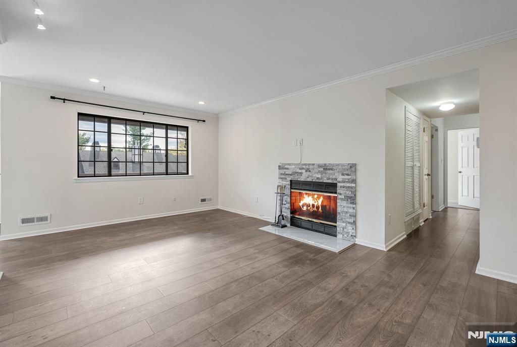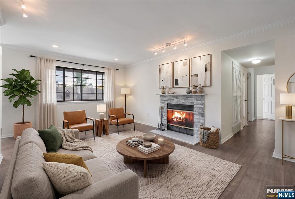 Bright and beautifully maintained, this spacious 2-plus bedroom, 2 full bath condo is set in the desirable Ridge Gardens community. Sunlight pours into the open living and dining areas, highlighted by newer flooring and a cozy gas fireplace with a modern stone surround. A private terrace offers a peaceful space to unwind and enjoy the tree-lined view. This model has an excellent layout with a versatile den, providing the flexibility for working from home, additional living space or even a 3rd bedroom. The primary suite features a custom walk-in closet and an updated en-suite bath. Both bedrooms have newer, neutral wall-to-wall carpet. A 2nd updated full bath completes the living space. A standout feature is the private one-car garage. Two ground-level storage bins offer ample extra space. Additional features include in-unit laundry with a new washer and dryer and new HVAC system (2024). With abundant natural light and thoughtful updates throughout, this home is move-in ready and not to be missed. Residents enjoy access to amenities including a pool, tennis, and pickleball courts. Ideally located just minutes from Ramapo Reservation, Campgaw skiing, and Darlington County Park for a great lifestyle!