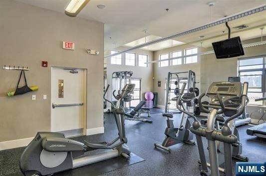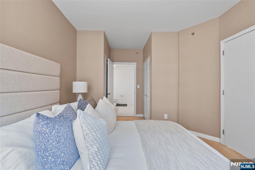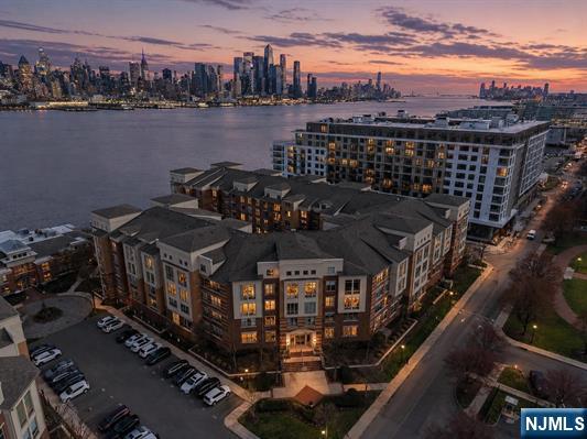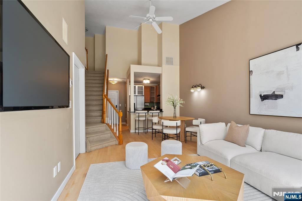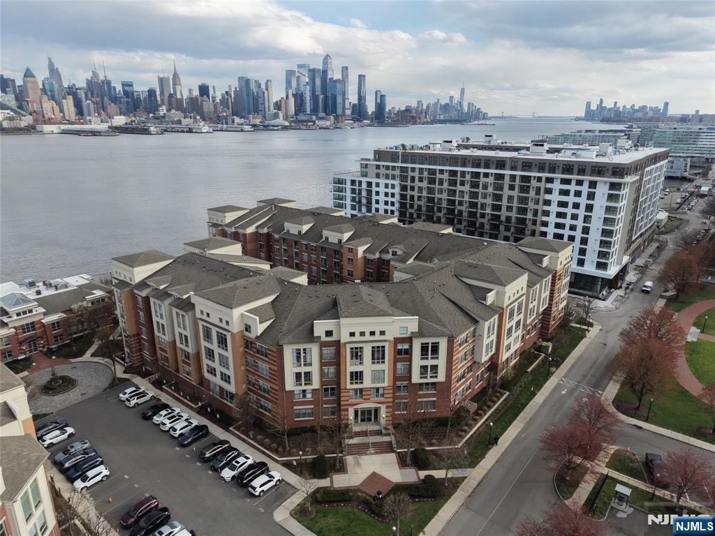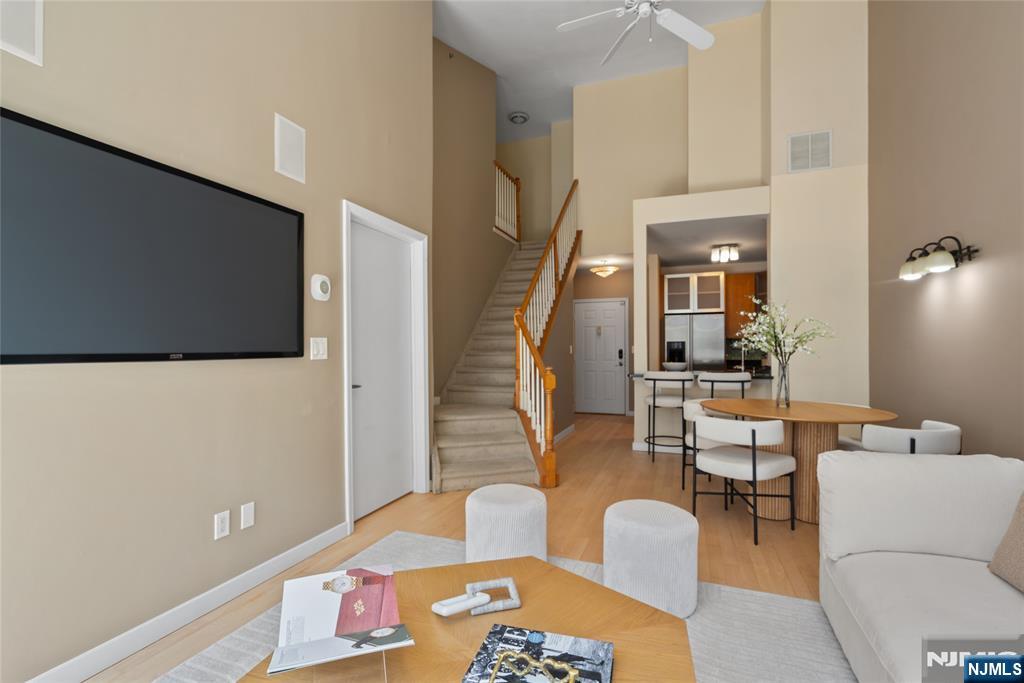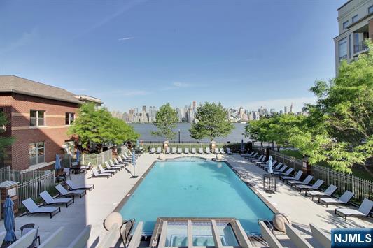 South-facing and filled with natural sunlight, this beautifully designed 2 Bedroom / 2 Bathroom duplex offers a premier lifestyle in the highly sought-after Hudson Club. Spanning 1,121 sq. ft., this bright and airy home features an open-concept kitchen with stainless steel appliances, granite countertops, and floor-to-ceiling windows that capture partial views of the NYC skyline and the Hudson River. The main level boasts soaring vaulted ceilings and a functional layout including an in-unit washer/dryer, along with a generously sized bedroom that connects to a full bath and offers ample closet space. The upper level serves as a private retreat, featuring a spacious primary bedroom with a large walk-in closet and a private en-suite bathroom. The versatile upstairs den adds incredible flexibility to the floor plan, serving as the perfect dedicated home office, guest space, or additional storage area. One assigned parking space is included with the home for your convenience. The monthly maintenance fee provides exceptional value by covering gas, water, sewer, parking, cable, and high-speed internet. Residents also enjoy access to a full suite of luxury amenities, including a 24-hour concierge, a swimming pool with a jacuzzi, a fitness center, a basketball court, a theater room, a business center, a resident lounge, and an outdoor fire pit. This unbeatable location on New Jersey’s Gold Coast offers easy access to NYC via ferry and bus, with shopping and dining favorites.