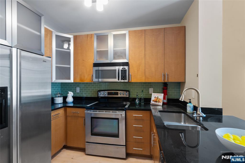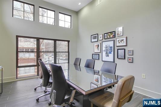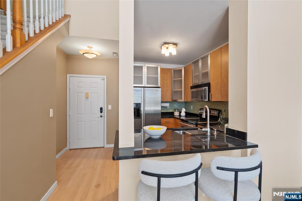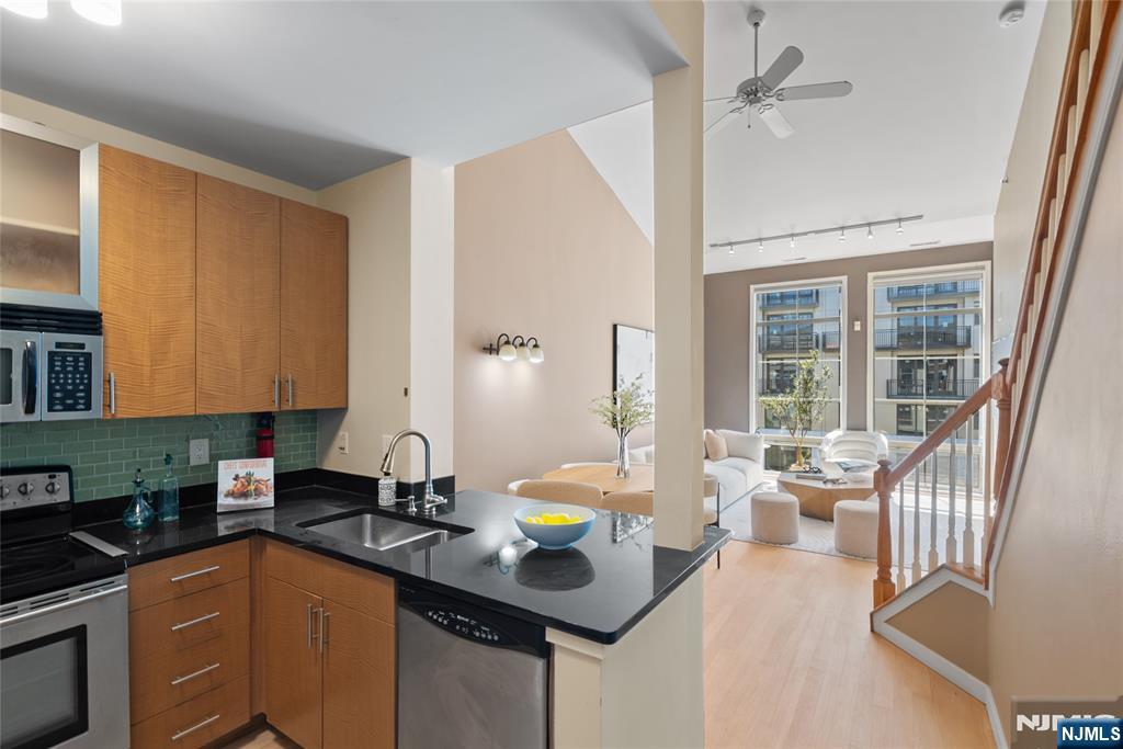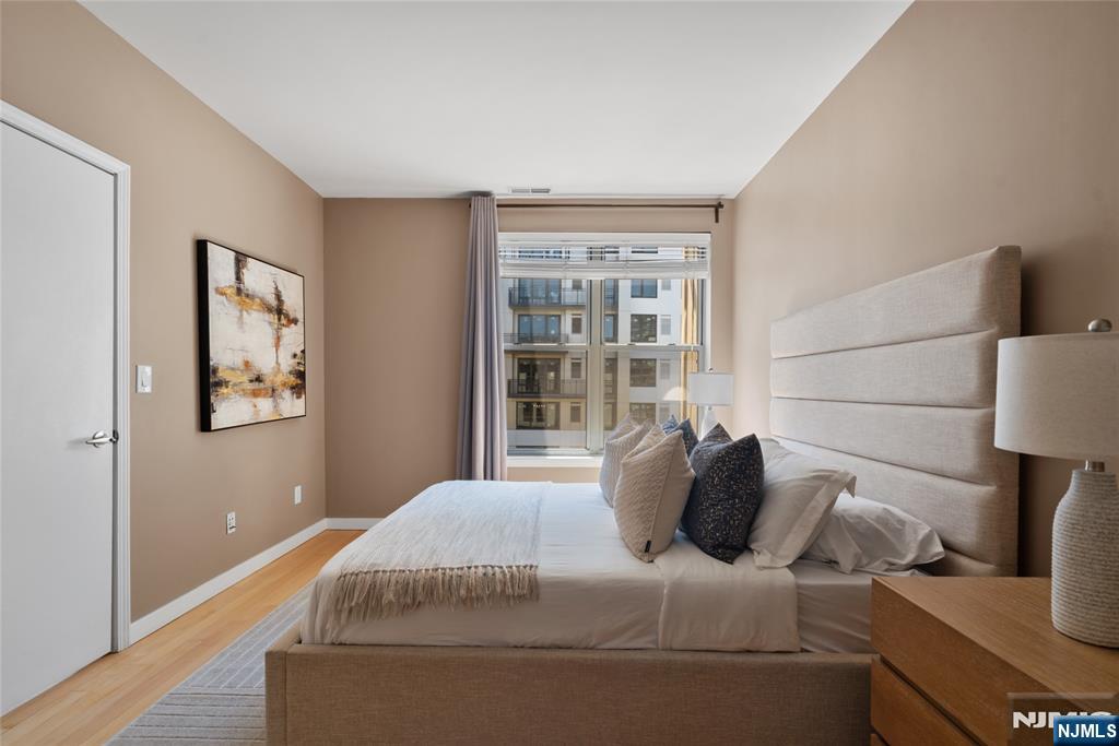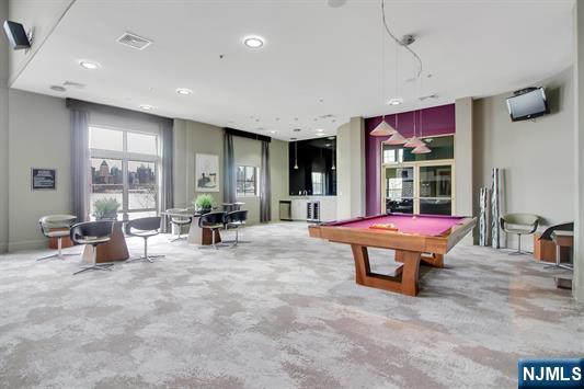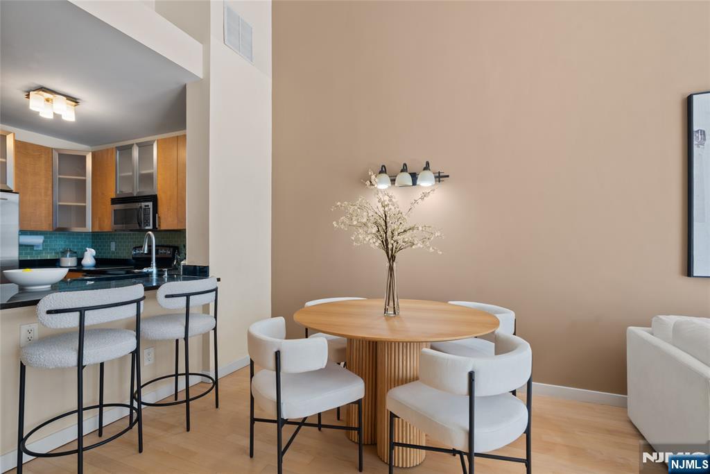 South-facing and filled with natural sunlight, this beautifully designed 2 Bedroom / 2 Bathroom duplex offers a premier lifestyle in the highly sought-after Hudson Club. Spanning 1,121 sq. ft., this bright and airy home features an open-concept kitchen with stainless steel appliances, granite countertops, and floor-to-ceiling windows that capture partial views of the NYC skyline and the Hudson River. The main level boasts soaring vaulted ceilings and a functional layout including an in-unit washer/dryer, along with a generously sized bedroom that connects to a full bath and offers ample closet space. The upper level serves as a private retreat, featuring a spacious primary bedroom with a large walk-in closet and a private en-suite bathroom. The versatile upstairs den adds incredible flexibility to the floor plan, serving as the perfect dedicated home office, guest space, or additional storage area. One assigned parking space is included with the home for your convenience. The monthly maintenance fee provides exceptional value by covering gas, water, sewer, parking, cable, and high-speed internet. Residents also enjoy access to a full suite of luxury amenities, including a 24-hour concierge, a swimming pool with a jacuzzi, a fitness center, a basketball court, a theater room, a business center, a resident lounge, and an outdoor fire pit. This unbeatable location on New Jersey’s Gold Coast offers easy access to NYC via ferry and bus, with shopping and dining favorites.