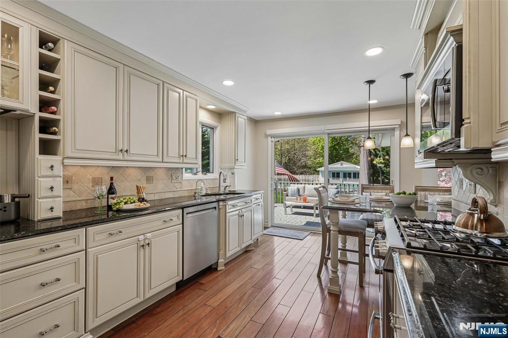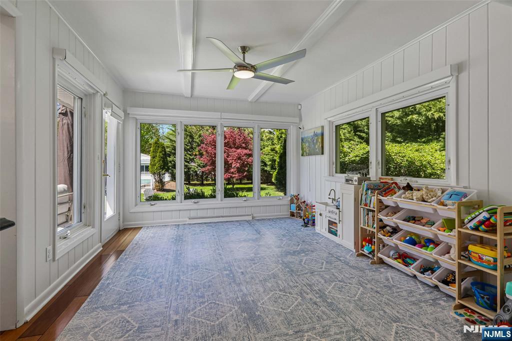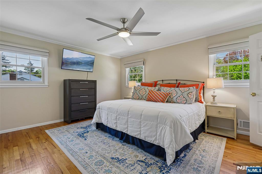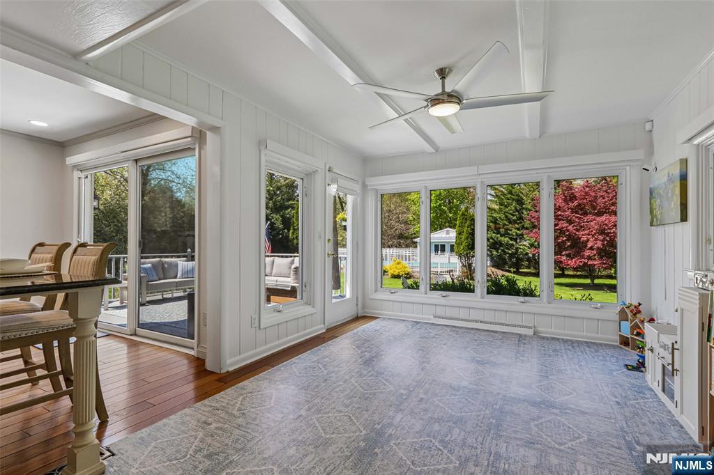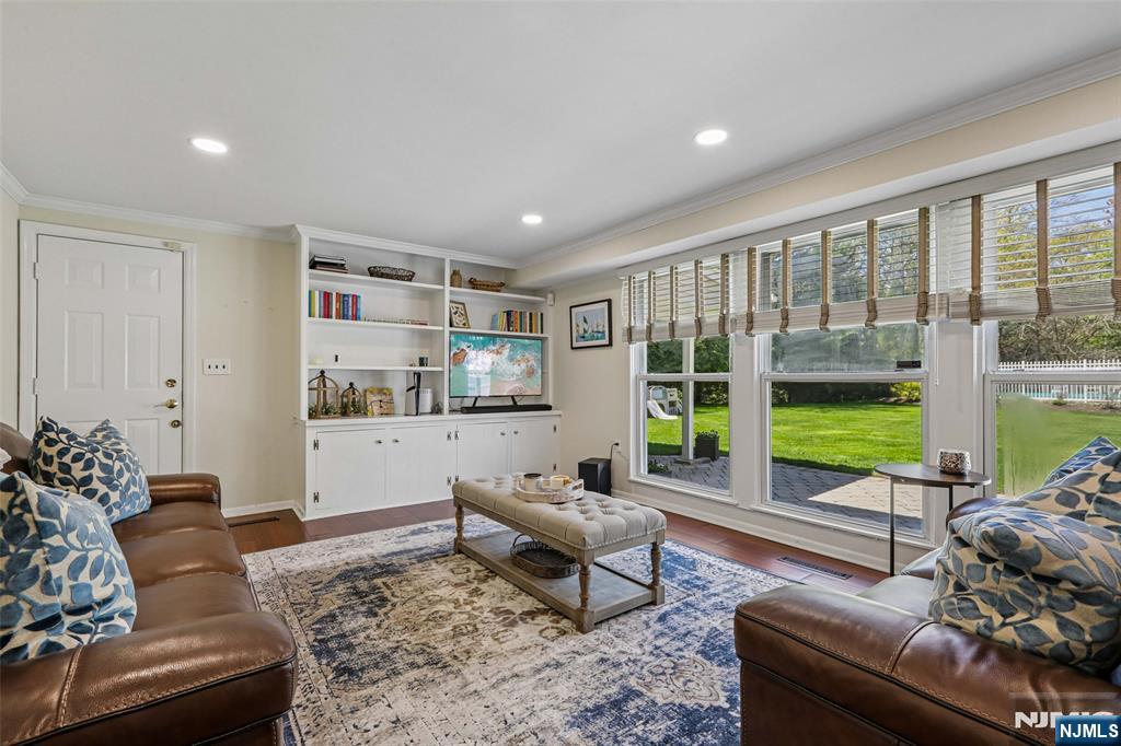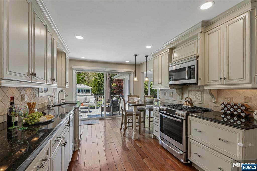 Welcome to your private suburban oasis in Wyckoff’s Meer Estates! Designed for both entertaining and everyday luxury, this 4-bedroom, 2.5-bath residence is positioned on a lush, level half-acre with a fenced backyard boasting a heated pool, a chic updated cabana, an expansive deck, and a covered patio. The welcoming foyer opens to a sun-drenched family room with walls of windows and a wide staircase ascending to a natural light-filled main level, beginning with a vaulted ceiling living room with skylights and an oversized bay window. The formal dining room flows into a sun-filled solarium, while the modern eat-in kitchen is equipped with granite counters, peninsula seating, and sliding glass doors to the deck. The upper level features a primary ensuite and two additional freshly painted bedrooms, complemented by an updated bath. Added value abounds with a ground floor bedroom off the family room, newly finished basement gym (2023), reverse osmosis water filtration, and recent pool upgrades including a 2024 filter and 2022 cover. Set in a prime location near top-tier Wyckoff schools and just blocks from the NYC-bound bus, this home is the ultimate suburban retreat.